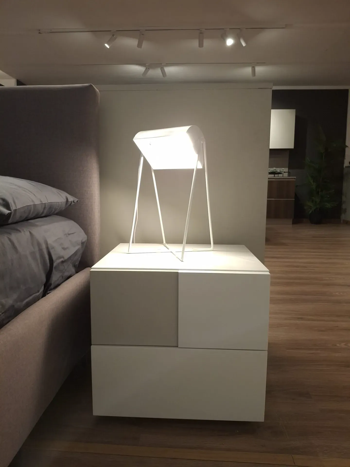 Gruppo letto composto da comò mod. Jean in finitura laccato opaco bianco neve da L 128 cm H 79 cm, P 55 CM e n. 2 comodini mod. Jean in medesima finitura e inserto grigio dorian da L 52 cm H 47 cm P 46 cm.