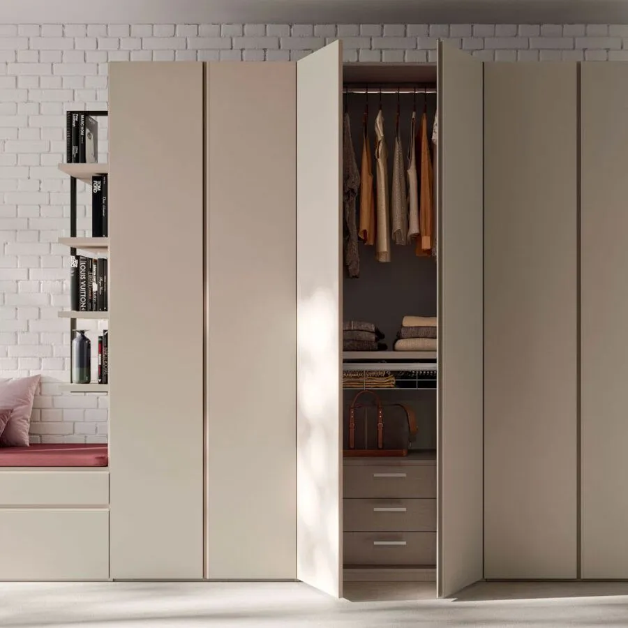 Camera completa Composta da 2 comodini l53x38x42 1 settimanale 6 cassetti l53xh 103x 42 letto 160x200 con rete a doghe materasso ortopedico dimensione armadio L 5025 × H 2578 P D 620 mm colori modificabili finiture Letto in melaminico Tortora con pannelli imbottiti in tessuto Jam S154, giroletto Iota con cuffia in tessuto Jam S154 e piede quadrato laccato Tortora, gruppo Filo in melaminico Tortora finitura armadio Melaminico Tortora, tessuto Jam S154, interno struttura Greyge