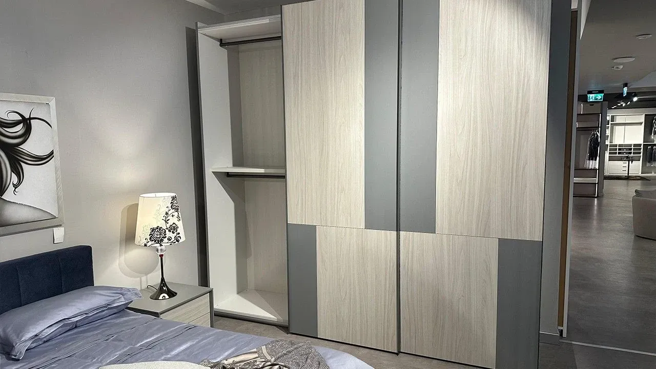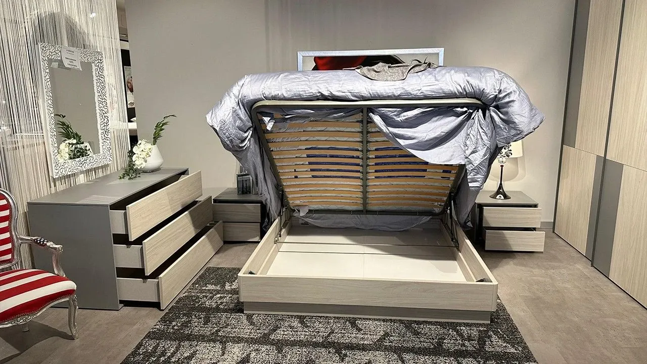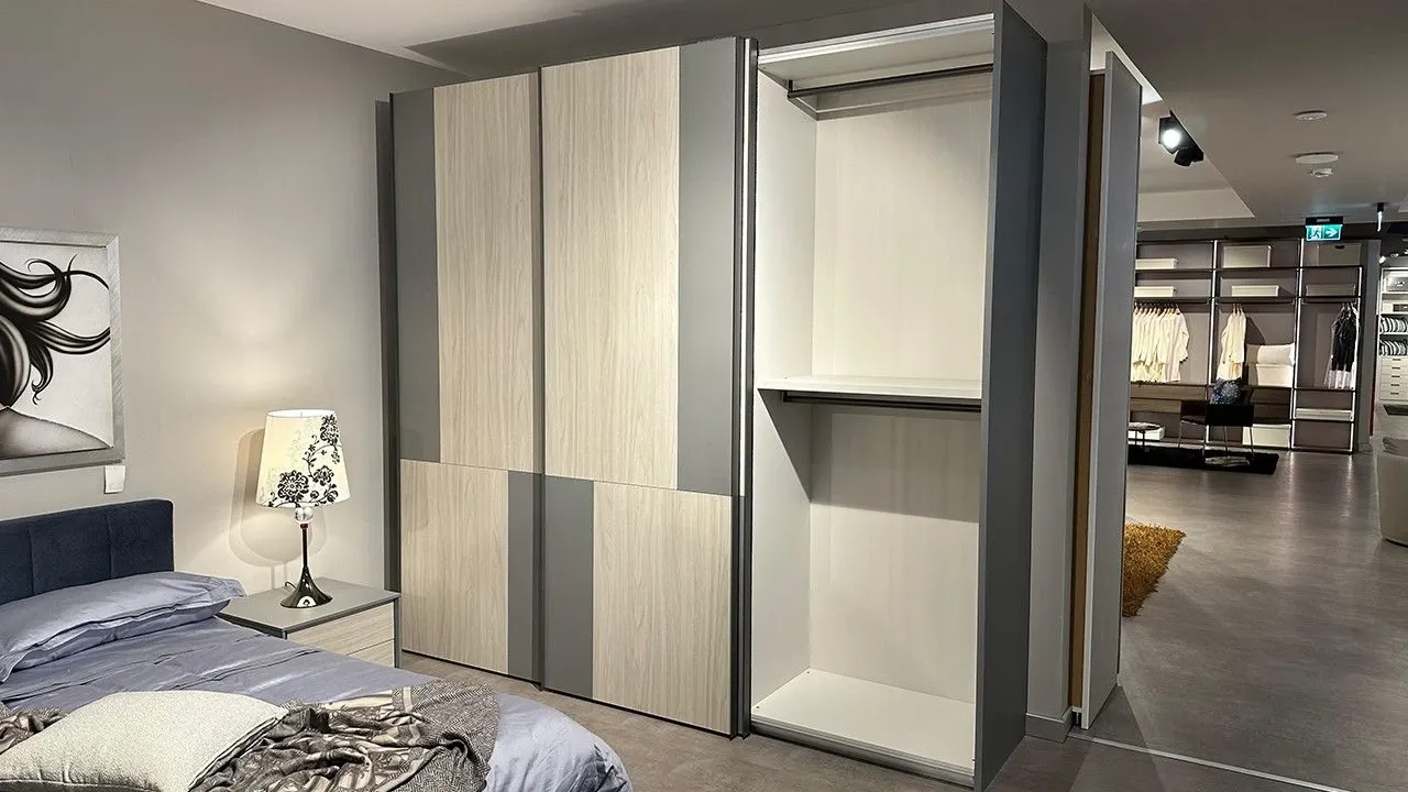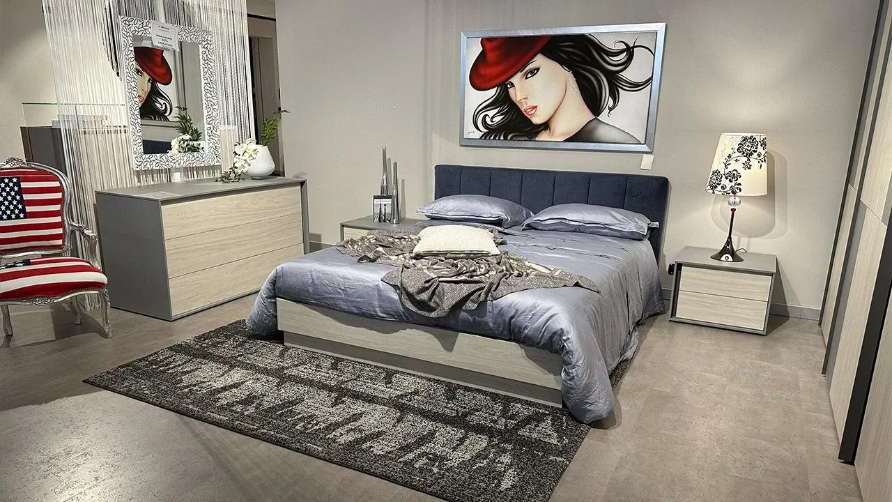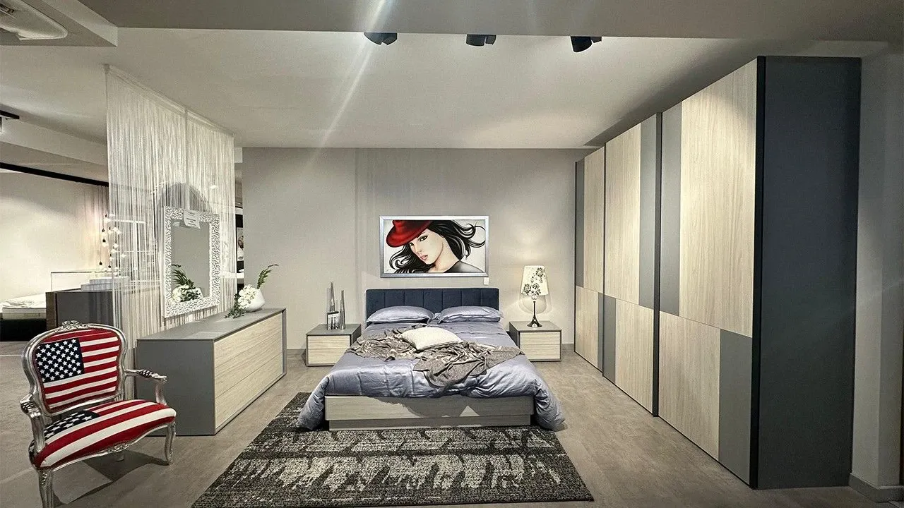 Camera moderna modello Global color cemento e frassino chiaro, con armadio scorrevole tre ante completo di cassettiera interna, comò 3 cassetti e 2 comodini due cassetti.