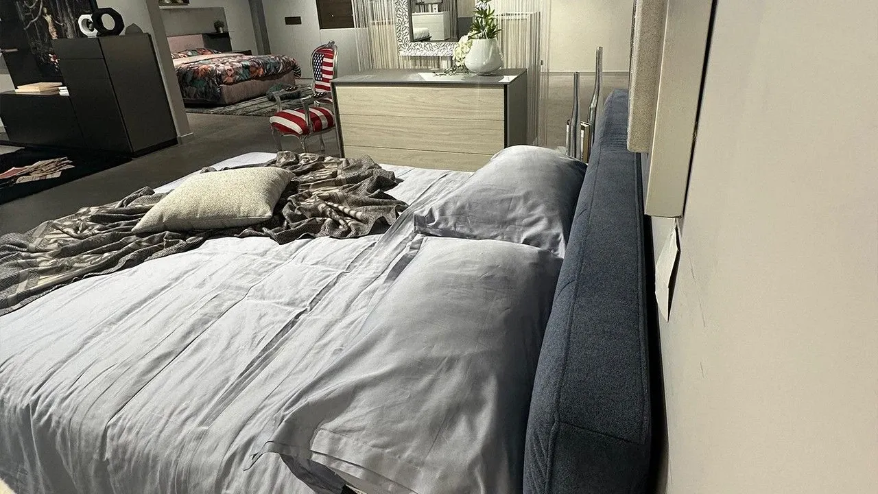 Coordinata di letto con contenitore e testata in tessuto blu.