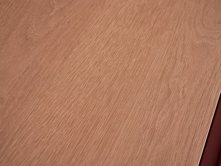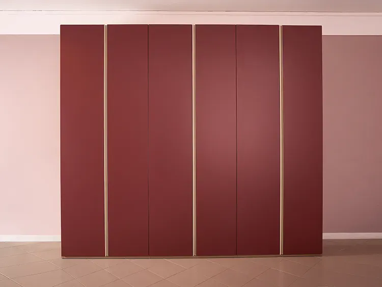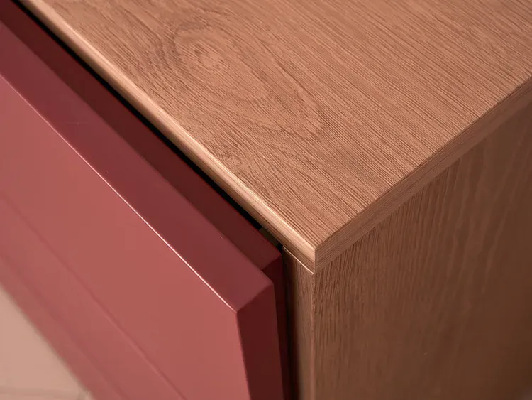 Anta con finitura laccato prugna all'acqua antigraffio , con profilo maniglia gola e finitura colore caldo chiaro.