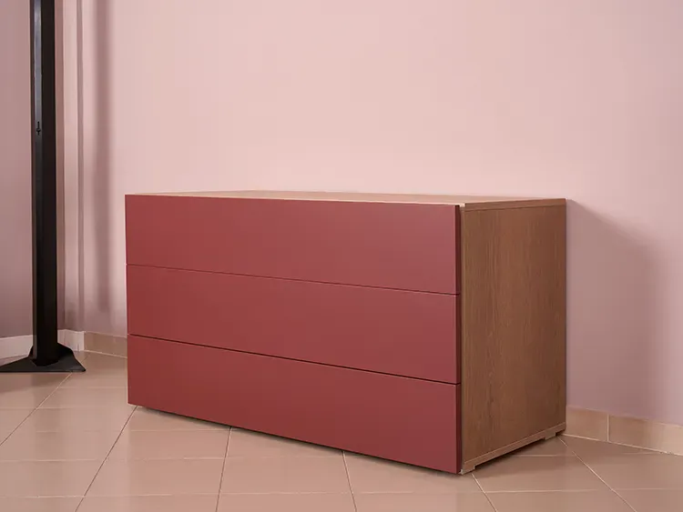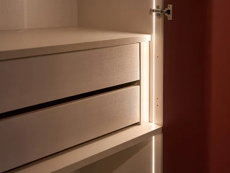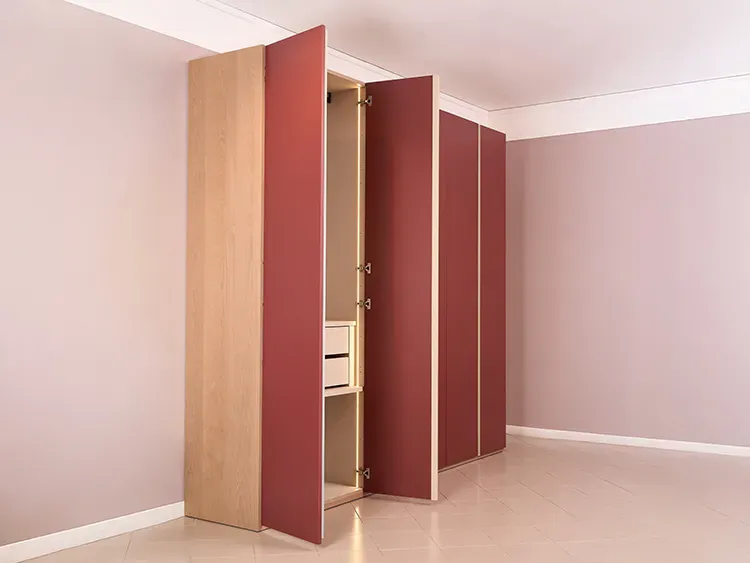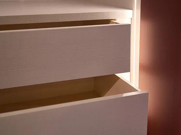 Attrezzatura interna armadio: 3 ripiani, 6 tubi appendiabiti e 2 cassettiere (con 2 cassetti) L95,6 cm