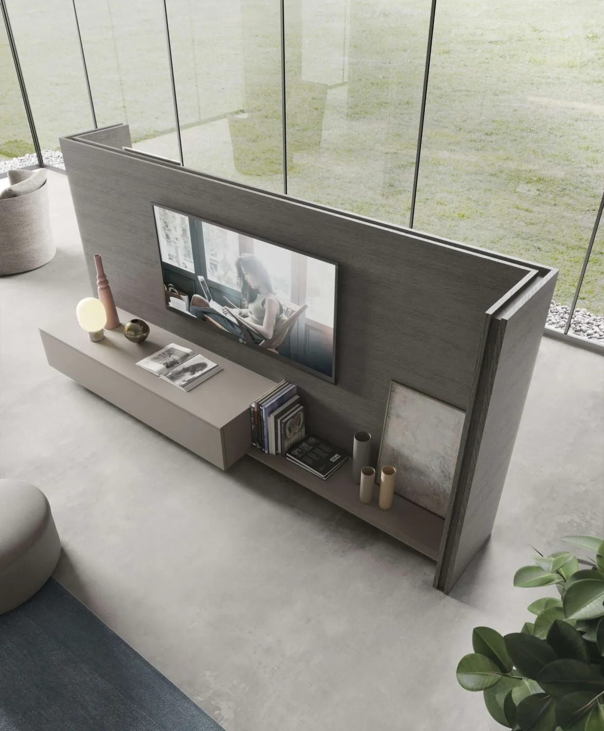 il mobile double-face con il vano per collocare la TV e il cassettone da un lato, mentre dall'altro lato un mobile