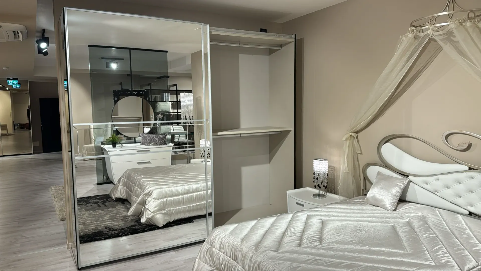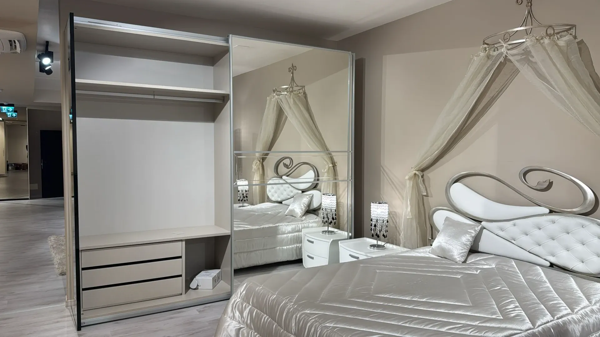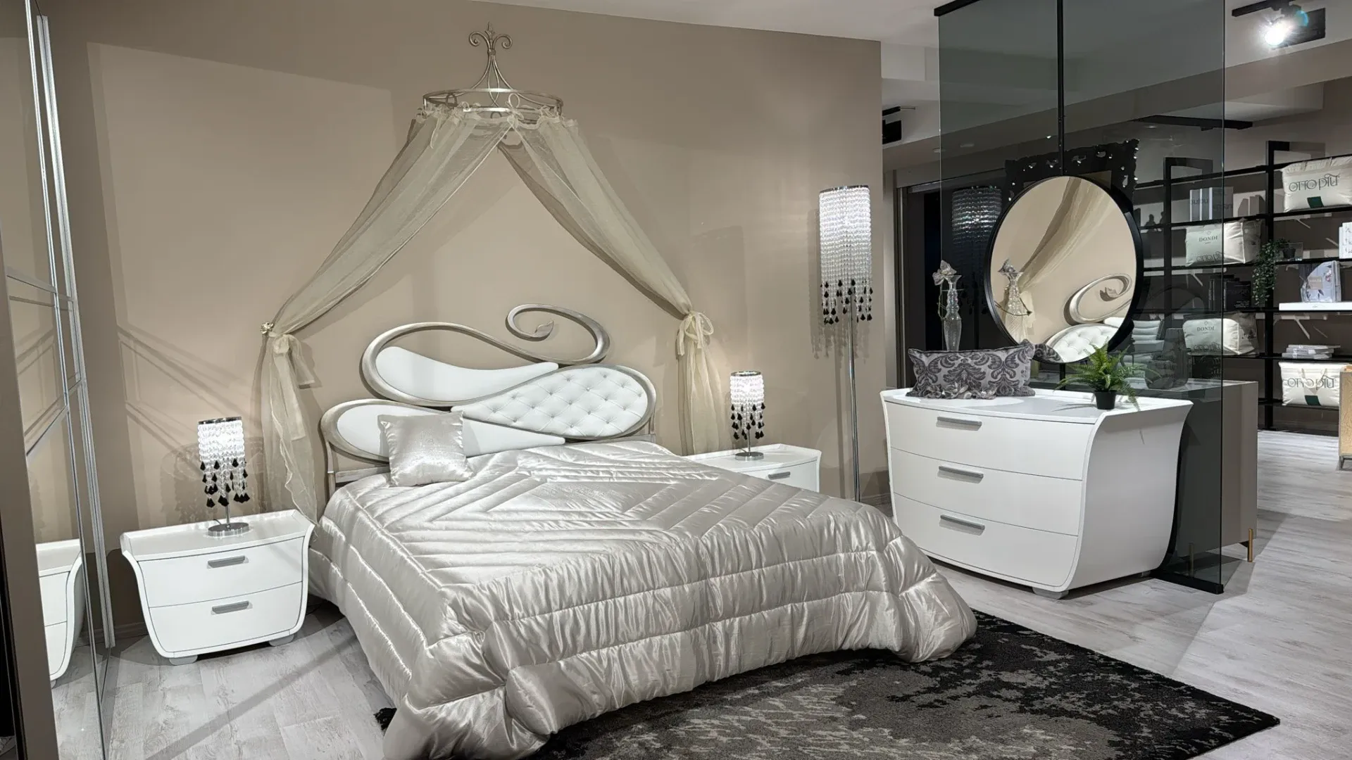 Camera da letto contemporanea con armadio tutto specchiato, completo di cassettiera interna, comò e comodini a vaso laccato opaco bianco, letto in ferro battuto finitura argento anticato con testiera imbottita rivestita in ecopelle color bianca con punti luce e specchiera tonda sul comò.