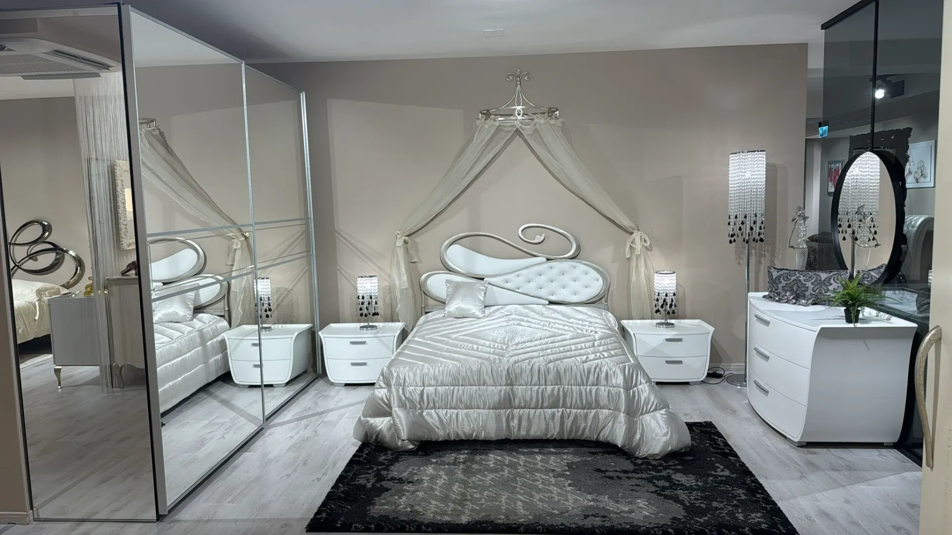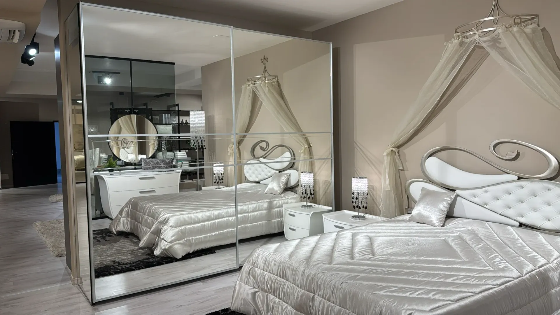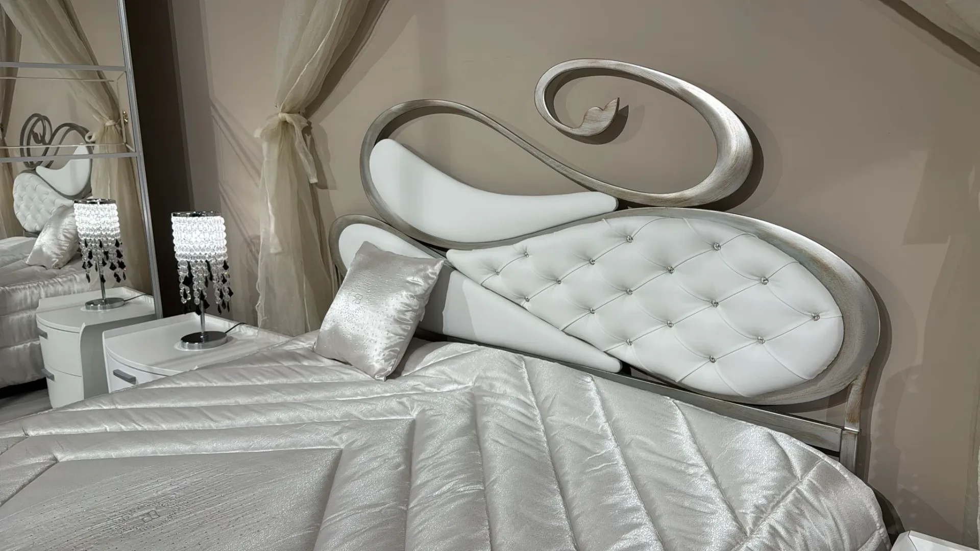 Camera da letto contemporanea con armadio tutto specchiato, completo di cassettiera interna, comò e comodini a vaso laccato opaco bianco, letto in ferro battuto finitura argento anticato con testiera imbottita rivestita in ecopelle color bianca con punti luce e specchiera tonda sul comò.