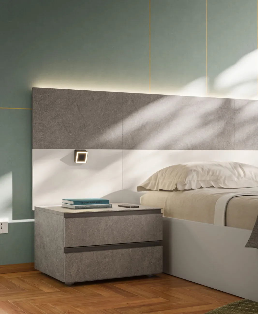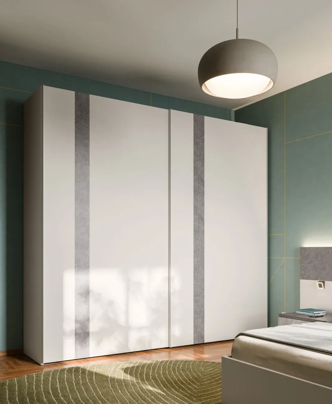 Sistema notte dal design contemporaneo che unisce eleganza e funzionalità. Le finiture in tonalità seta e roccia bolsena donano profondità e stile, per una zona notte moderna e di forte impatto.