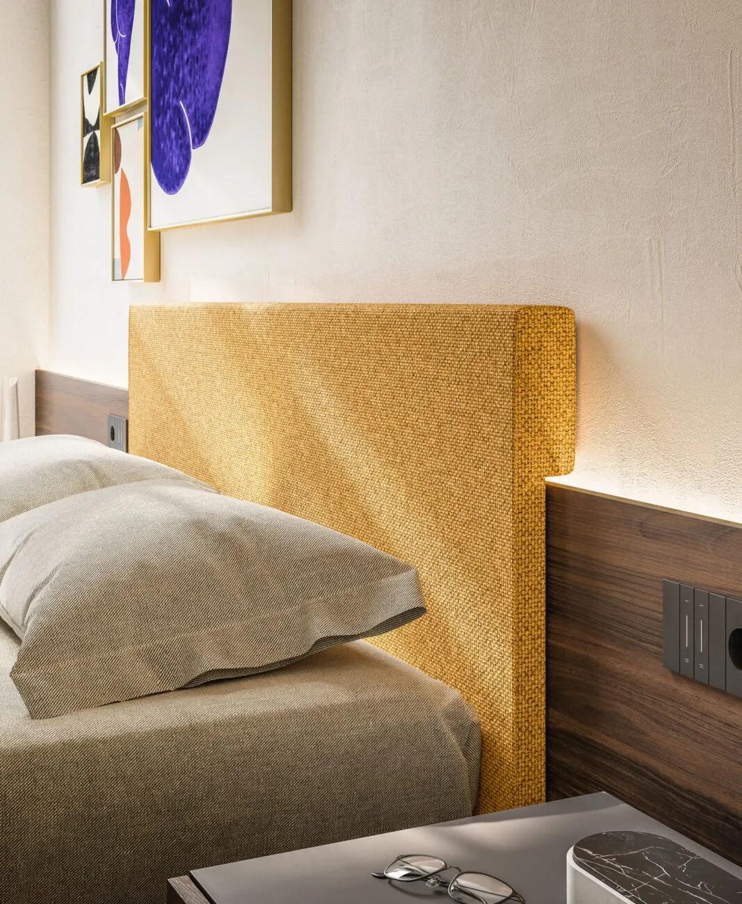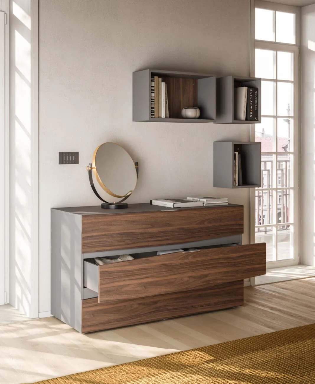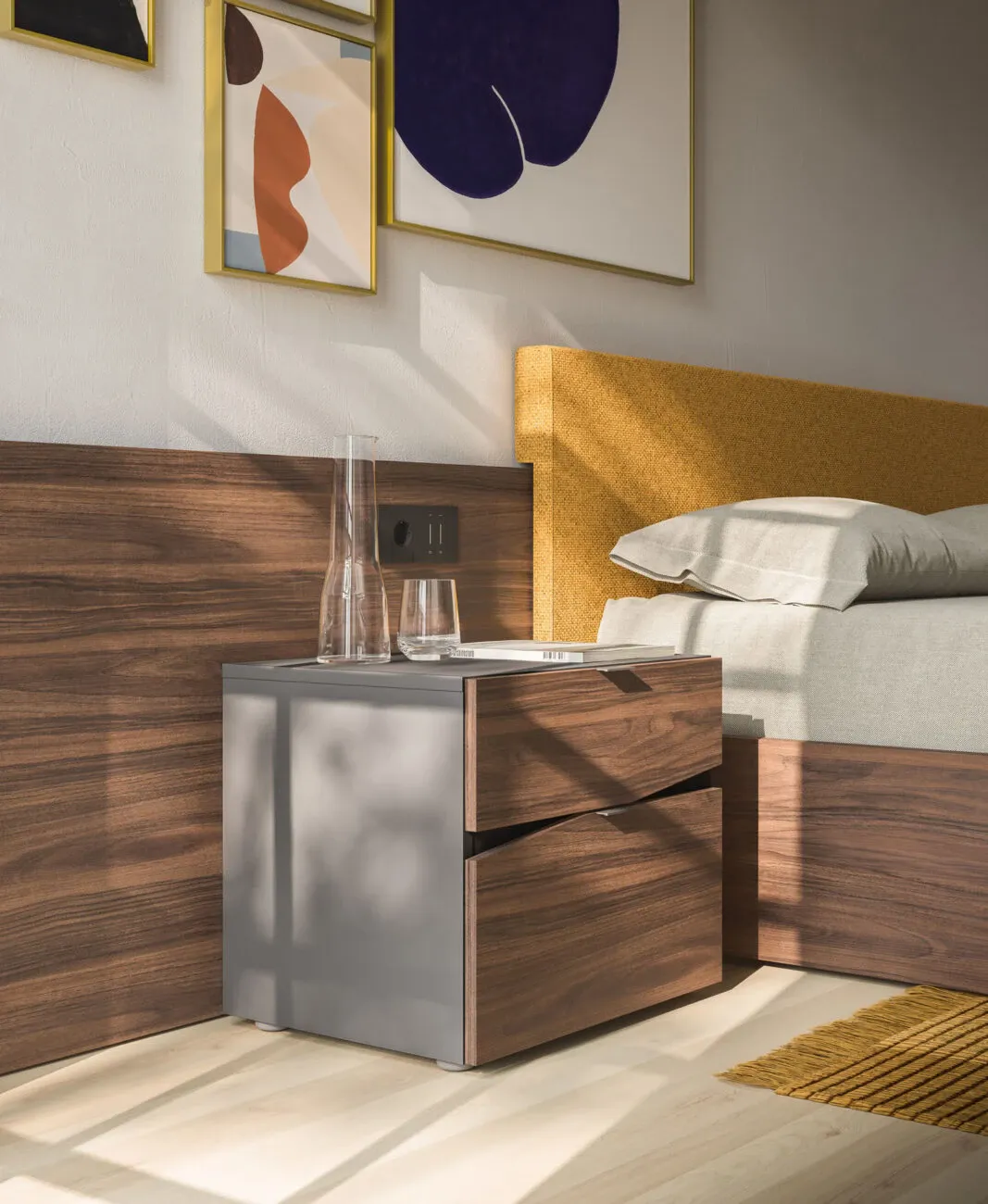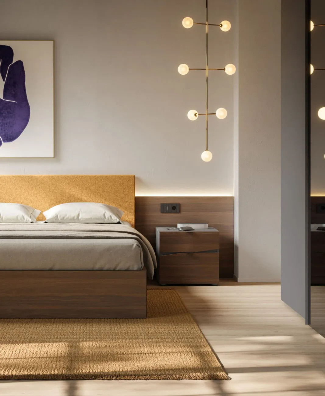 Sistema notte con boiserie a parete, testiera imbottita e finiture calde effetto cotto: una soluzione completa che unisce stile, comfort e funzionalità.