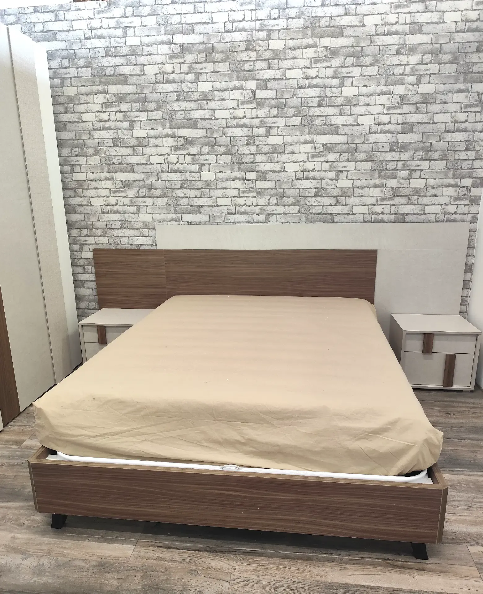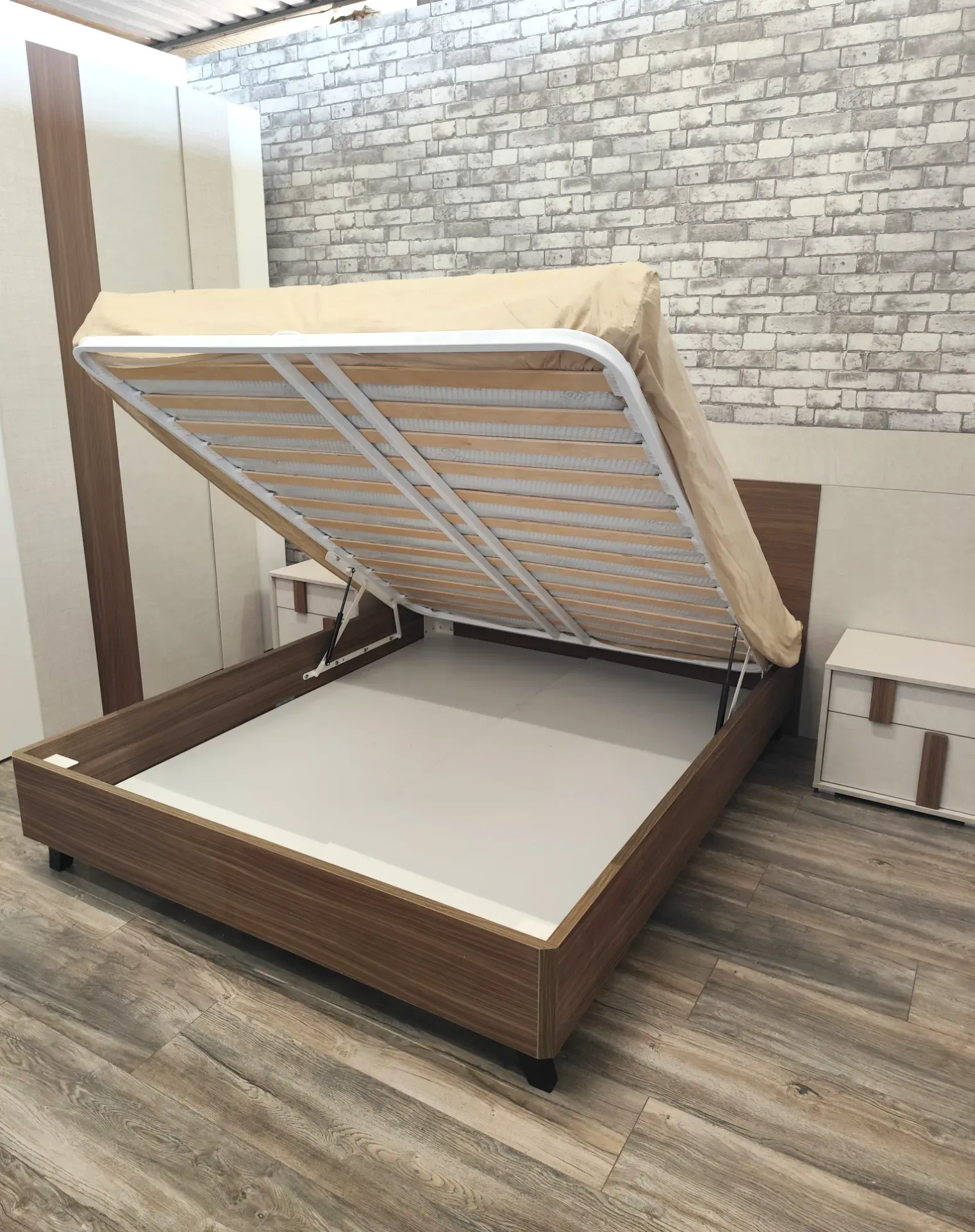 - Struttura letto CONTENITORE + piedini, con doppia testiera ad effetto sfalsato, color Calce e Noce Dark lunga 3 mt -- giroletto L168x198