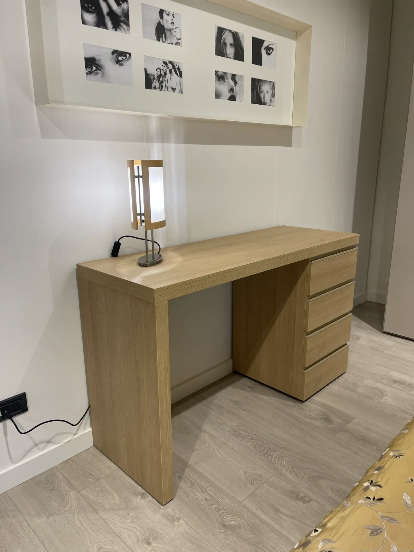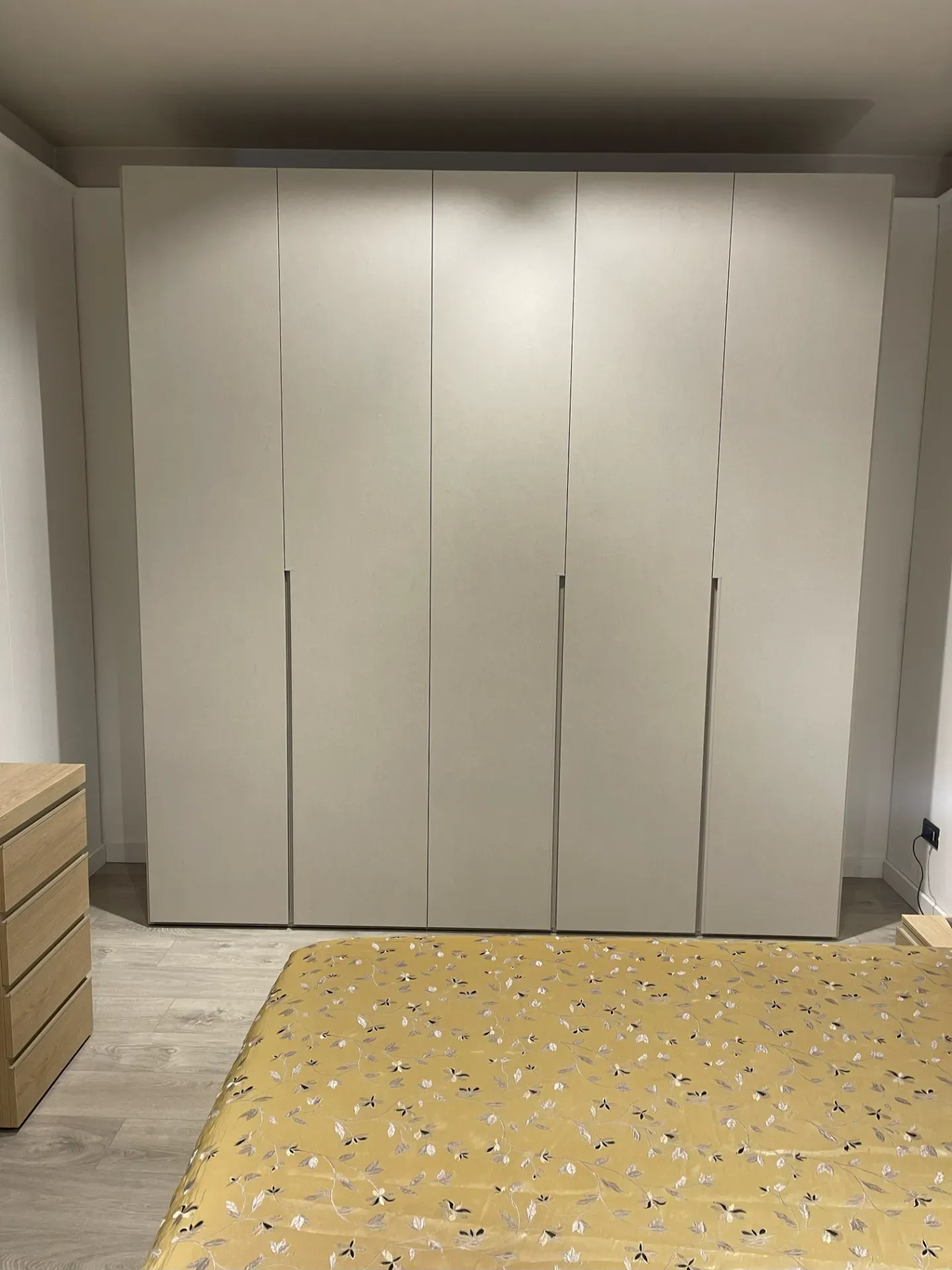 Armadio battente 5 ante da cm. 248,8 h. 257,6, compreso di cassettiera interna. Comodino da cm. 45 a 2 cassetti con apertura gola. Zona smart working-trucco da cm. 135 con cassettiera, apertura a gola. Letto contenitore con rete da cm. 160x200 (escluso materasso).