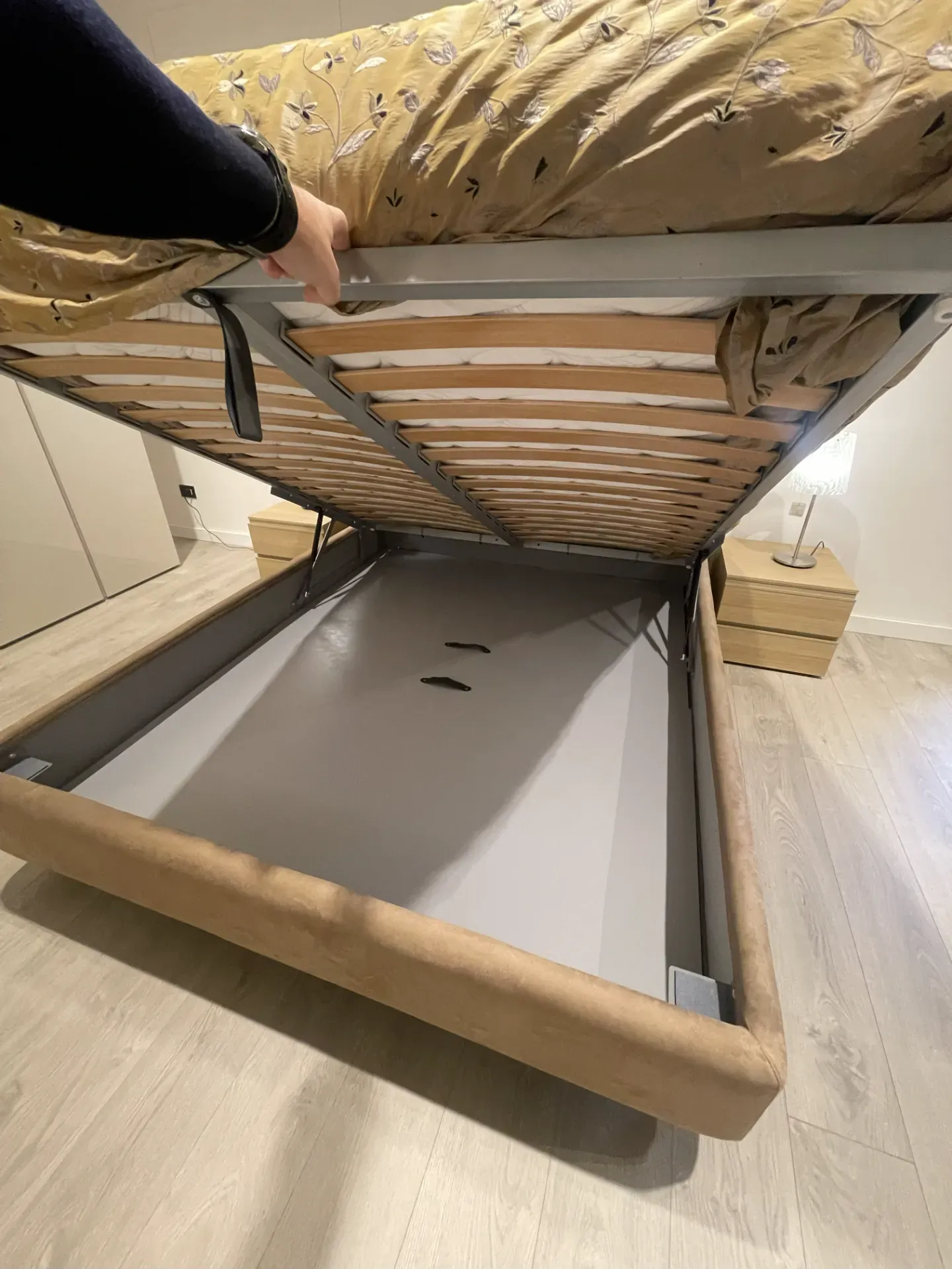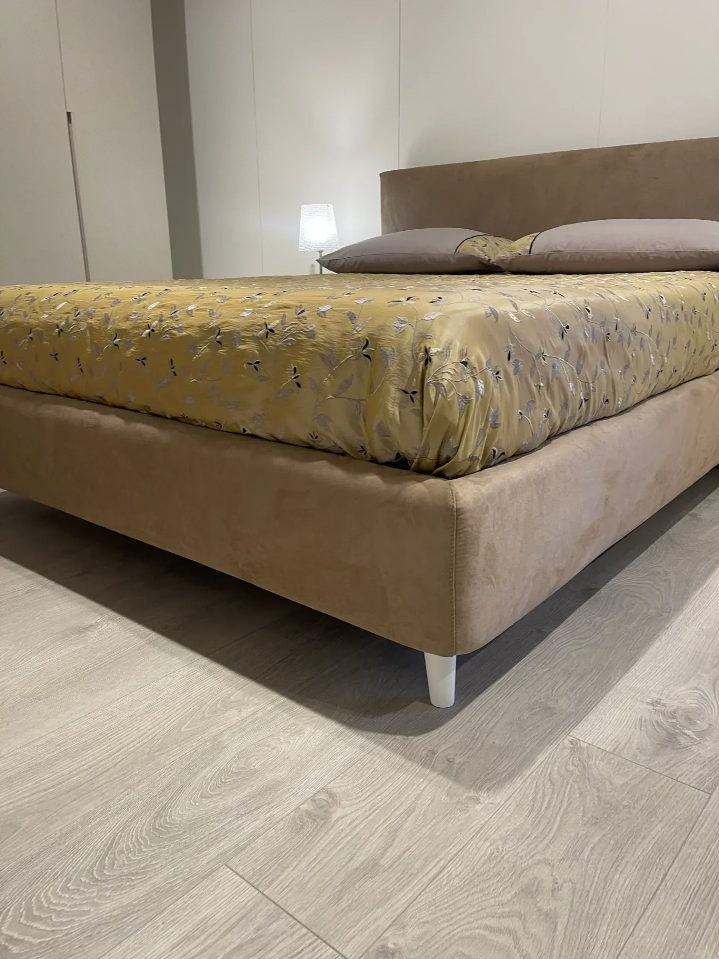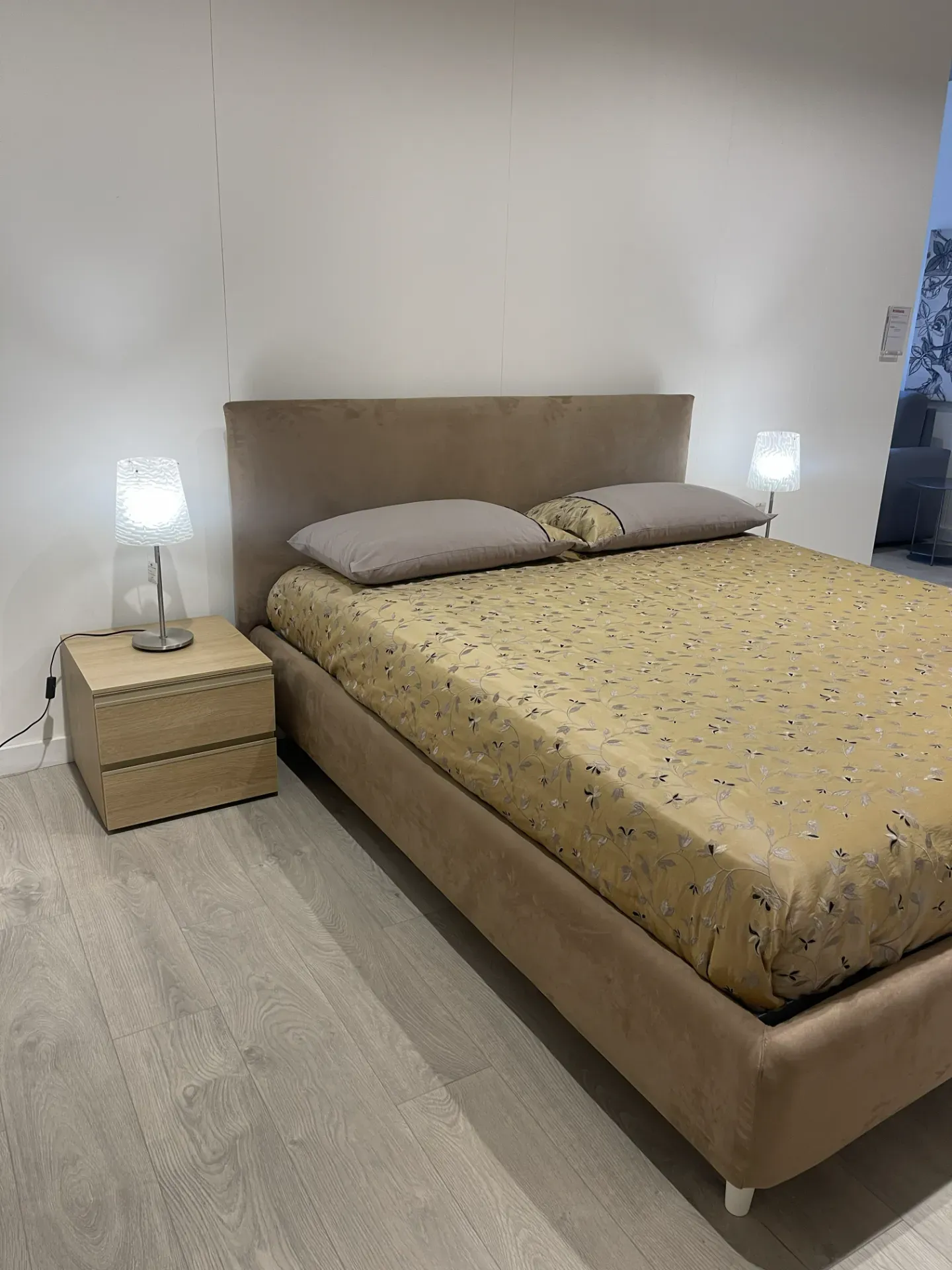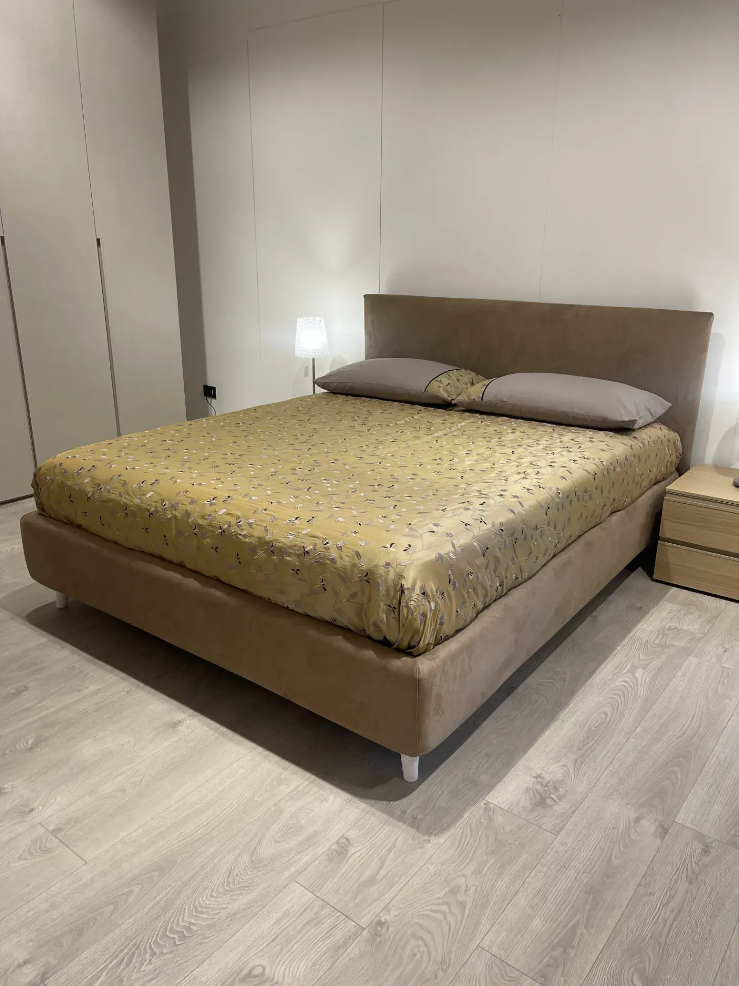 Armadio in finitura laminato dekor canapa e gruppo notte in laminato rovere. Letto con rivestimento in tessuto, completamente sfoderabile, e rete a doghe.