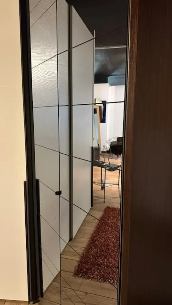1 Angolo cabina spogliatoio con ante a libro a specchio, cassettiera interna, ripiani interni e tubi appendiabiti, mensolina svuota-tasche con specchio superiore (da fissare) e possibilità di inserire luci all'apertura ante (al momento escluse) misure cabina circa 127x127