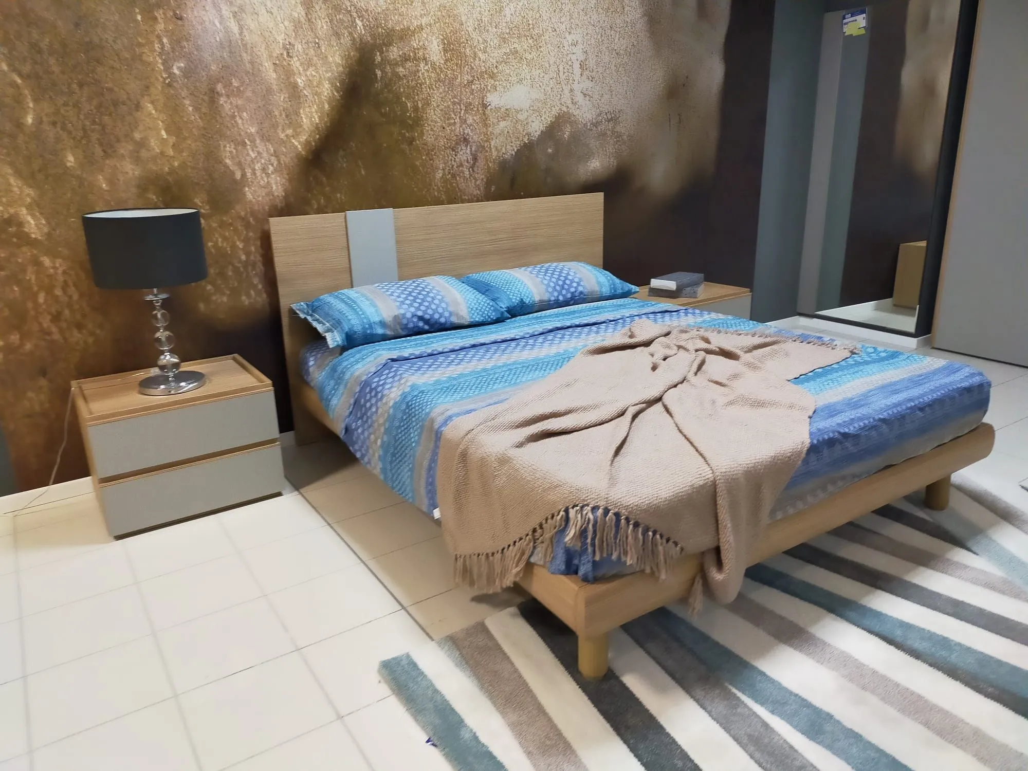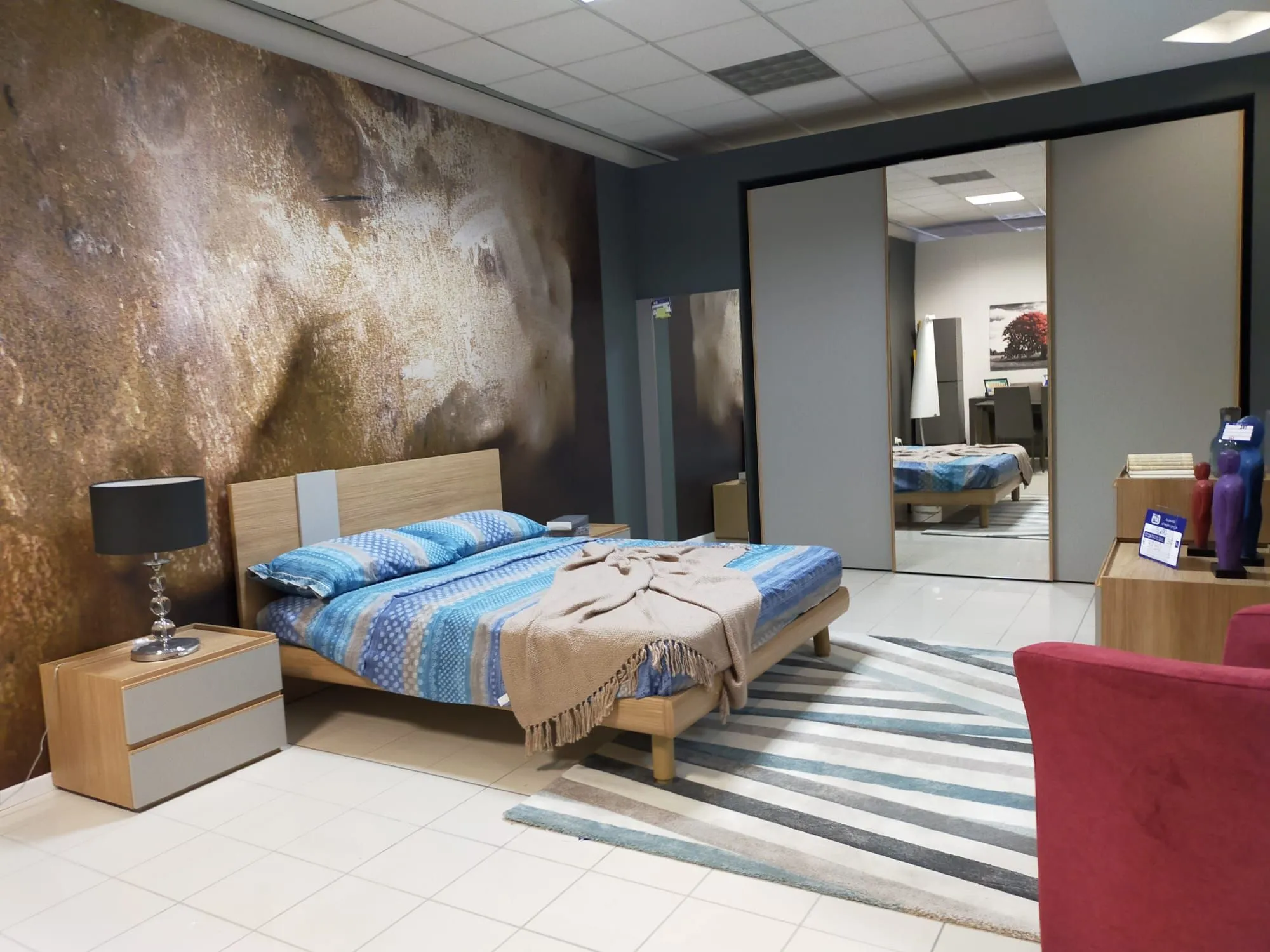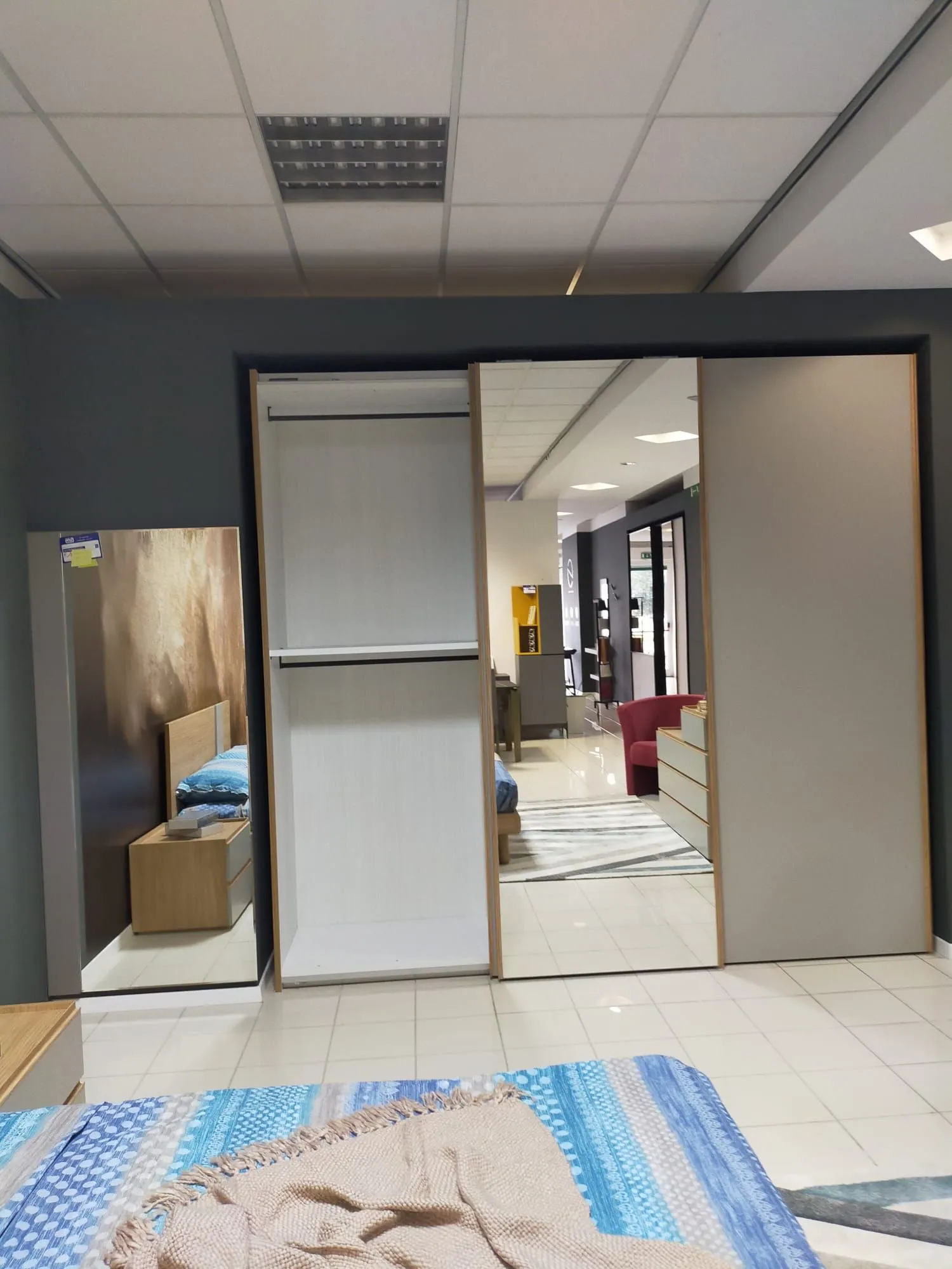 CAMERA MATRIMONIALE FINITURA MATWOOD HONEY/ ECOLIMO COMPOSTA DA: ARMADIO 3 ANTE SCORREVOLI ANTA CENTRALE A SPECCHIO COMPLETO DI CASSETTIERA INTERNA DIMENSIONI L. 275.1 P. 65.3 H. 253 COMODINI L. 59,4 P. 48,8 H. 44,9 COMO' L. 118,7 P. 48,8 H. 67/88 LETTO MATRIMONIALE L. 171,3 P. 203,6 H. 97,5 COMPRESO RETE ORTOPEDICA A DOGHE (160X195) ESCLUSO MATERASSO
