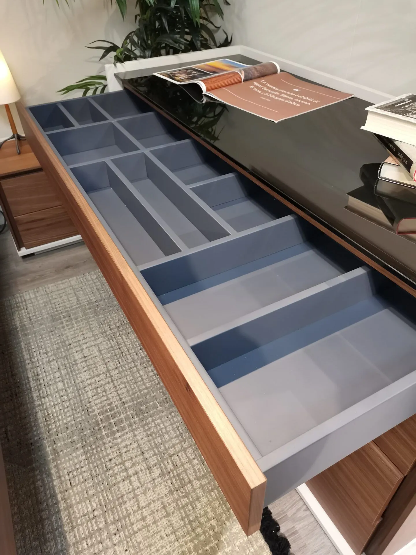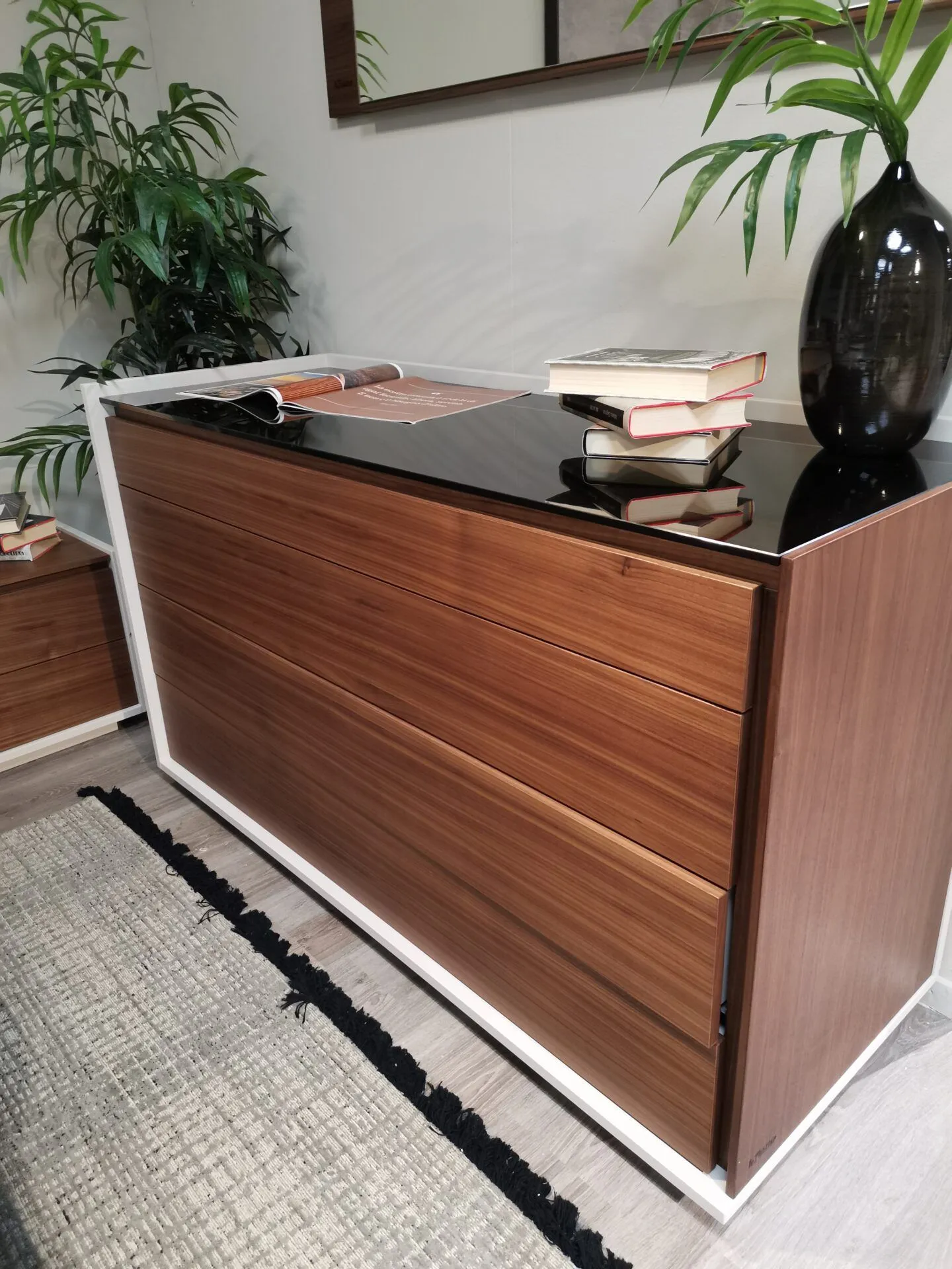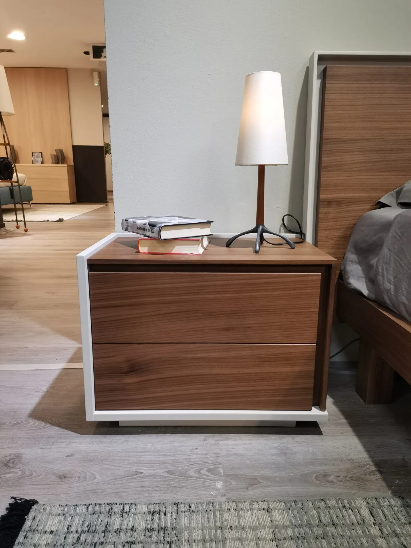Finitura bicolore essenza Noce Canaletto e laccato Ghiaccio.