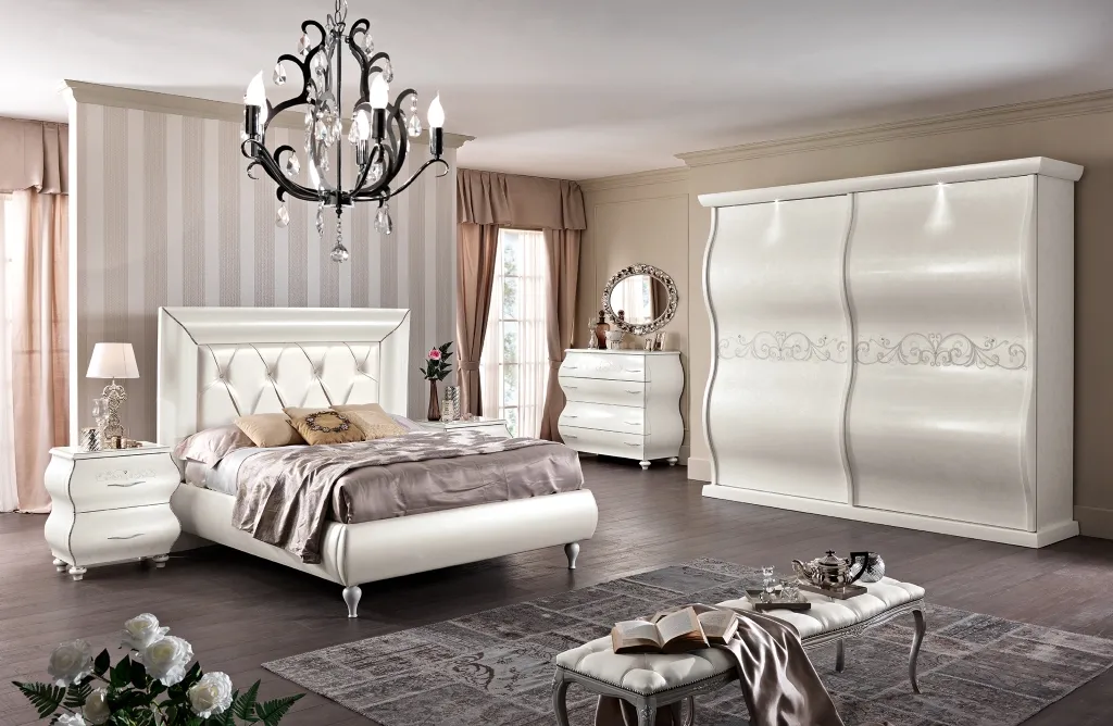 La camera è disponibile in tre eleganti finiture: madreperla avorio, bianco e tortora. I dettagli sono decorati a mano da maestri artigiani con inserti Swarovski.