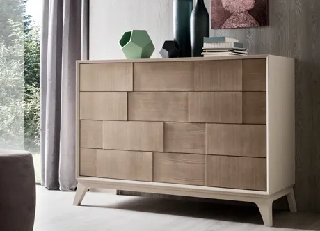 Linee verticali ed orizzontali, utilizzate in modo consapevole, generano una collezione dalla forte personalità, la semplicità del design come espressione di un concetto di bellezza ed armonia, come un quadro di arte moderna. Alti e bassi rilievi, sbalzi delle forme, generano effetti di chiaro e scuro che donano vigore agli arredi e vitalità all ambiente. Accostamenti di tessuti diversi creano un gioco di colori per gli occhi e di textures per il tatto. Il frassino semi fiammato spazzolato, utilizzato per la realizzazione della collezione, è stato scelto per sottolineare il carattere forte di ogni singolo arredo che la costituisce. Questo bellissimo gruppo letto comprende il letto Cardamomo in essenza con testiera Patch, il comò Timo, i due comodini Curcuma e la specchiera Pepper, e può essere completato con gli armadi ad ante scorrevoli o battenti della stessa collezione Le Spezie.