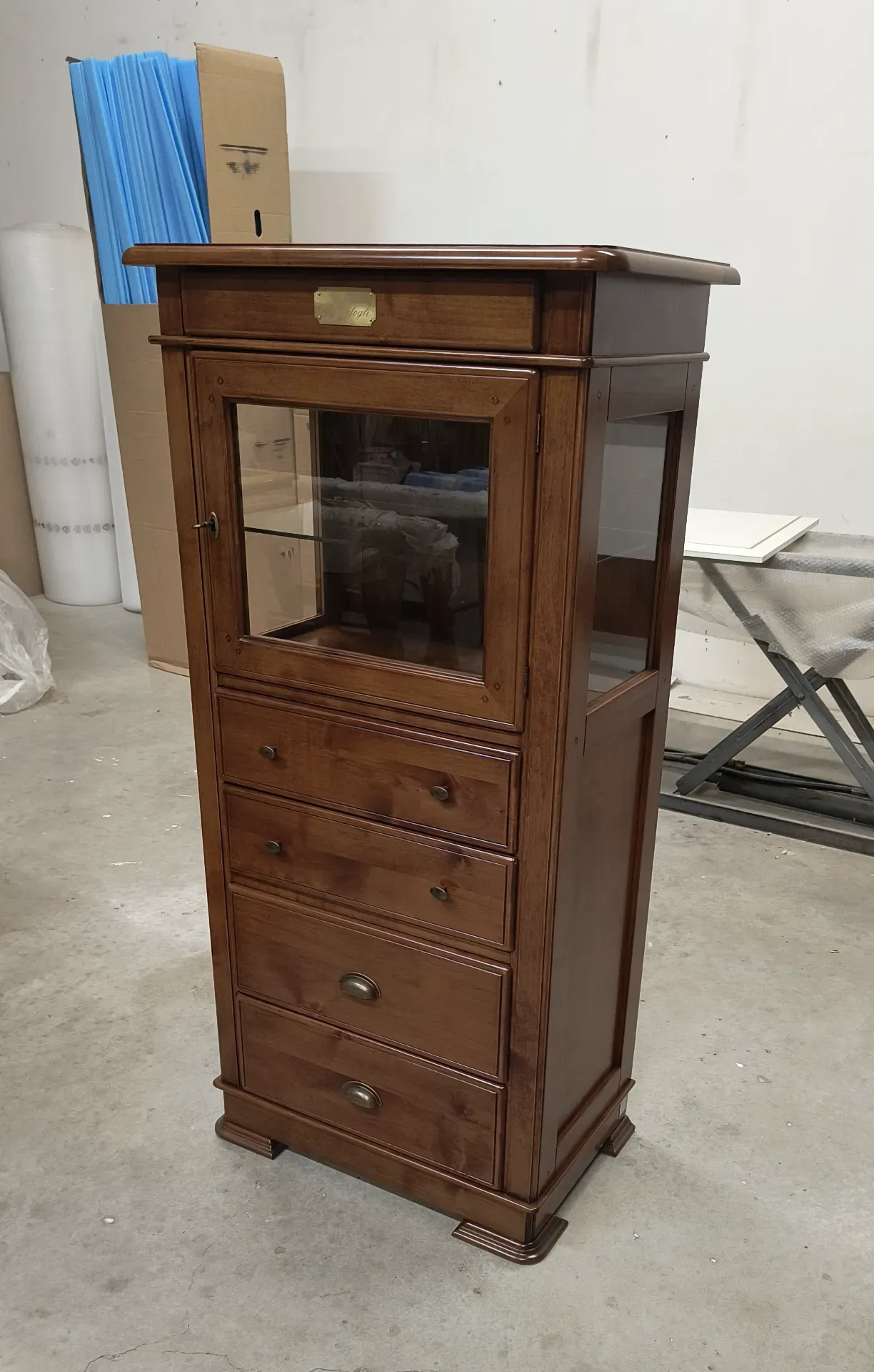 Cassettiera con vetrinetta e cassetto superiore push-pull, interamente massiccia , struttura in ciliegio , schienale e cassetti in frassino , dotata di un cassetto segreto nel lato destro dello zoccolo (vedi foto)