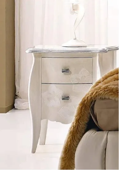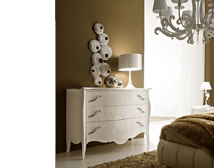Comò e comdini (commode and bedsides)creati dalla sapienza di maestri artigiani. L'offerta si riferisce a questo gruppo letto con finiture come foto con: scocca gessato bianco lucido, gambe sagomate tempera bianco lucido con bordo top in foglia argento, cassetti gessato bianco lucido con decoro bianco. Maniglia e pomelli argento antico. Le vaste possibilità di abbinamento di questi pezzi ne fanno elementi d'arredo adatti ad ogni casa, per chi ama inserire pezzi raffinati nel proprio arredamento. Le misure del coò sono: l. 136 p. 55 h 96 Le misure del comodino sono l. 53 p. 39 h 62