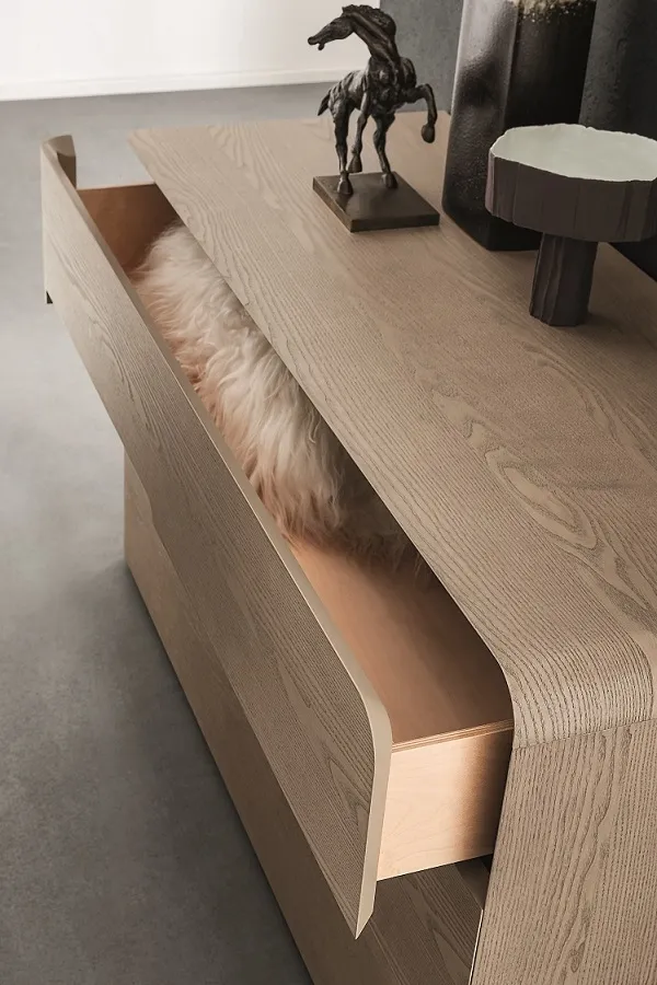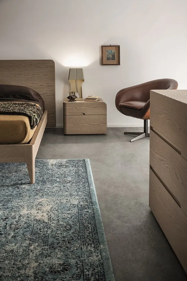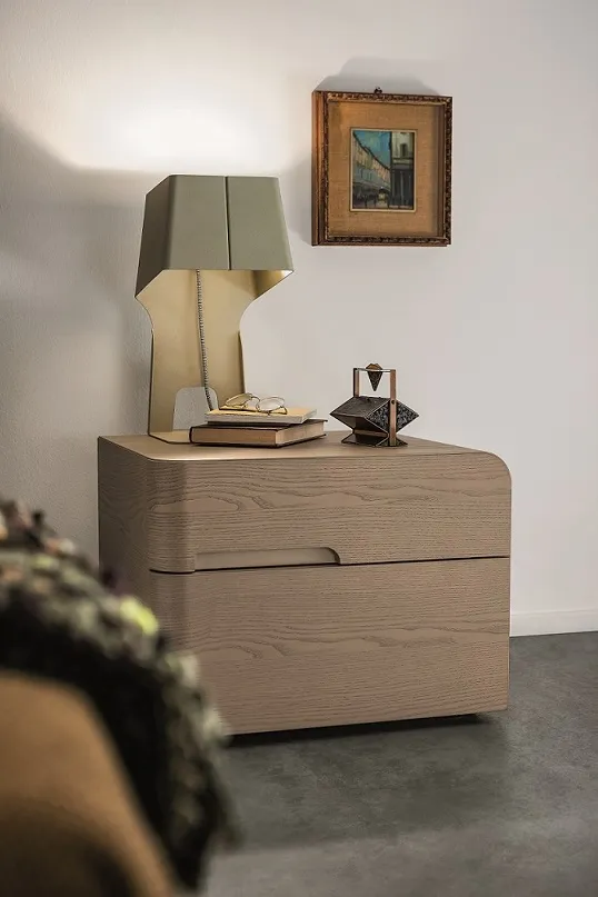 Comodino dalla linea morbida. Disponibile in tutte le finiture Fresno, Olmo Perla e in tutti i colori del rovere laccato a poro aperto. Una lavorazione del legno frutto della grande abilità degli artigiani che creano superfici curve perfette. Ogni elemento è realizzato con una superficie di vero legno proveniente dallo stesso tronco per ottenere la continuità della venature L'elevata qualità dei materiali utilizzati rendono il gruppo estremamente prezioso. Tutti gli interni dei cassetti sono in legno (foto), le guide sono a chiusura rallentata, la maniglia è incavata nel cassetto (dettaglio foto). Il prezzo indicato nell'offerta si riferisce al comodino. Il prezzo in offerta del comò è € 1.390,00 ( Il prezzo del settimino € 1.440.00 Misure: comodino cm 54.5x45 h 41.5, comò cm 131x52 h 74.5, settimanale cm 65.5x45 h 128