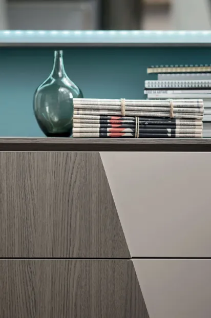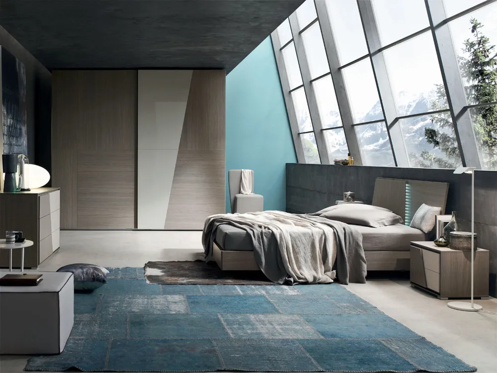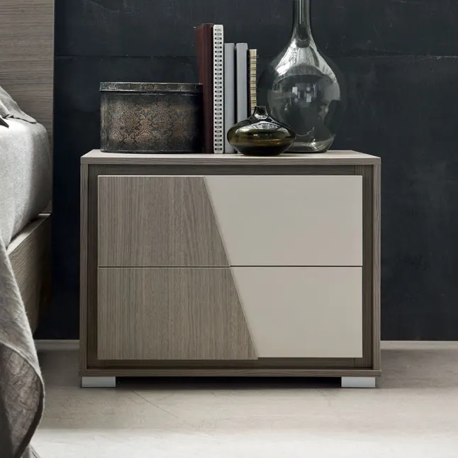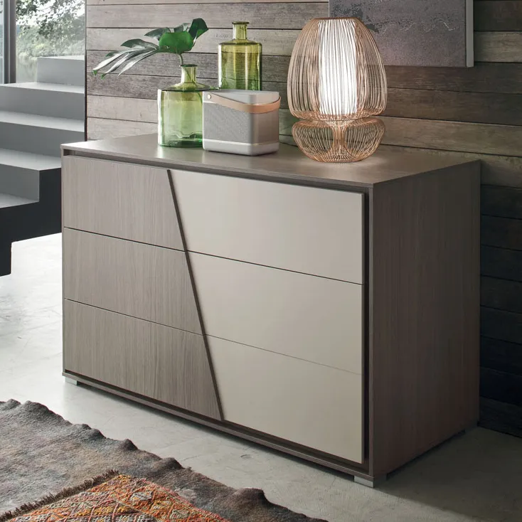 Questo gruppo letto dal design semplice e moderno è caratterizzato da una divisione in diagonale che separa le due diverse finiture a scelta ed i due differenti spessori. La parte sinistra in rilievo è della stessa finitura della struttura, mentre quella destra rientrante può essere di una finitura diversa a scelta allo stesso prezzo. Il prezzo indicato nell'offerta comprende un gruppo composto da un comò a 3 cassetti e due comodini a due cassetti. Questi elementi sono acquistabili anche separatamente. Tutti i cassetti sono dotati di chiusura rallentata di serie. Disponibile nelle finiture (mostrate nella foto) bianco, ghiaccio, frassino bianco, titanio, grafite, olmo artico, olmo grigio e rovere avena. Le misure sono: per il comodino L 53,3 cm P. 41,3 cm H 40,6 cm; per il comò L 125,2 cm P. 55,3 cm H 79,2 cm. I pezzi sono ordinabili anche singolarmente.