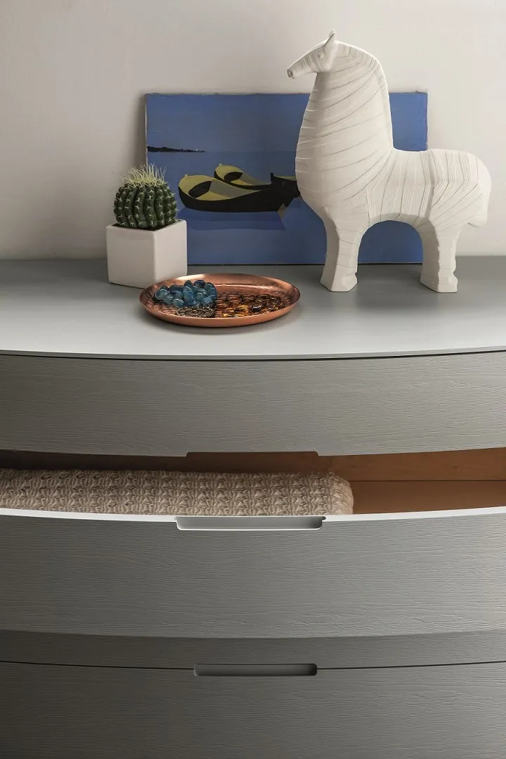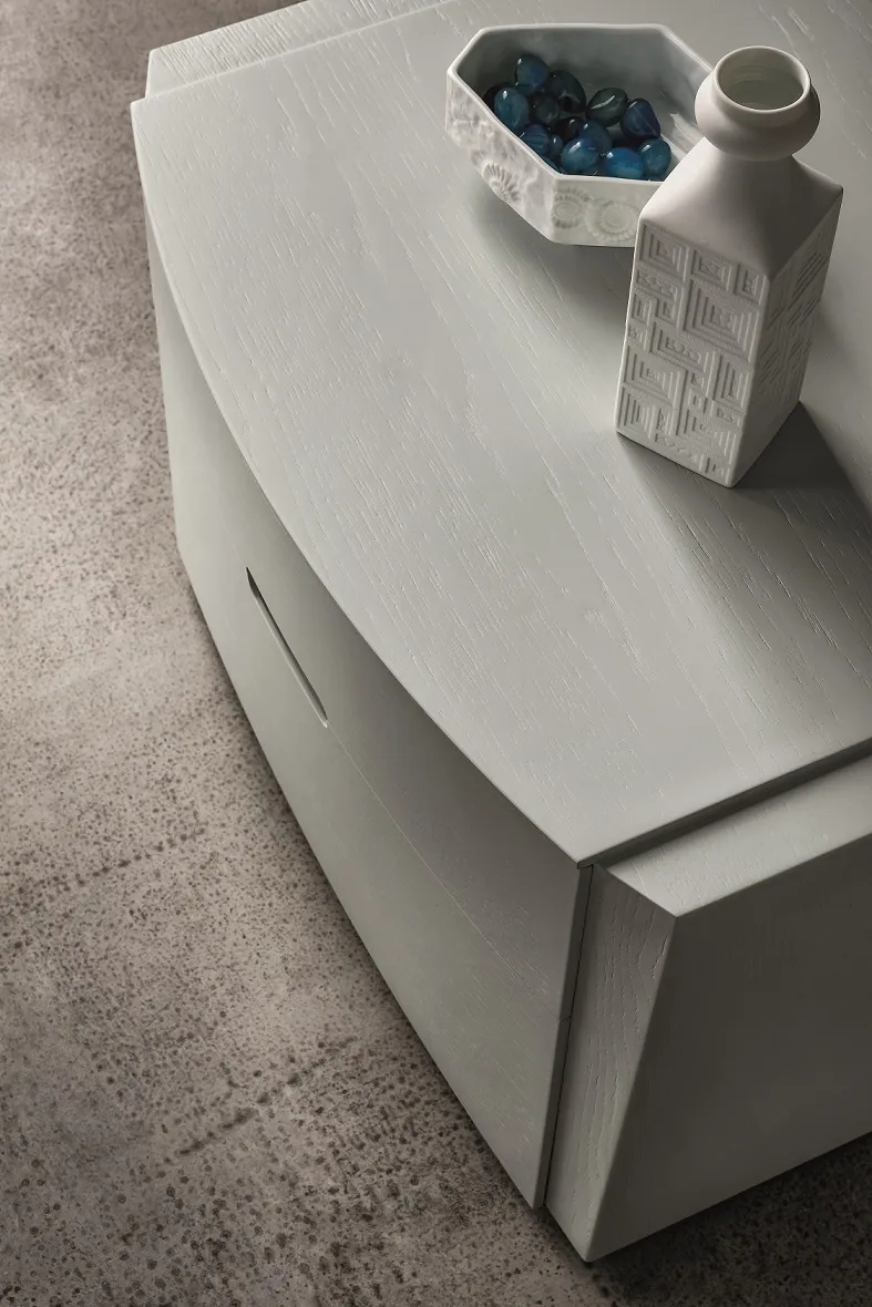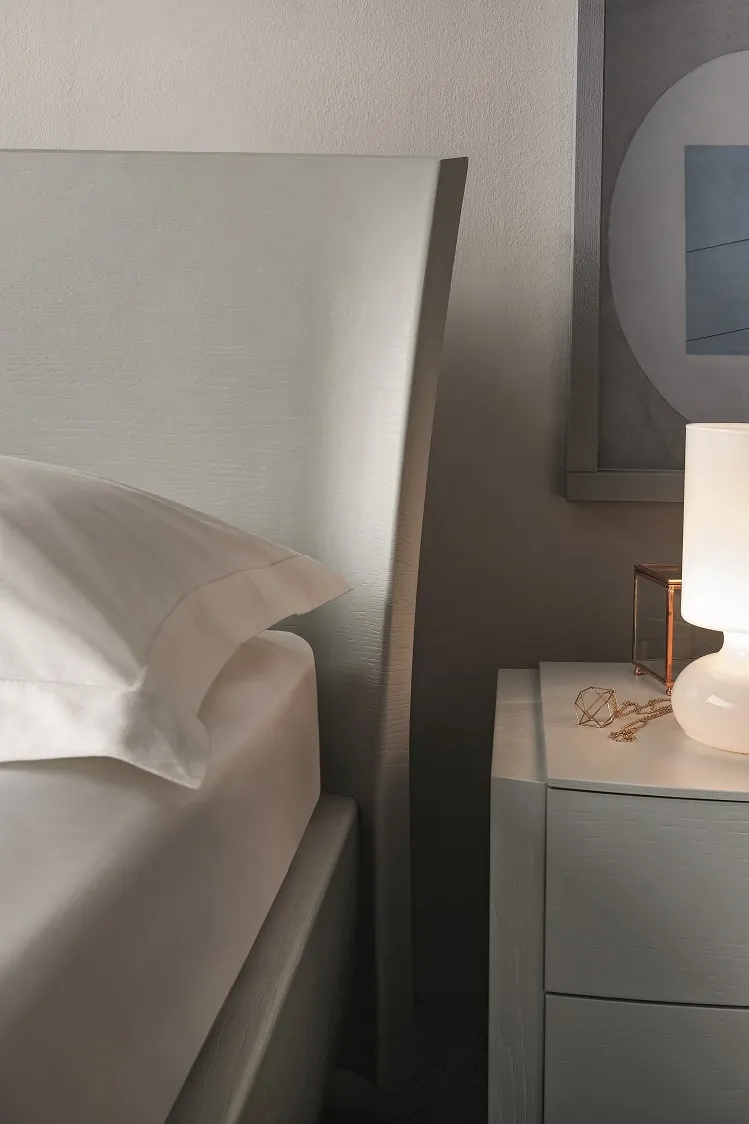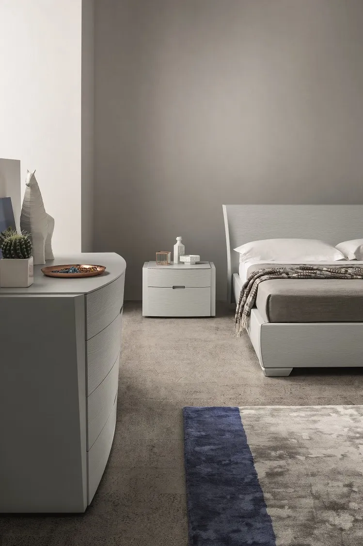 Elti è un gruppo letto in legno di rovere porto aperto ghiaccio. Il frontale curvo è contraddistinto da due fasce laterali verticali che danno forza alla linea già elegante di questi pezzi. Realizzato con maestria da artigiani dalla profonda conoscenza del legno risulta armonico, equilibrato ed estremamente contemporaneo. I cassetti sono in legno e le guide hanno il sistema di di chiusura rallentato. I prezzi dell'offerta sono riferiti al comodino a 2 cassetti Elti cm 60x45x42 h, è disponibile anche il comò cm 130x55.5x77.5 h al prezzo scontato di € 1.290,00