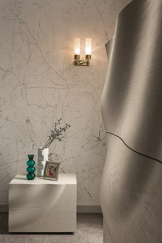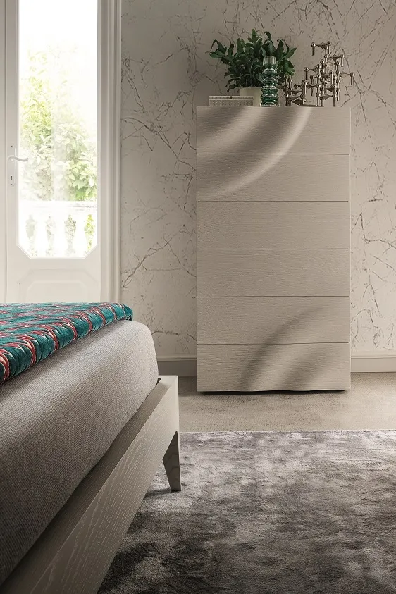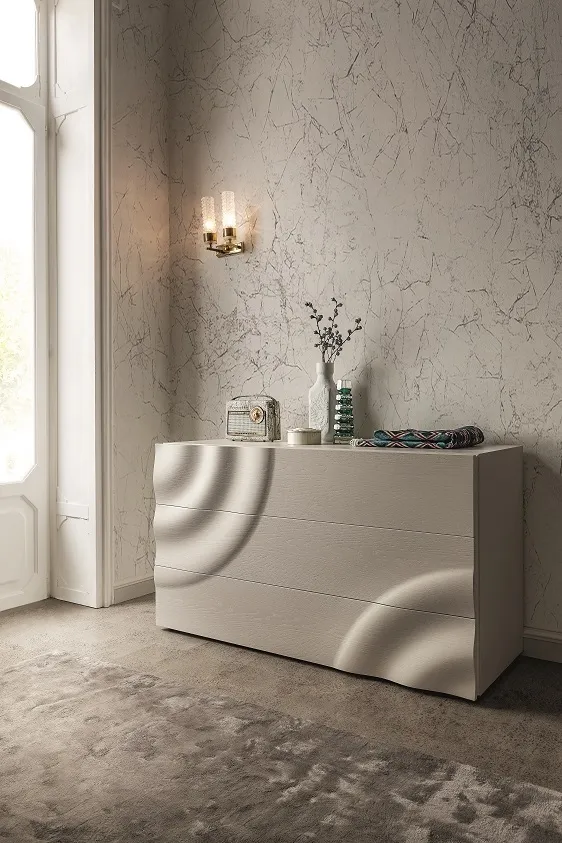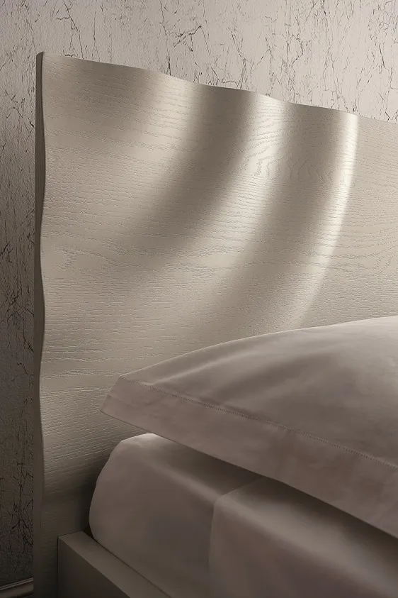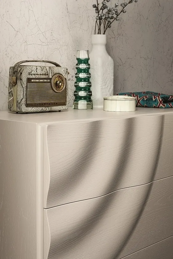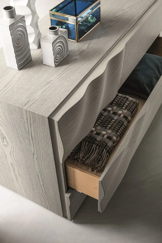 Questi pezzi sono disponibili in tutte le finiture fresno essenza e legno rovere a poro aperto. I frontali di questa collezione presentano una maestria unica nella lavorazione del legno, che modella il pannello in maniera plastica richiamando il movimento delle onde sulla superficie dell'acqua generate dalla caduta di una goccia d'acqua. Nasce una collezione dal design unico e scultoreo. Il prezzo dell'offerta è riferito al comodino a 2 cassetti cm 57.5x44x43.5. Sono inoltre disponibili il comò cm 130.5x53x75h al prezzo scontato di € 1.540,00 (invece di € 2.307,00) ed il settimino al prezzo in offerta di € 1.590,00 (invece di € 2.451,00). Il letto e la scrivania con la stessa lavorazione completano la collezione.