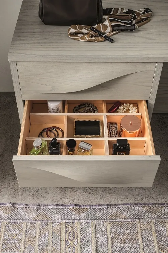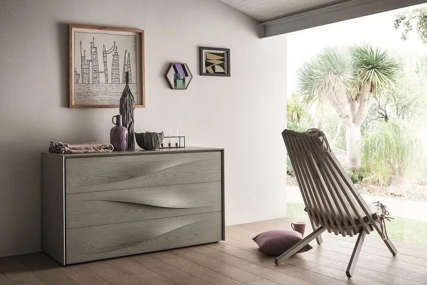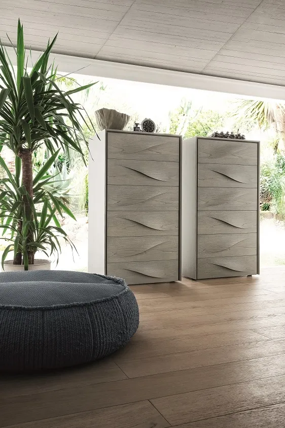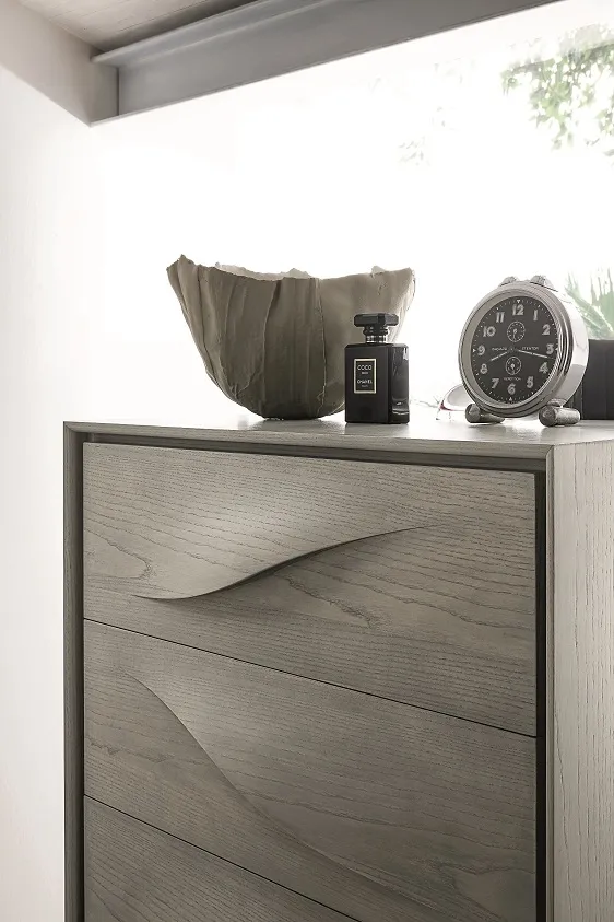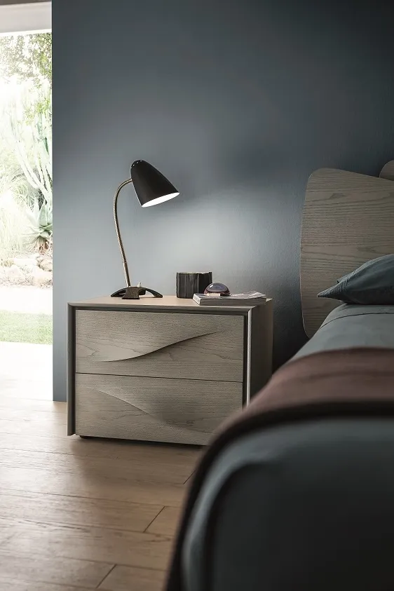 Gruppo letto modello Fontana in legno. Le morbide linee sinuose sono date dalla esclusiva maniglia ad onda ricavata dal frontale stesso, grazie all'abilità di maestri artigiani ispirata alle famose opere d'arte dell'artista Lucio Fontana. I cassetti sono in legno, con guide rallentate. Il prezzo dell'offerta si riferisce al comodino a 2 cassetti Fontana cm 57.5x45.5x43.5 h. Sono disponibili inoltre il comò cm 130.5x55.5x75 h al prezzo promozionale di € 1.390,00, il settimino cm 65x51x123 hal prezzo scontato di € 1.560,00.