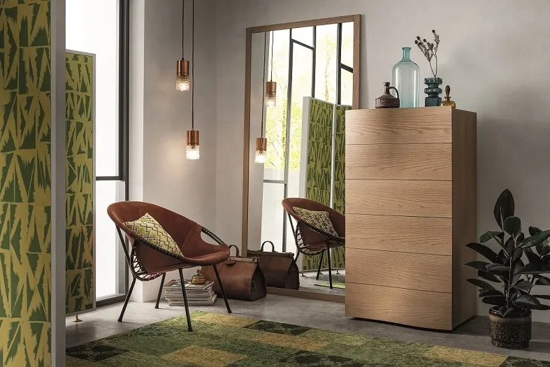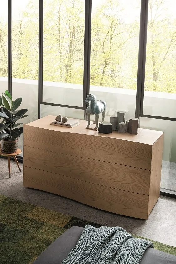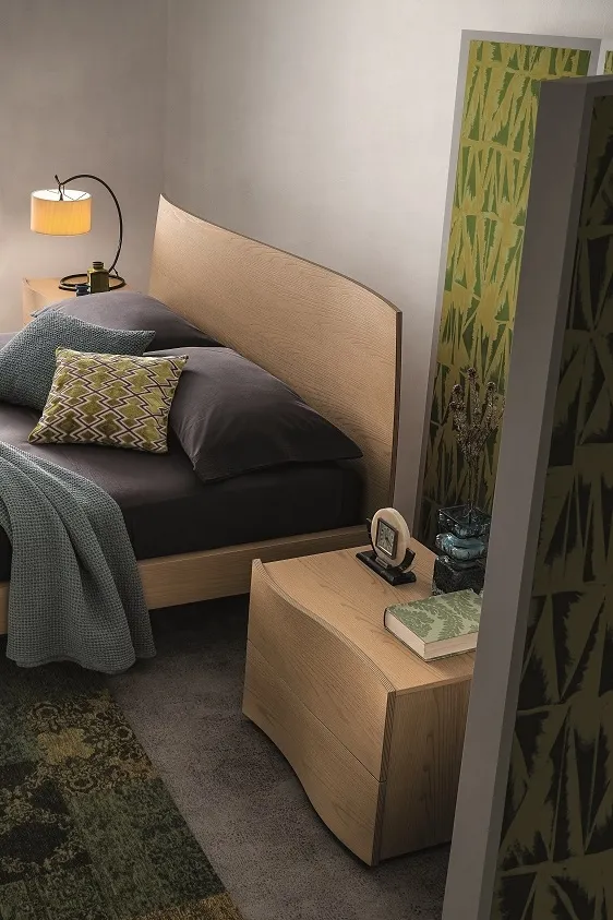 Gruppo letto in vero legno, lavorazione artigianale, realizzato con una attenta cura nella continuità della venatura del legno. Elegante con una linea essenziale e contemporanea . Uno stile misurato e mirato alla cura dei dettagli, particolare che si nota nella lavorazione ricercata del pannello di legno dei frontali, con curvatura elicoidale; se lo guardiamo di lato sembra un foglio di carta che si piega librandosi nell' aria. Creativo ed ingegnoso rende unico lo spazio notte della casa. I cassetti hanno le guide con sistema di chiusura rallentato e sono realizzati in legno. Il prezzo dell' offerta si riferisce al comò a 3 cassetti cm 125x53.5x73 e ai 2 comodini a 2 cassetti cm 57.5x45x43.5. E' anche disponibile il settimino a 6 cassetti al prezzo promozionale di € 1.280,00 Questi pezzi sono disponibili allo stesso prezzo in tutte le finiture delle essenze e dei roveri laccati.