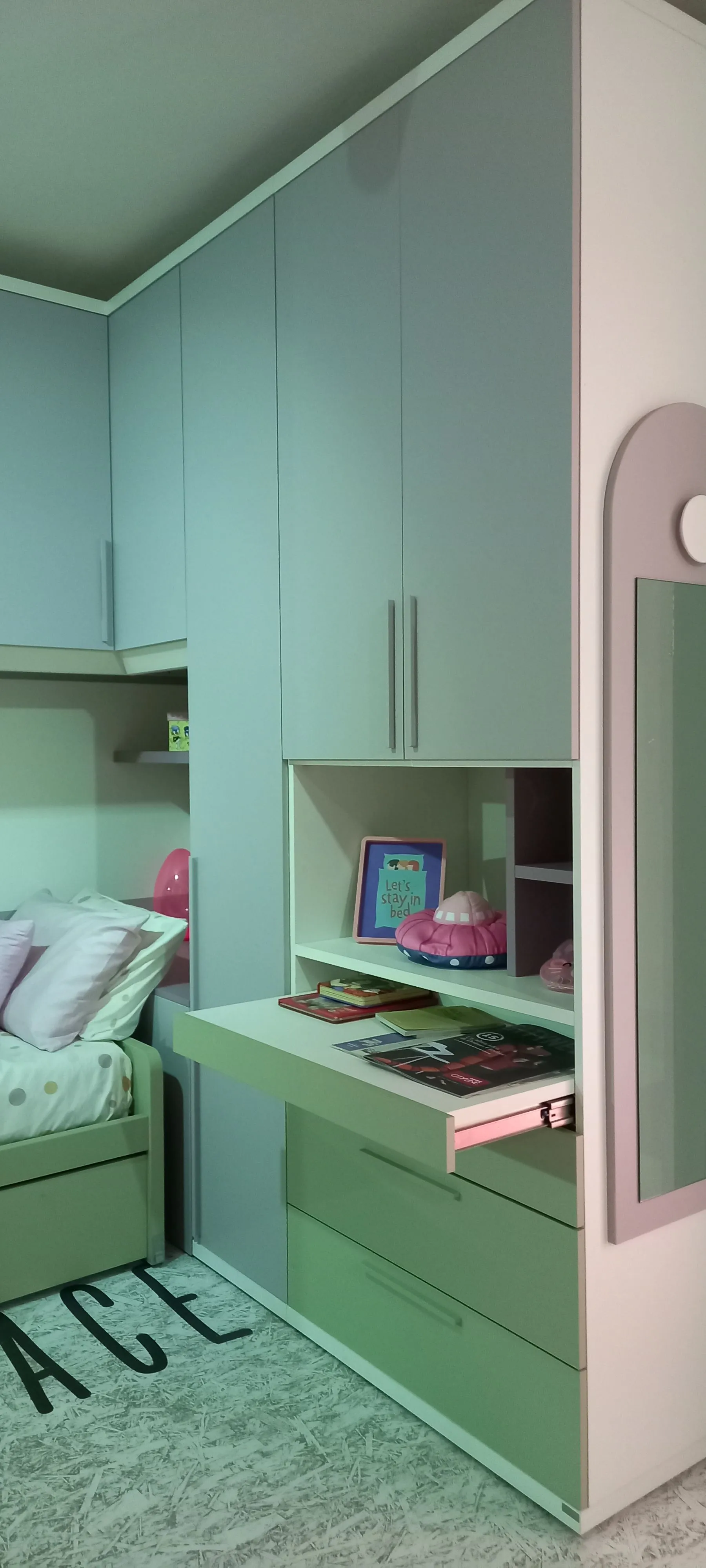 Cameretta per bambina/ragazza a ponte in laminato color rosa, tortora e bianco con maniglia. La cameretta è composta da un letto ad una piazza ed un secondo letto estraibile. Armadio a ponte con 7 ante, scrivania estraibile, cassettiera composta da 3 cassetti, e vani a giorno (un vano sopra la scrivania ed un secondo vano a giorno dietro il letto). Dimensioni composizione: L.278 cm - P.235 cm.