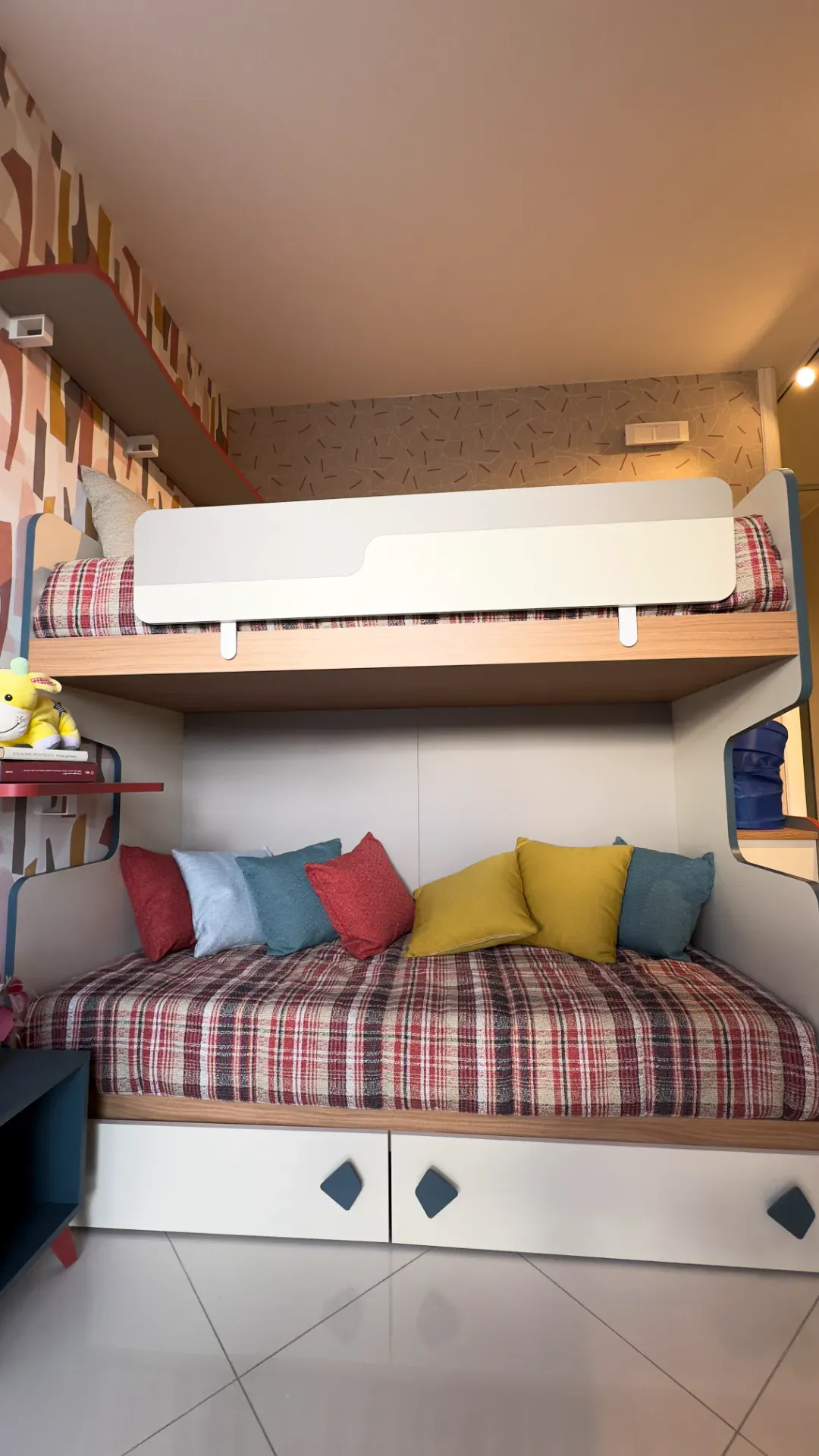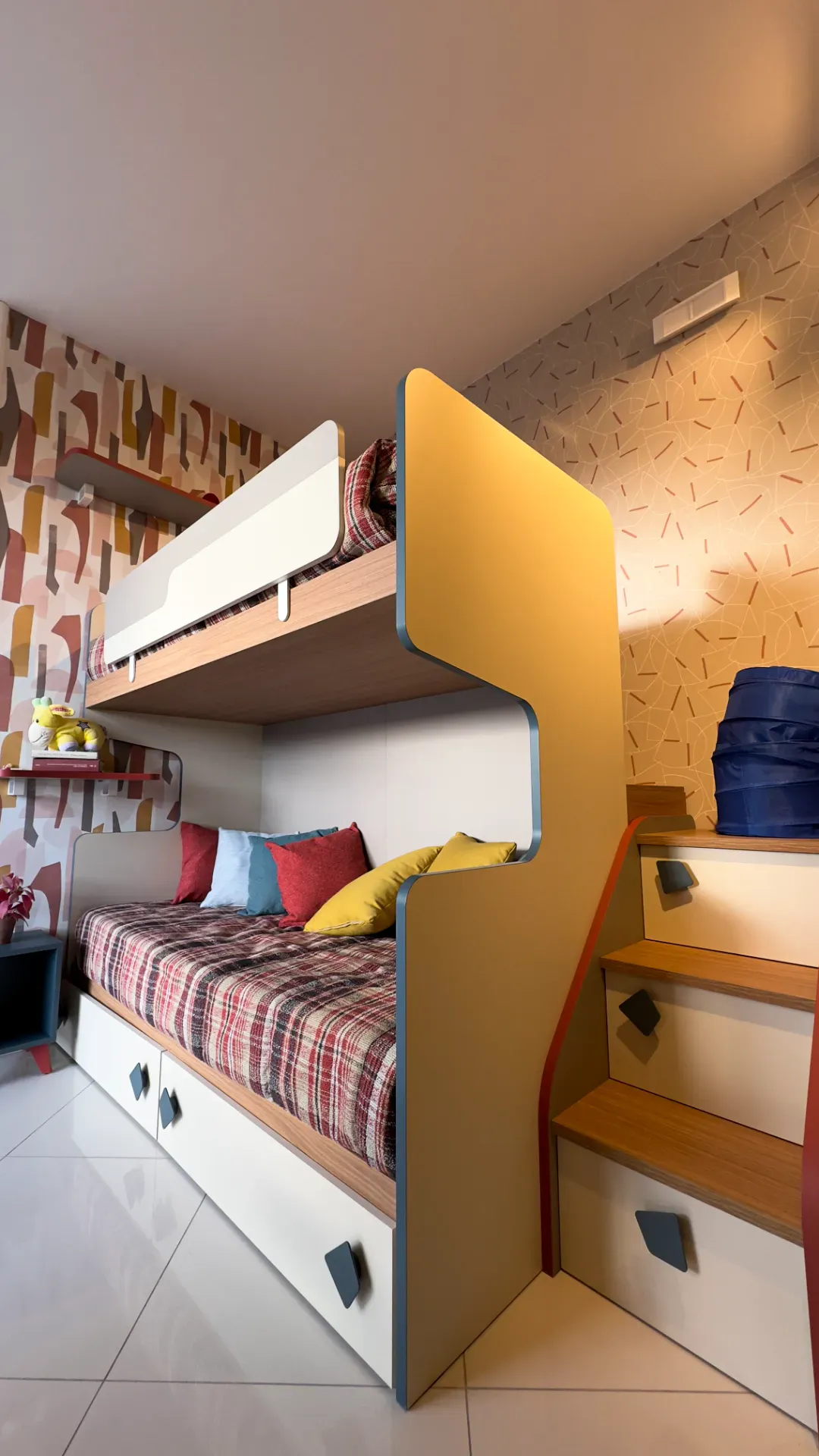 Composizione cameretta per bambini e o ragazzi, composta da sistema letto a castello con due letti , con pedana e scaletta apribili e con mensolari e comodino annesso.