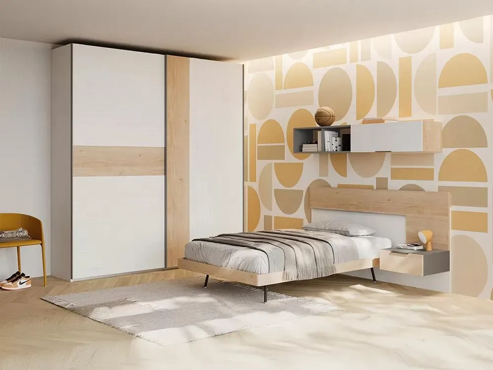 Completano la composizione un comodino a 1 cassetto sospeso con guide quadro, il letto a una piazza e mezza e due pensili.