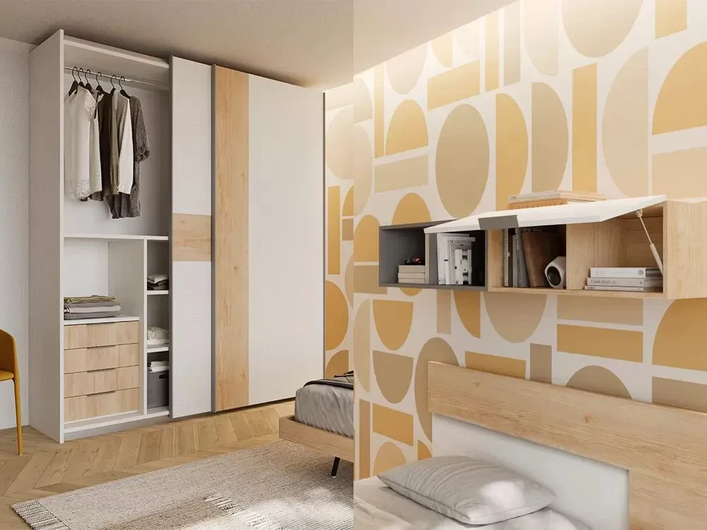 Proponiamo in offerta questa ampia e funzionale cameretta moderna composta da un armadio a 2 ante scorrevoli soft close con maniglione, 2 ripiani di spessore 25 mm + 3 tubi appendiabiti e cassettiera interna a 4 cassetti con guide soft-close (L.60 x P.44,5 x H.66,7cm)