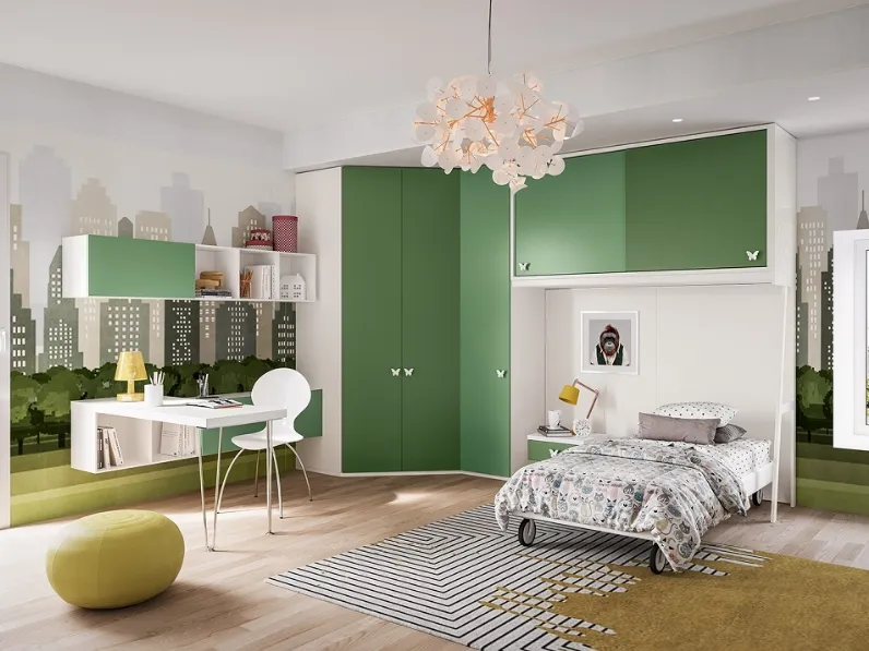 Cameretta componibile con cabina-spogliatoio ad angolo proposta nella versione con la struttura in Nobilitato Bianco e frontali in Nobilitato colore Salvia e Giada. Viene composta da : 1/Colonna-armadio da cm.50 largh. x cm.58 prof. x cm.259,2h. 1/Cabina-armadio ad angolo-maxi con 2 ante da cm.128,4 x cm.128,4 x cm.259,2h. 1/Elemento-ponte a 2 ante scorrevoli da cm.200 largh.x cm.58 prof.x cm.96h.1/Fianco di sostegno con cavalletto metallico verniciato Bianco. 1/Comodino a 2 cassetti da cm.50 largh. x cm.42 prof. x cm.38h.1/Letto-sommier-singolo con ruote rivestito in Ecopelle nei vari colori a scelta per rete da cm.84xcm.190. 1/Elemento-pensile con apertura a ribalta da cm.80 x cm.40h.xcm.33,6 prof. 1/Pensile con apertura a ribalta da cm.80 x cm.40h. xcm.33,6 prof. 11/Elemento-pensile a giorno da cm.80 x cm.40h. x cm.31,6 prof. 1/Elemento-pensile a giorno da cm.120 x cm.40h. xcm.31,6 prof. 1/Piano-scrittoio da cm.150 x cm.58 prof.x cm.5 spessore. E' un modello di cameretta disponibile nelle misure e nelle soluzioni a richiesta. E' disponibile nei vari colori del campionario. Viene prodotta dalla nota industria Giessegi considerata tra le aziende leader nella produzione di programmi componibili per ragazzi.Viene prodotta con materiali di alta qualità con l'impiego esclusivo di pannelli ecologici classe E1 e con l'utilizzo di vernici ecologiche a base d'acqua prive di solventi che possano nuocere alla salute.Le sue dimensioni d'ingombro sono: cm.328,4 x cm.380,3 x cm.259,2h. Viene proposta ad un prezzo decisamente interessante con lo sconto del 40%. Per qualsiasi informazione potete contattarci attraverso il nostro indirizzo di posta elettronica.Per i soli acquisti effettuati entro la fine del mese di Giugno,ulteriore sconto del 10%.