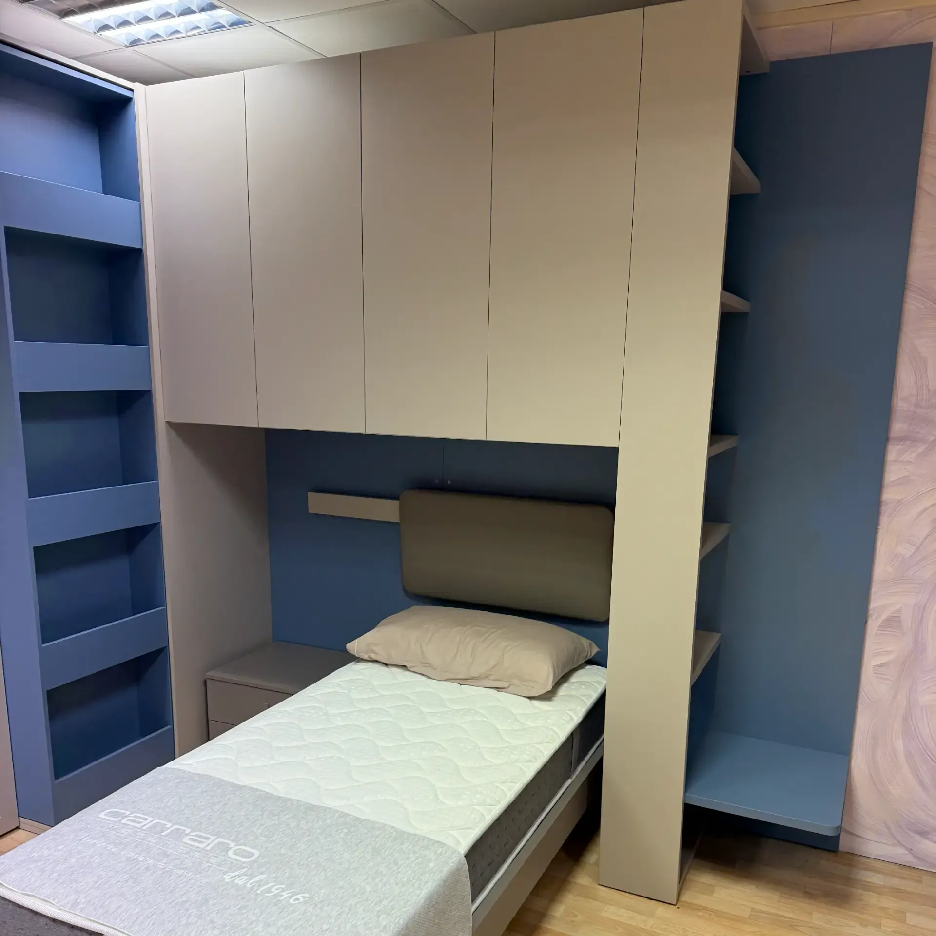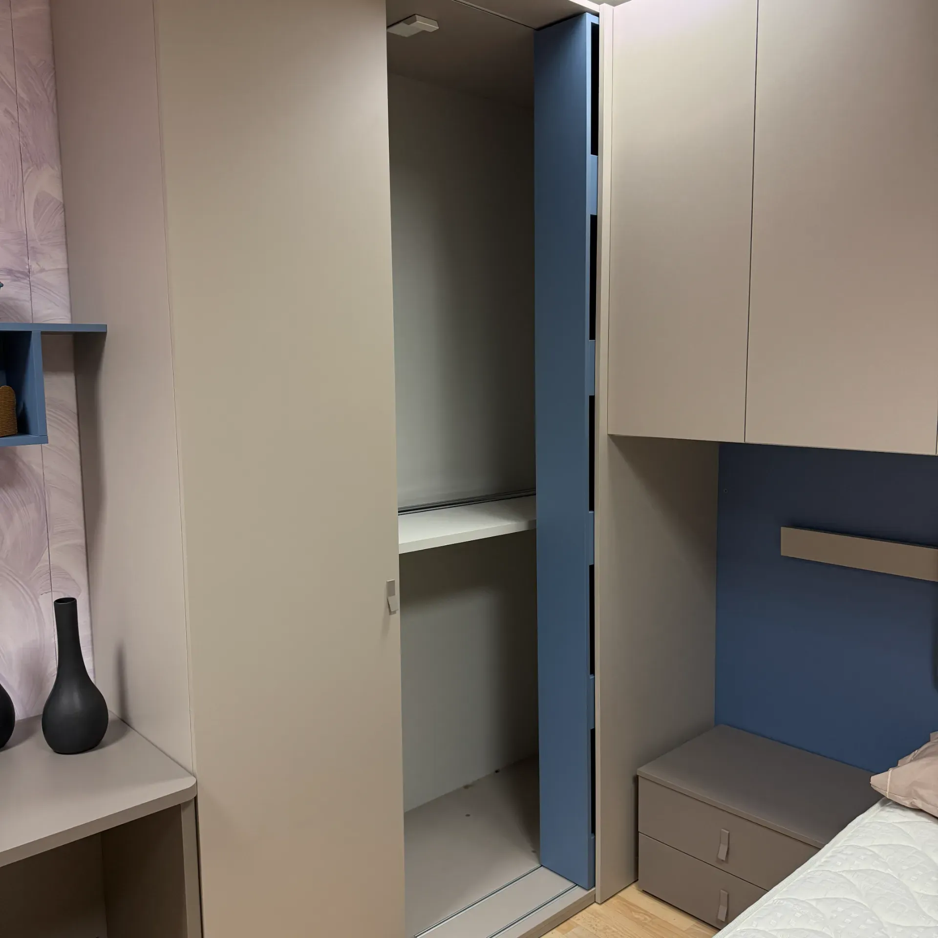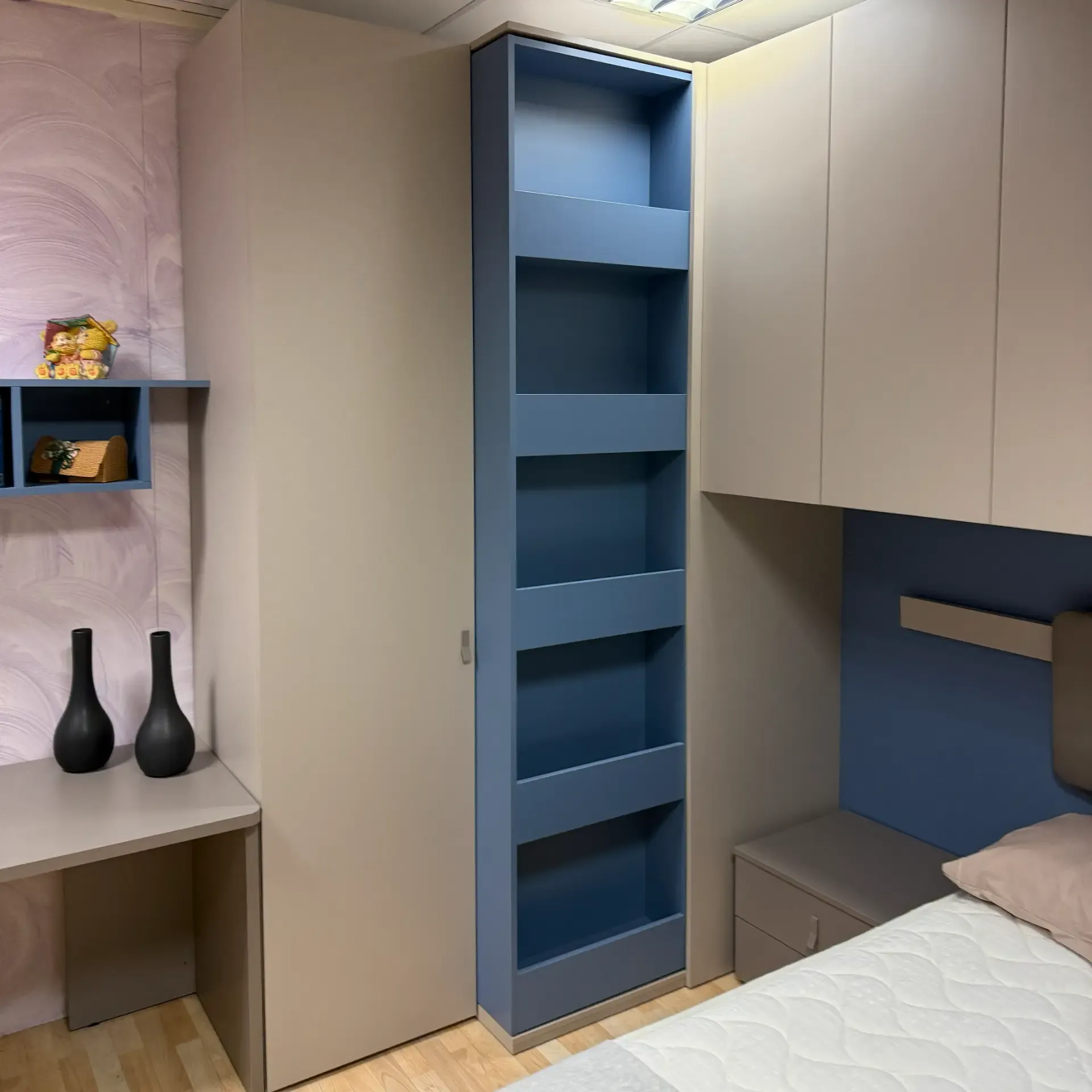 cameretta di design a ponte made in italy alta qualità , con cabina angolo scorrevole , letto , comodino , scrittoio , rete a doghe e materasso a molle insacchettate