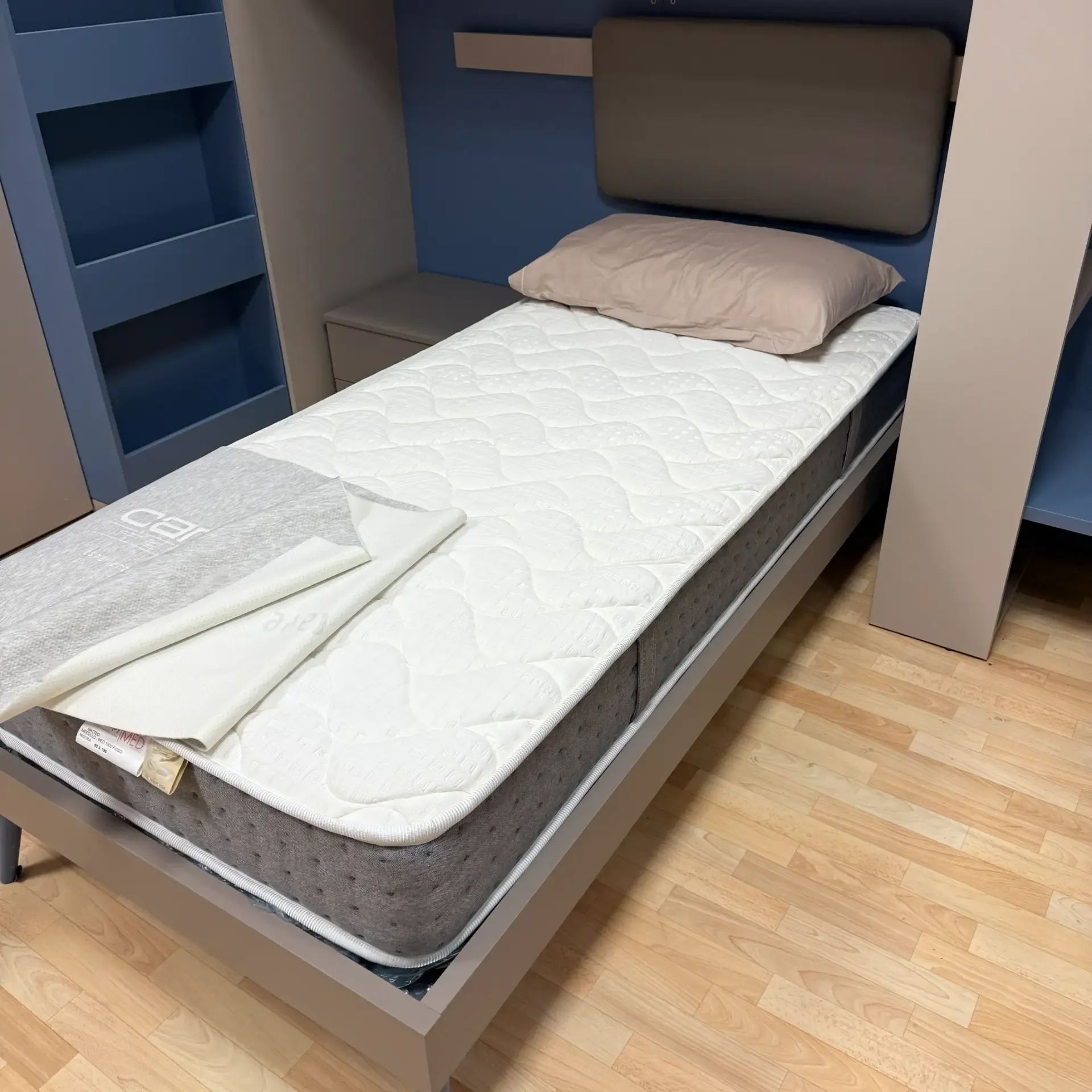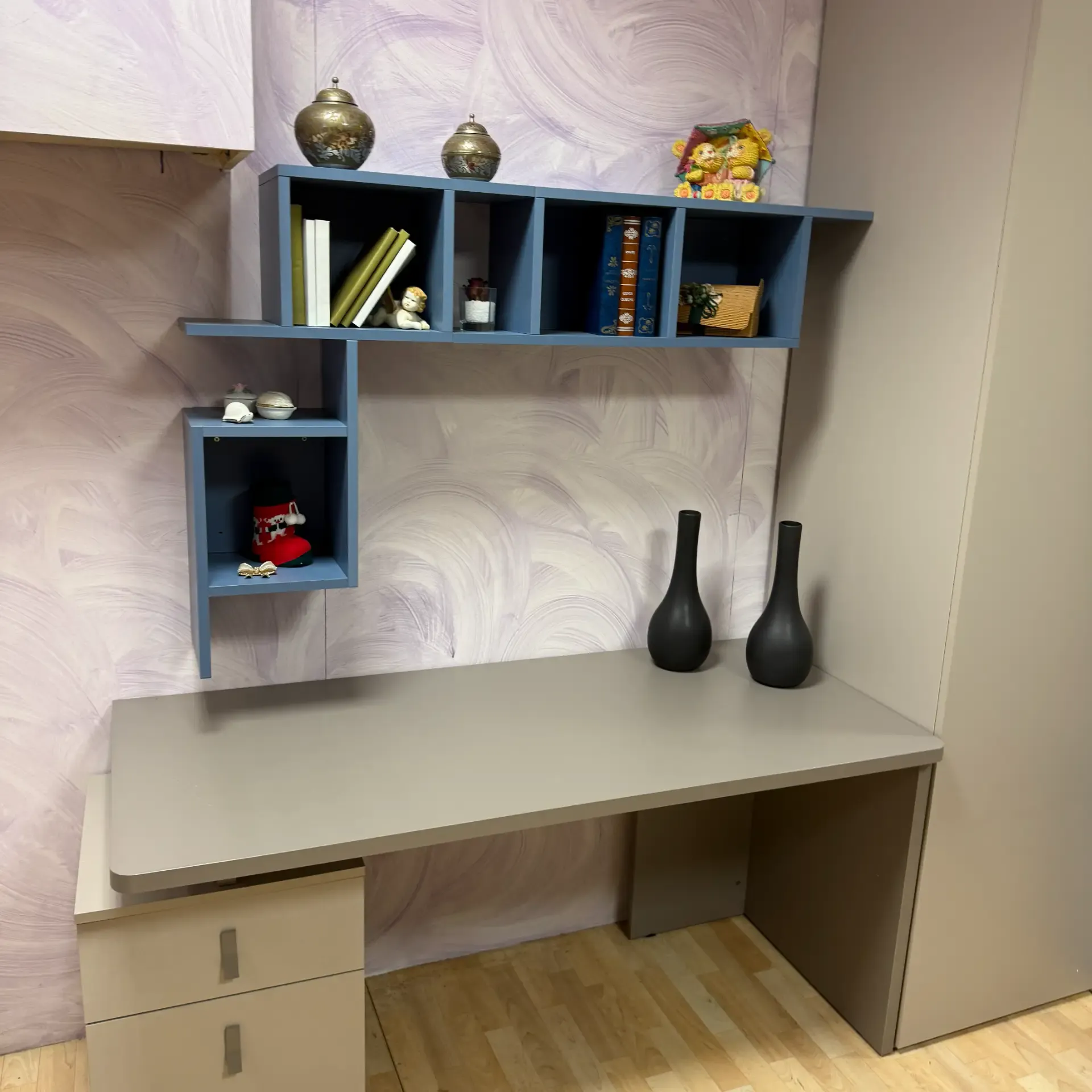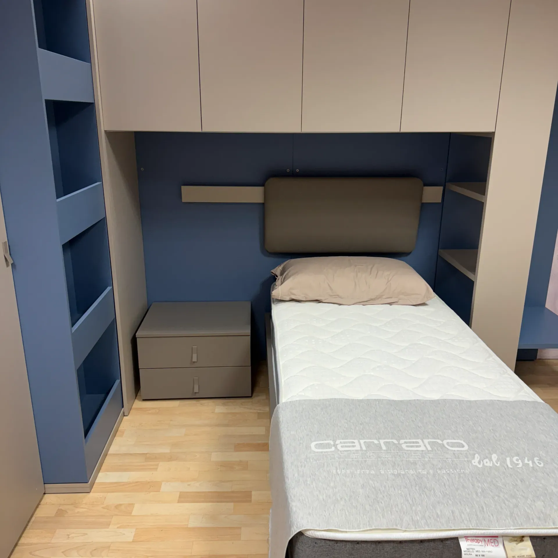 cameretta di design a ponte made in italy alta qualità , con cabina angolo scorrevole , letto , comodino , scrittoio , rete a doghe e materasso a molle insacchettate