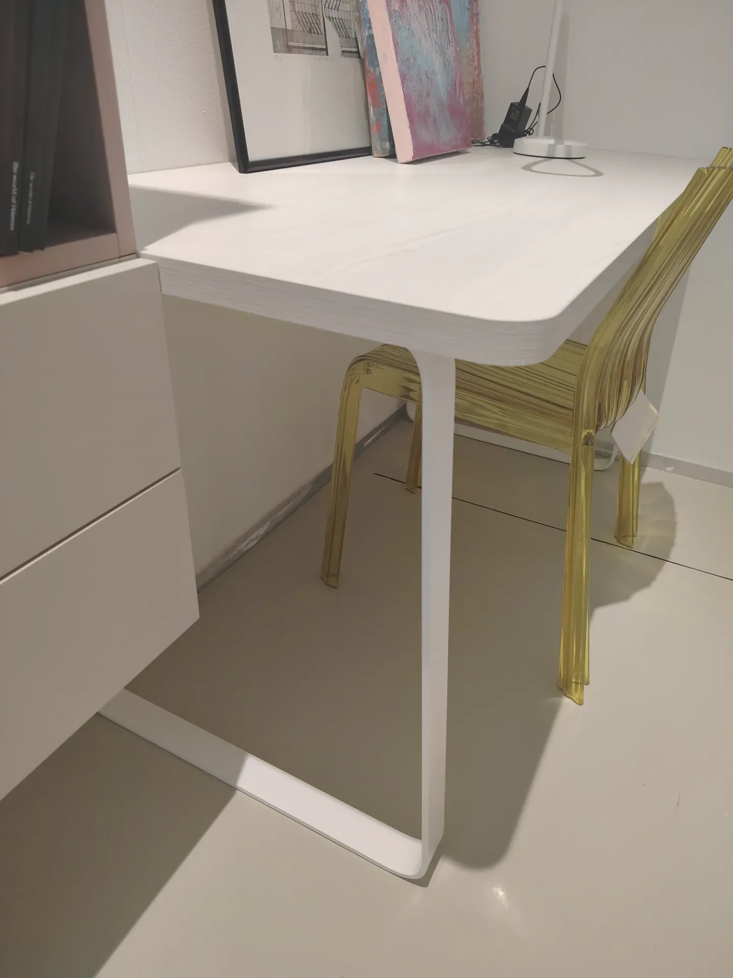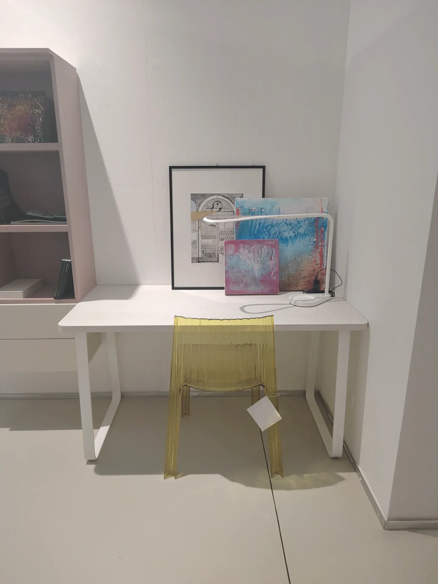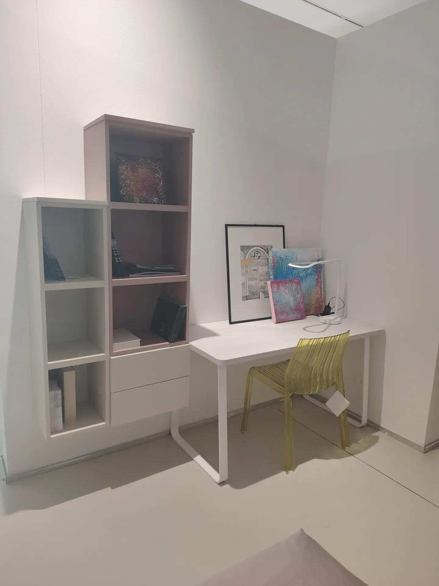 Composizione cameretta Mistral ad angolo con ponte, anta scorrevole libreria, completa di letto materasso e sedia Kartell, scrittoio con elementi pensili a giorno e cassetti.