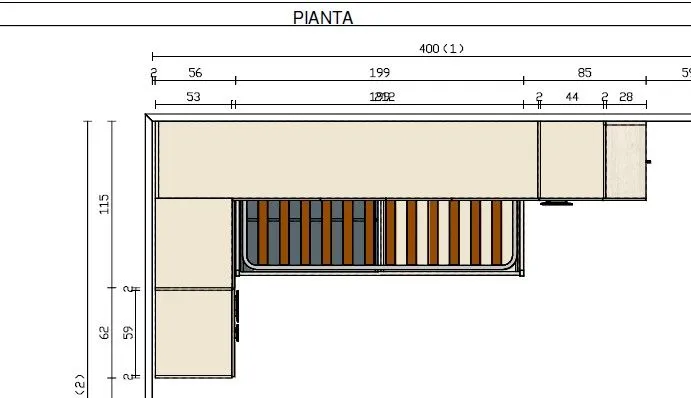 A sinistra è presente un modulo da 60 cm con tre cassetti, a destra un'anta da 45 cm con modulo terminale a libreria e scarpiera.