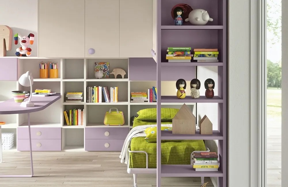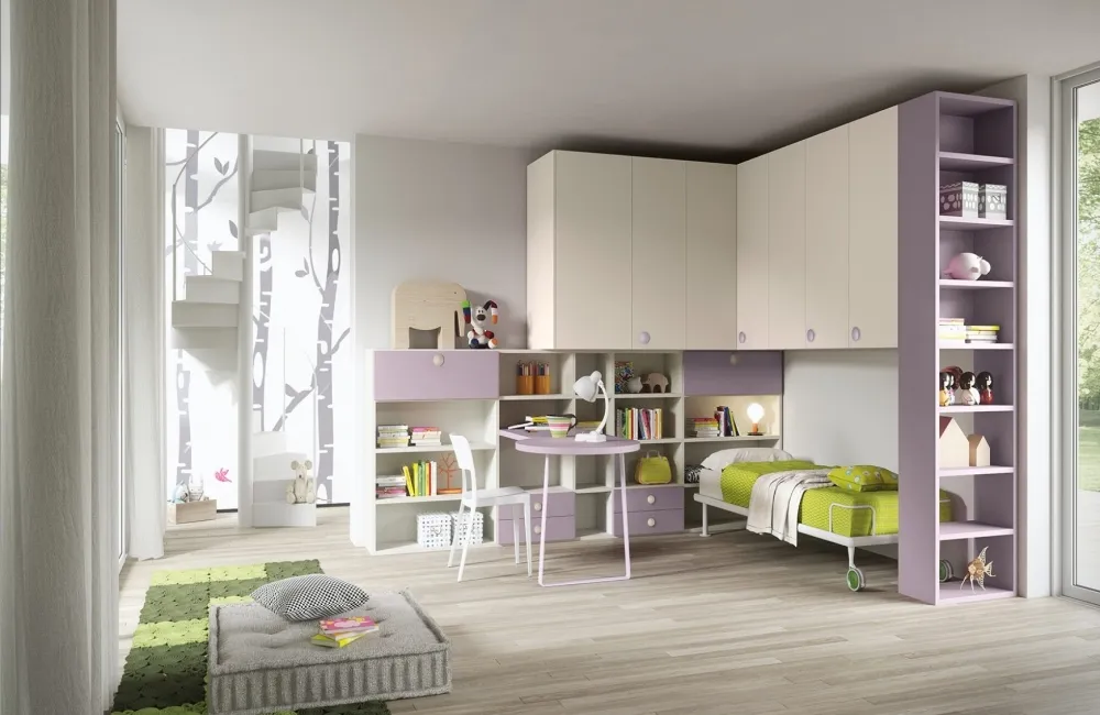 CAMERETTA A PONTE LIBRERIA SCRIVANIA LETTO CON DOGHE COLORI CHE POSSONO VARIARE LAMINATO BIANCO ALSKA LAMINATO PERLA LAMINATO GLICINE DIMENSIONI 334X268 TRASPORTO INCLUSO FINO A50 KM