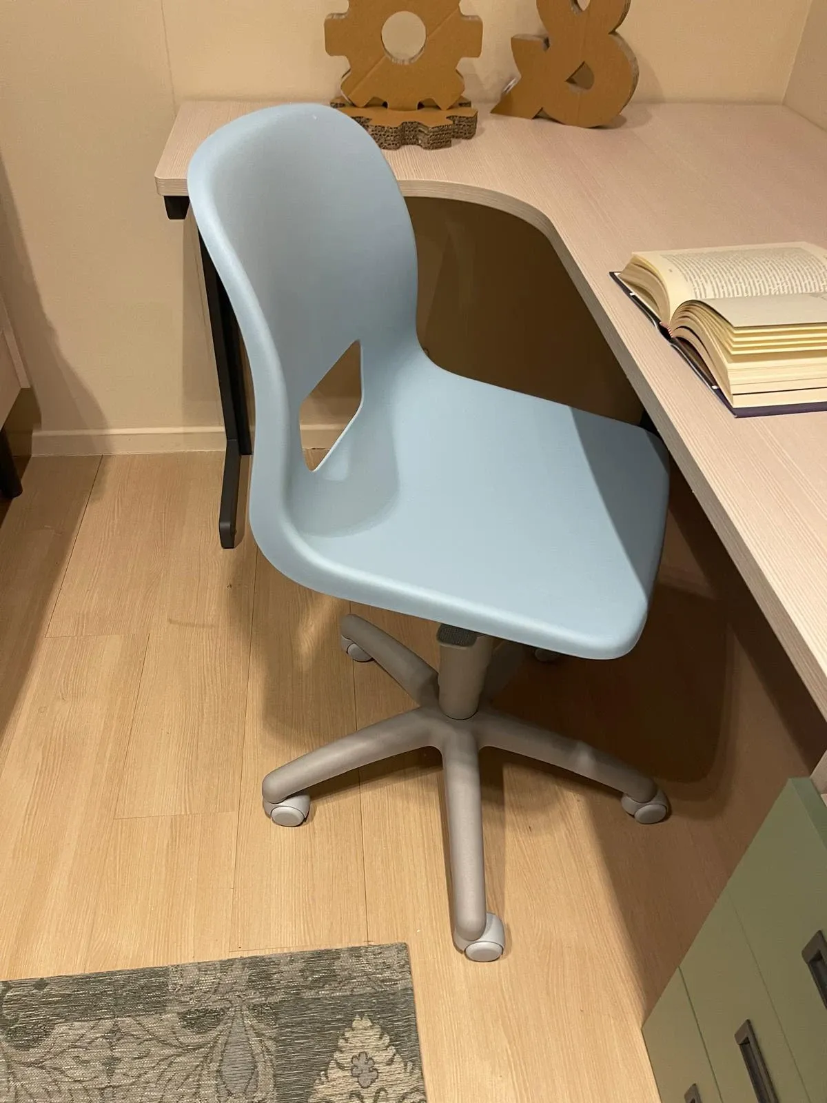 Una proposta completa che comprende armadio a sei ante, letto con materasso 90×200, comodino, scrivania angolare, sedia ergonomica e libreria. Il tutto coordinato con finiture moderne e accoglienti: larice, cielo, flora, grafite. Una palette pensata per creare un ambiente equilibrato, funzionale e bello da vivere ogni giorno.
