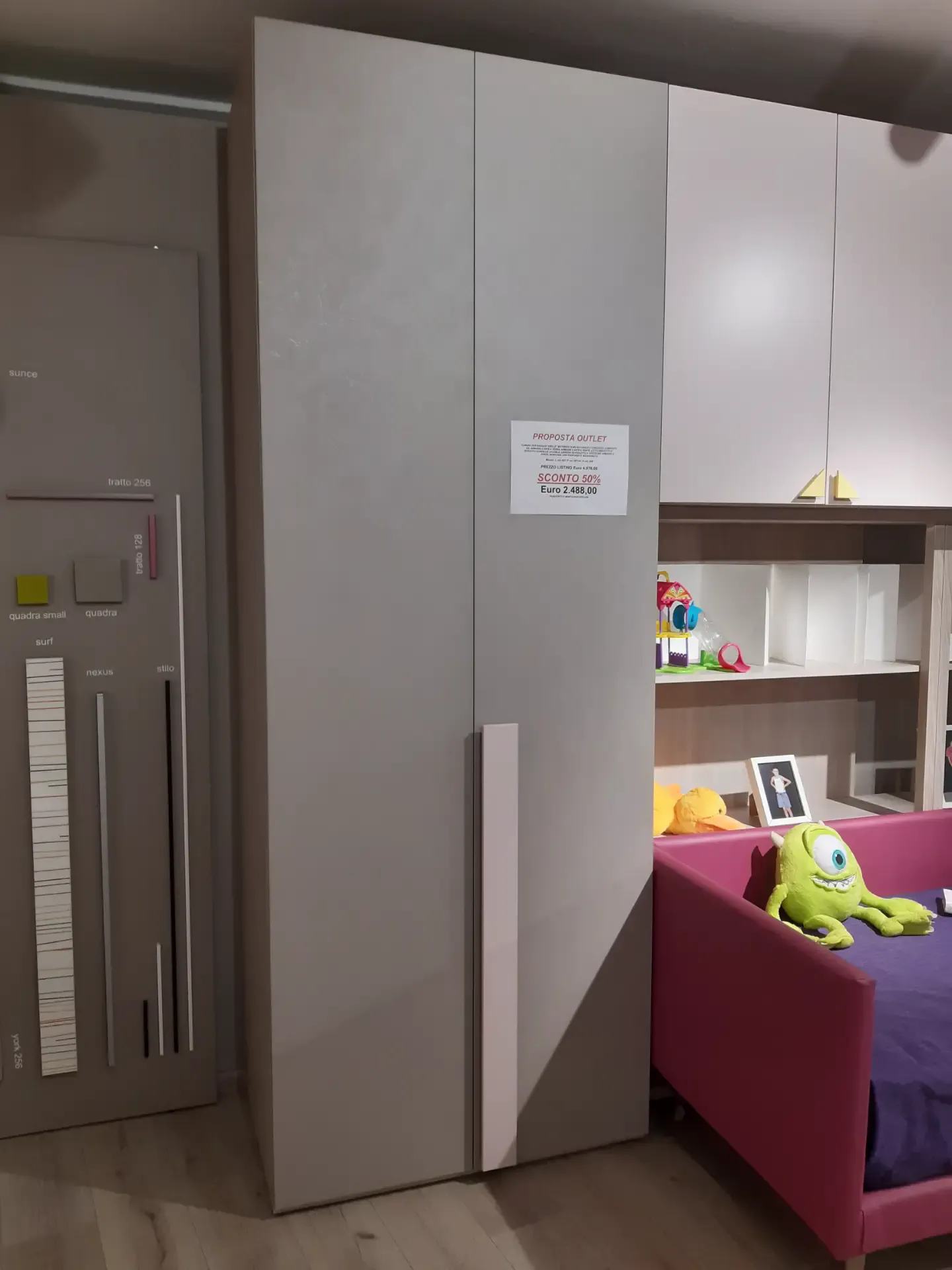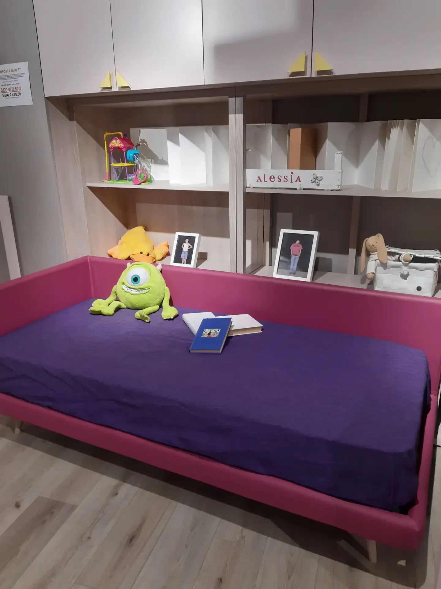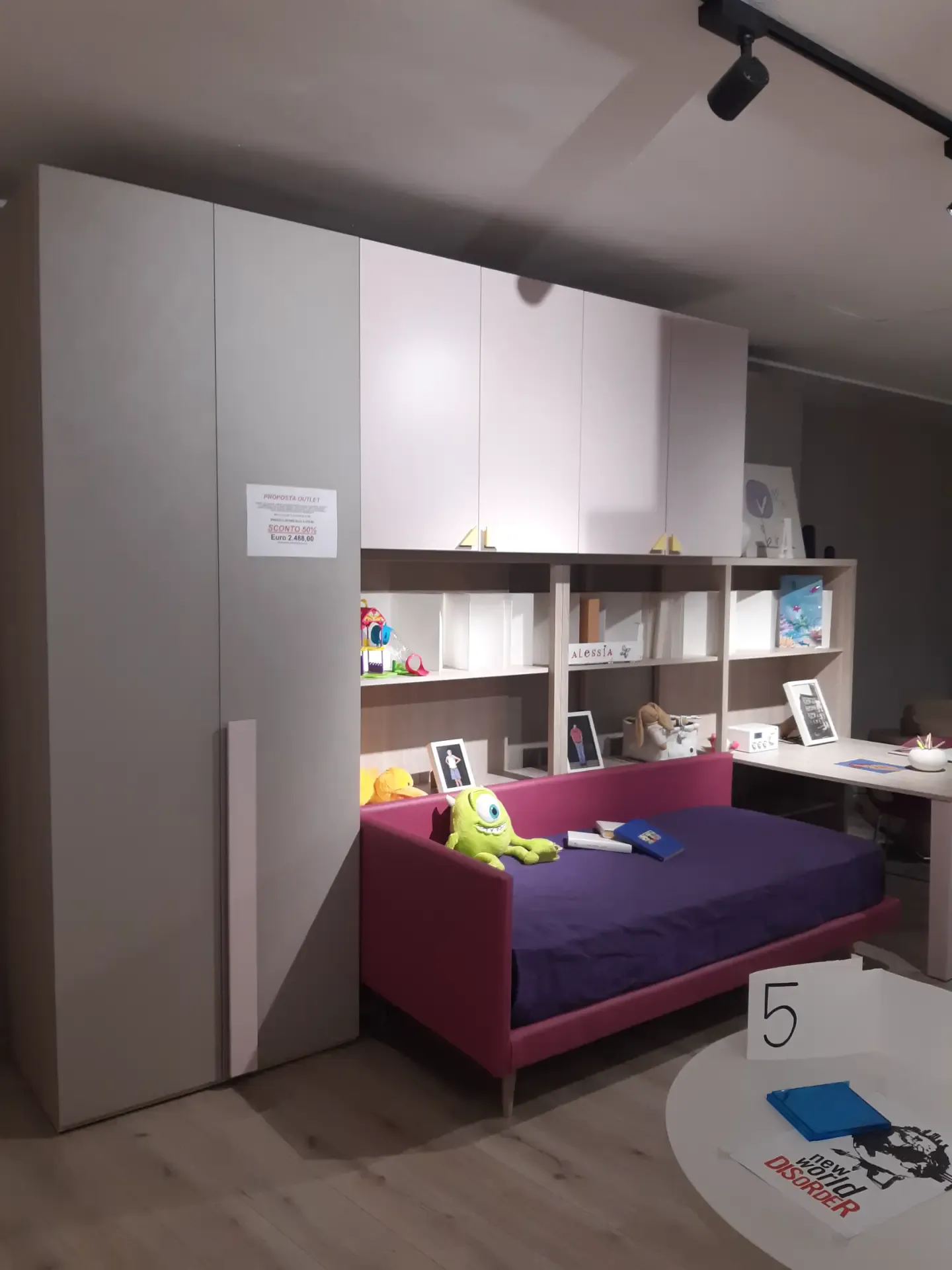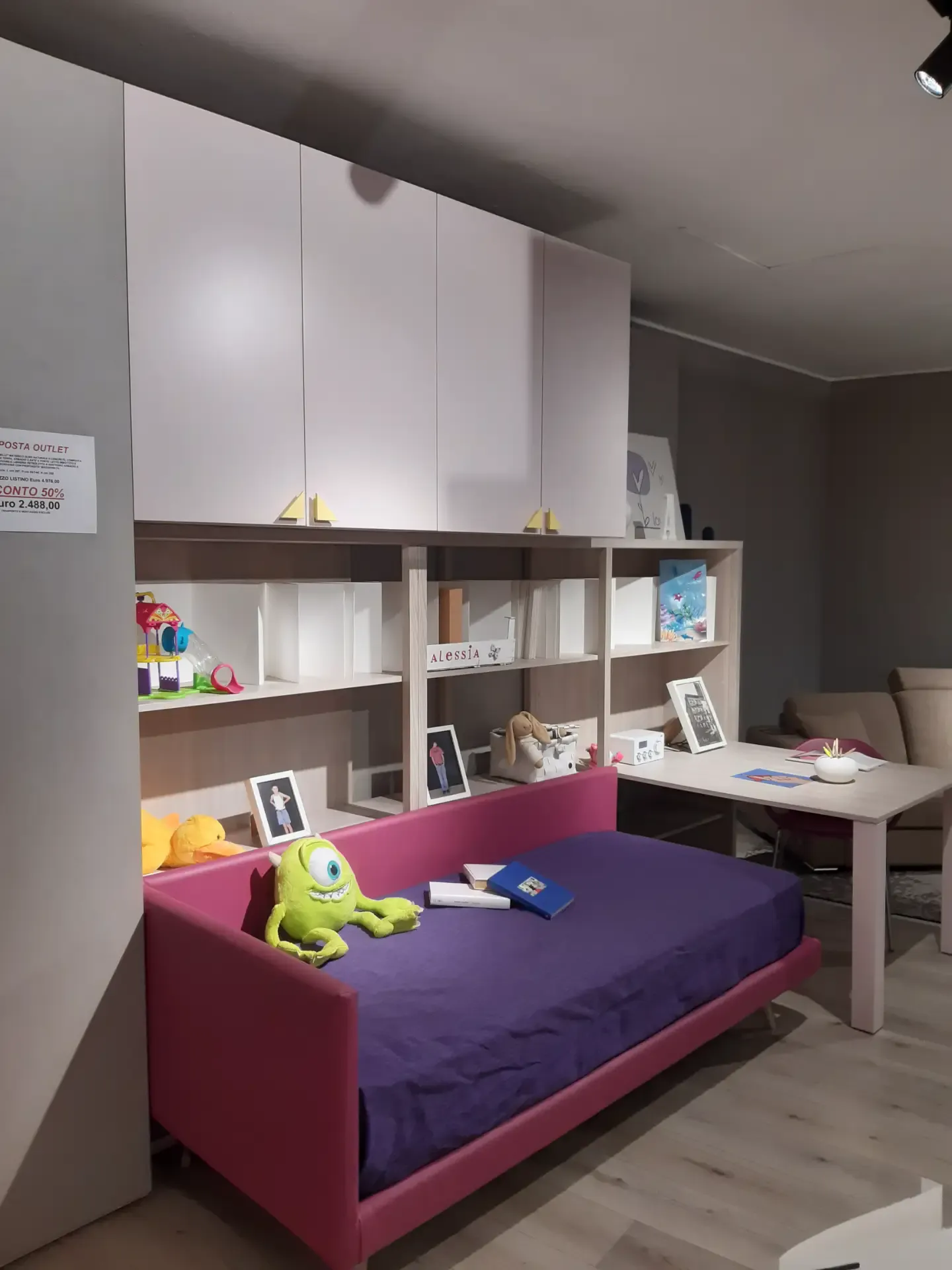 Soluzione lineare completa di tutto: armadio due ante a terra, armadio a quattro ante sospeso, libreria Palo retro letto, letto singolo a divanetto imbottito e rivestimento ecopelle sfoderabile e lavabile, libreria con scrivania inserita a larghezza maggiorata