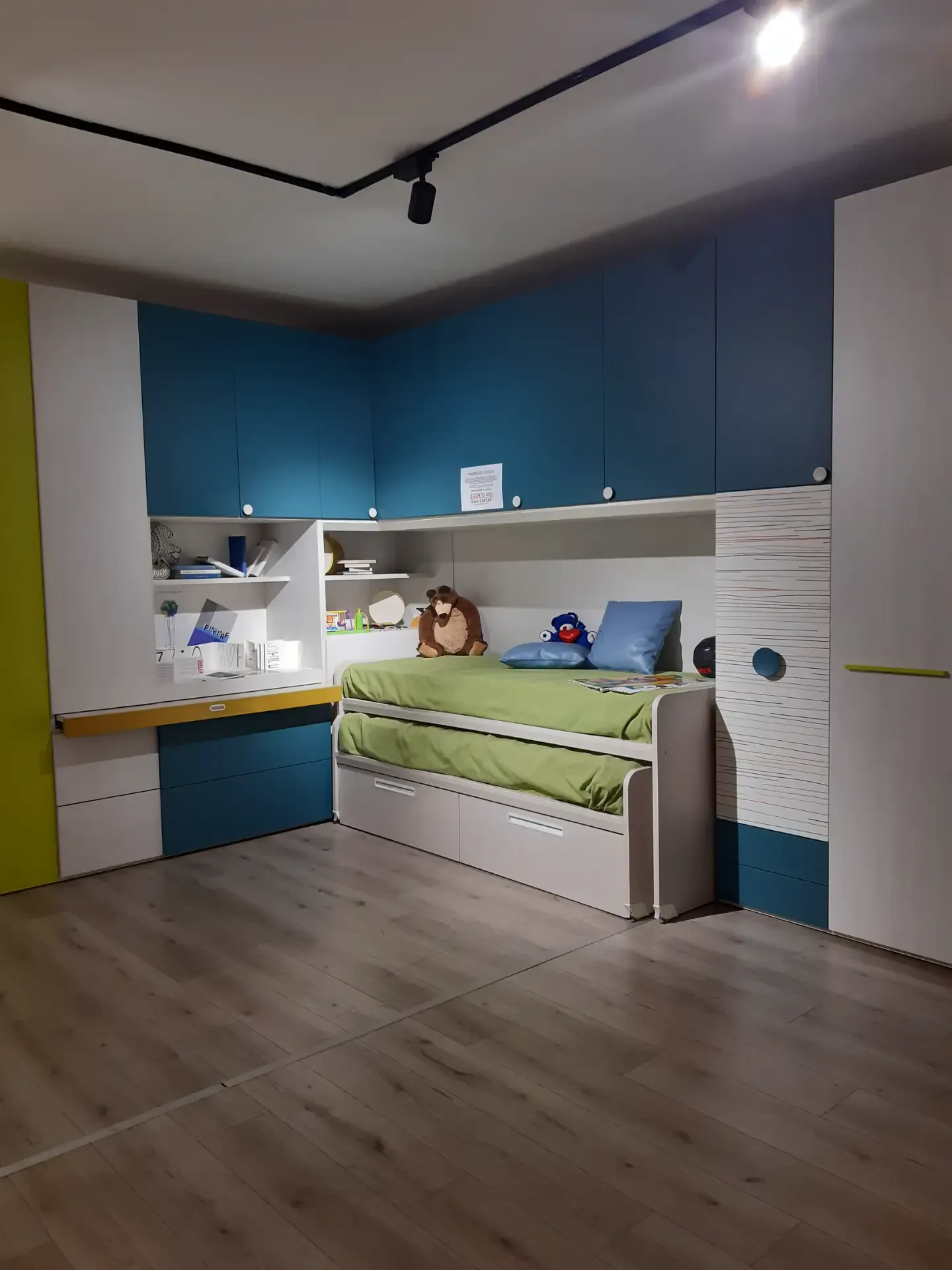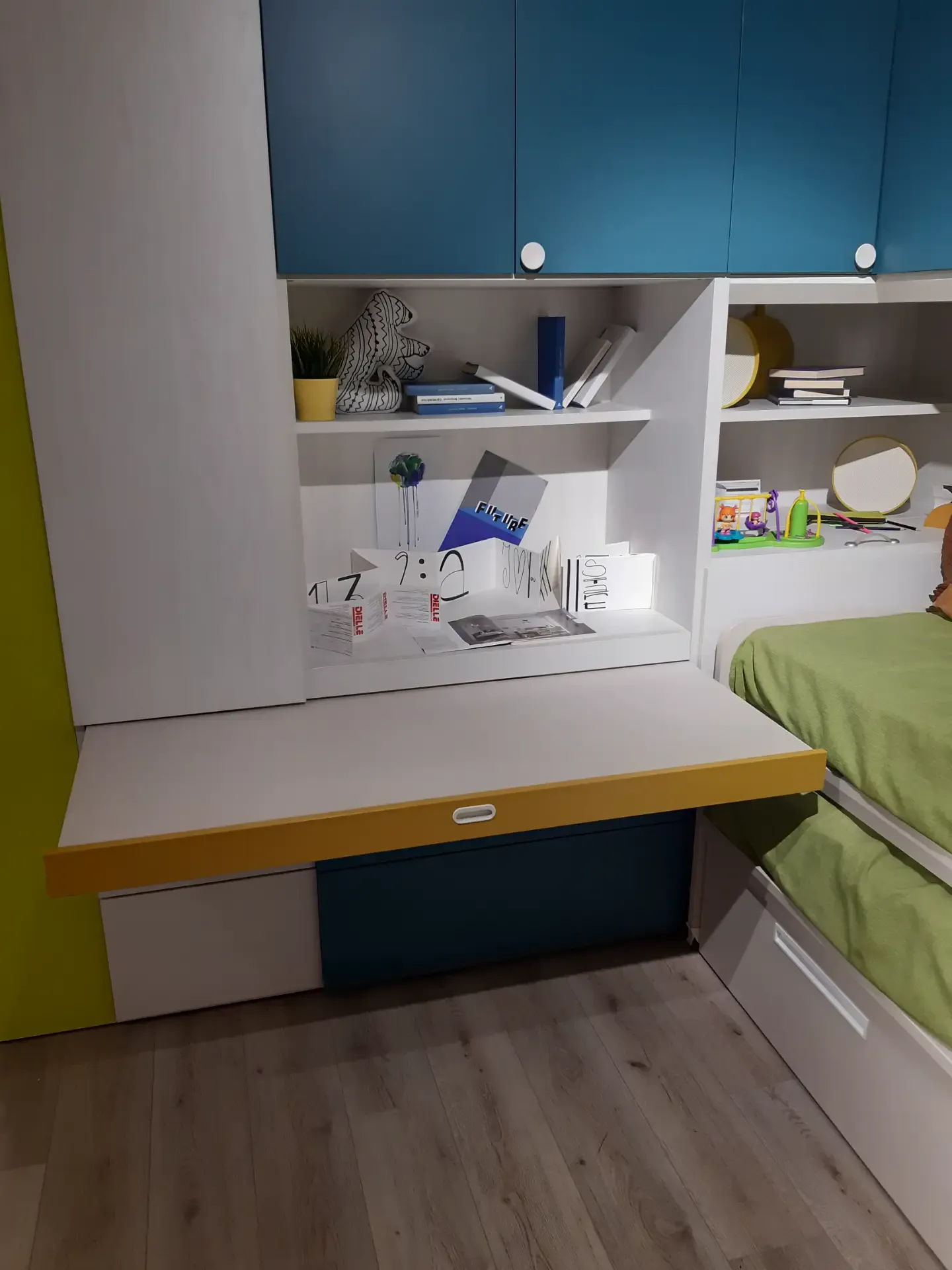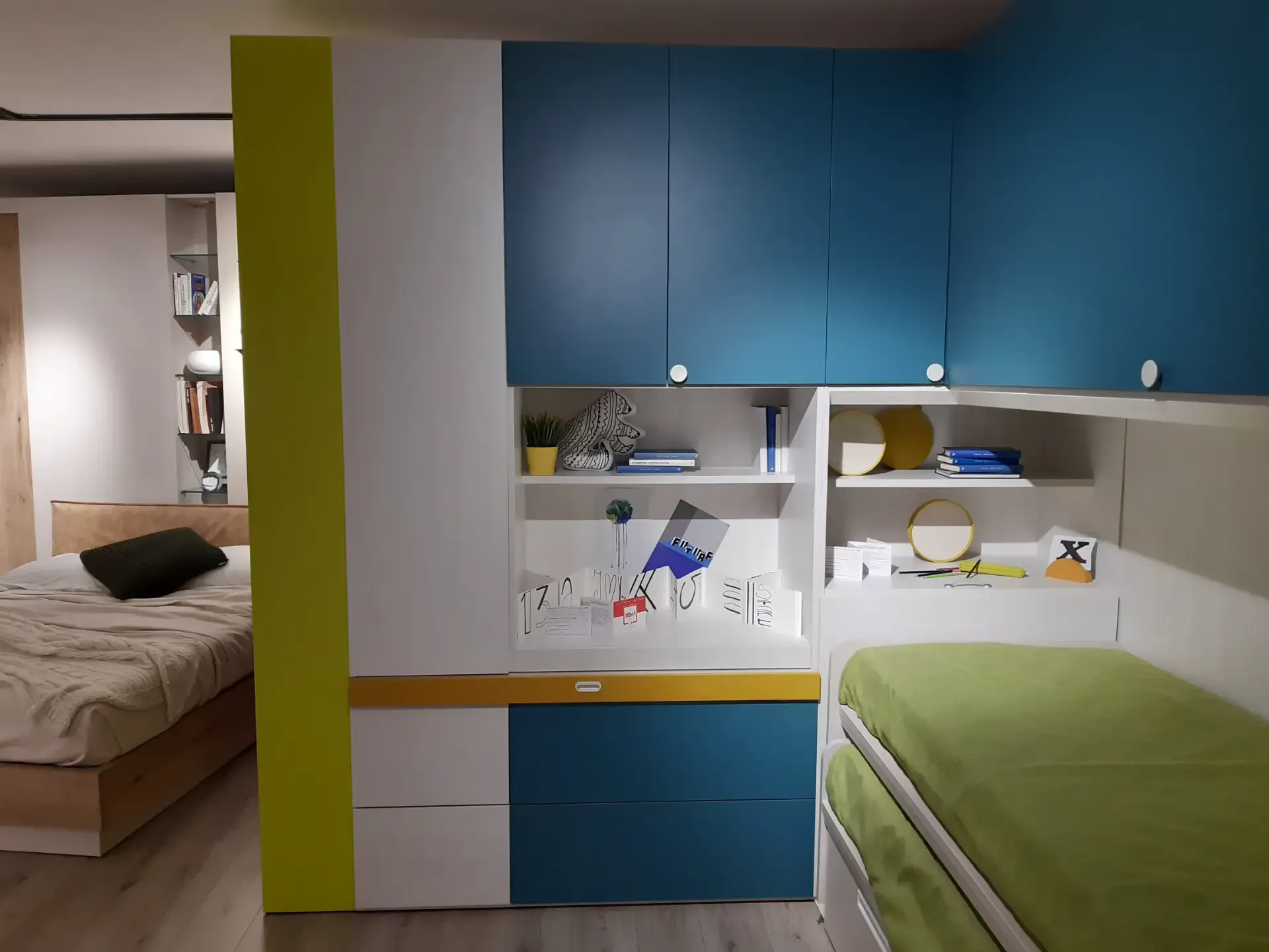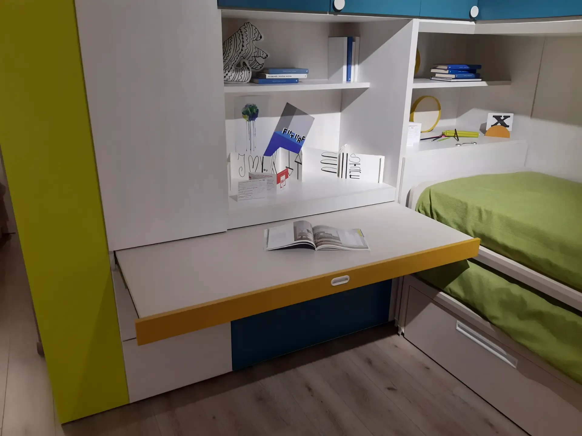 Camera a ponte angolare: la composizione prevede un ampio armadio con ante a terra ed a ponte; lo scrittoio estraibile; la libreria iniziale con spalle e ripiani a forte spessore, l'elemento angolare con portacuscino a ribalta; una libreria posta sopra il piano estraibile; due letti Arkimede scorrevoli ed indipendenti; letto inferiore con due pratici ed ampi cassettoni estraibili