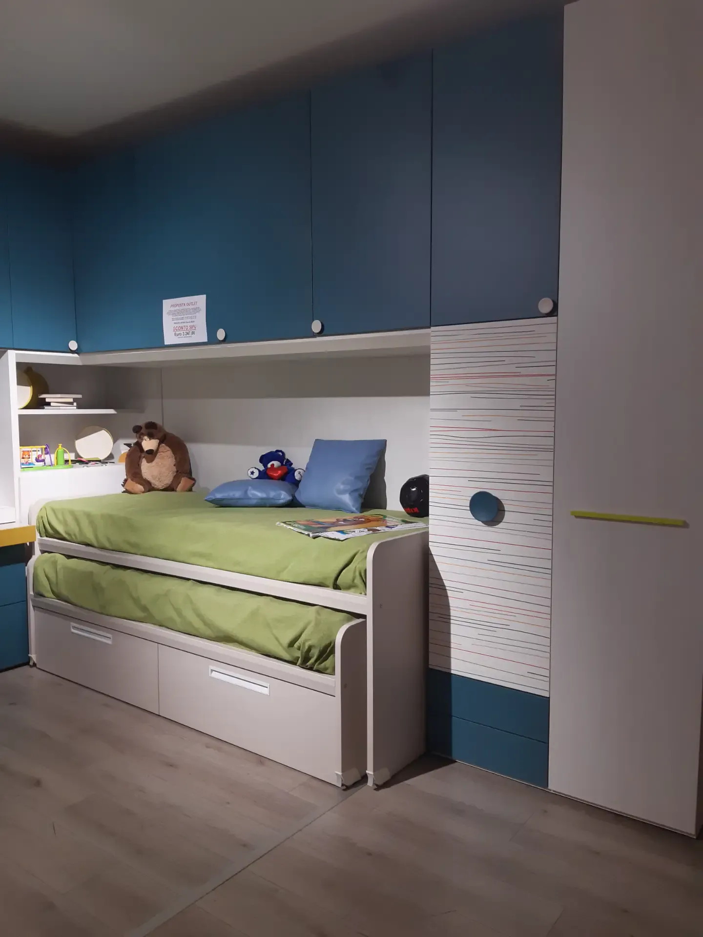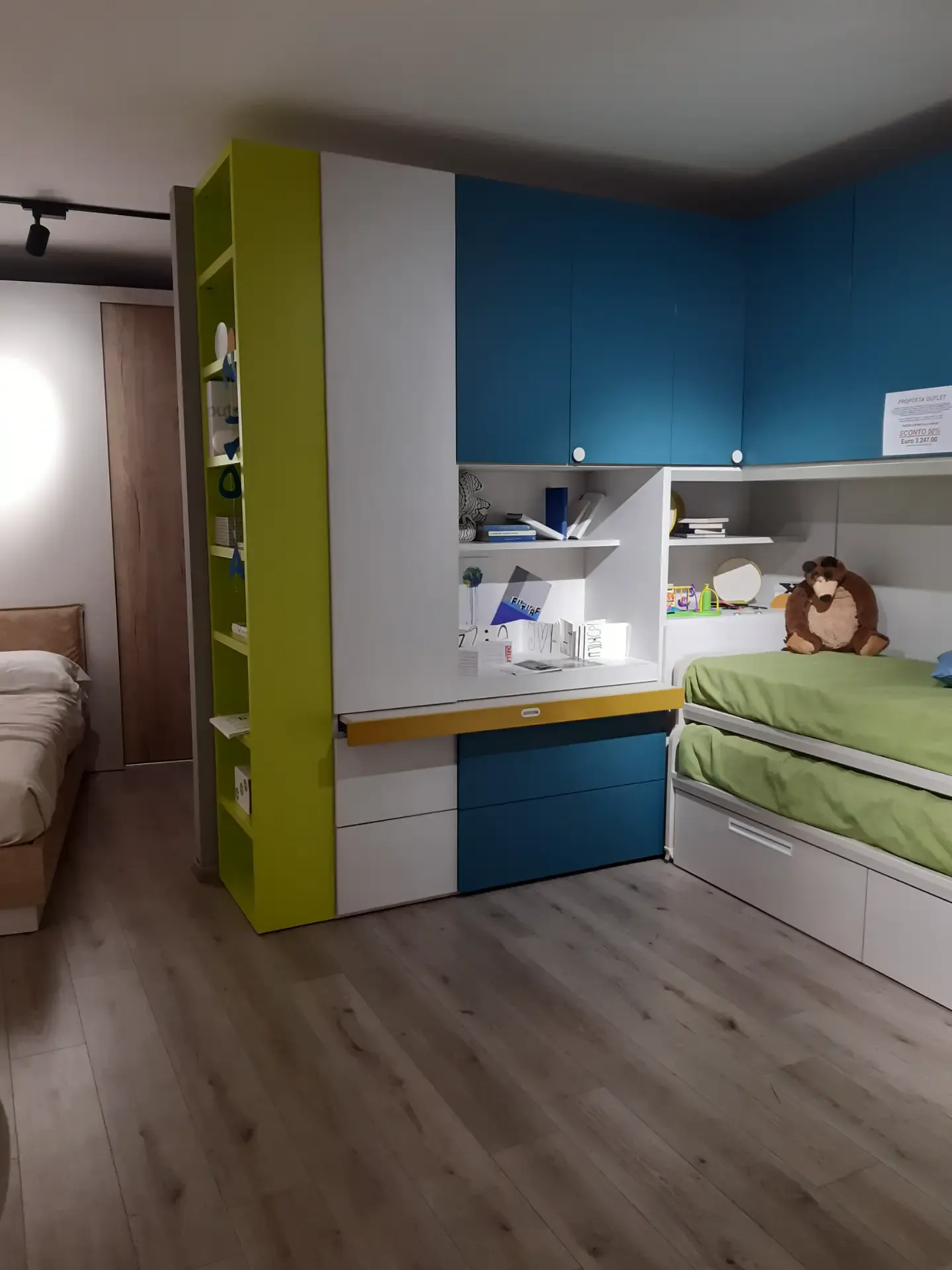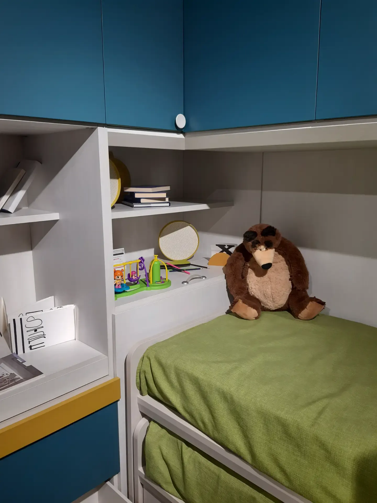 Camera a ponte angolare: la composizione prevede un ampio armadio con ante a terra ed a ponte; lo scrittoio estraibile; la libreria iniziale con spalle e ripiani a forte spessore, l'elemento angolare con portacuscino a ribalta; una libreria posta sopra il piano estraibile; due letti Arkimede scorrevoli ed indipendenti; letto inferiore con due pratici ed ampi cassettoni estraibili