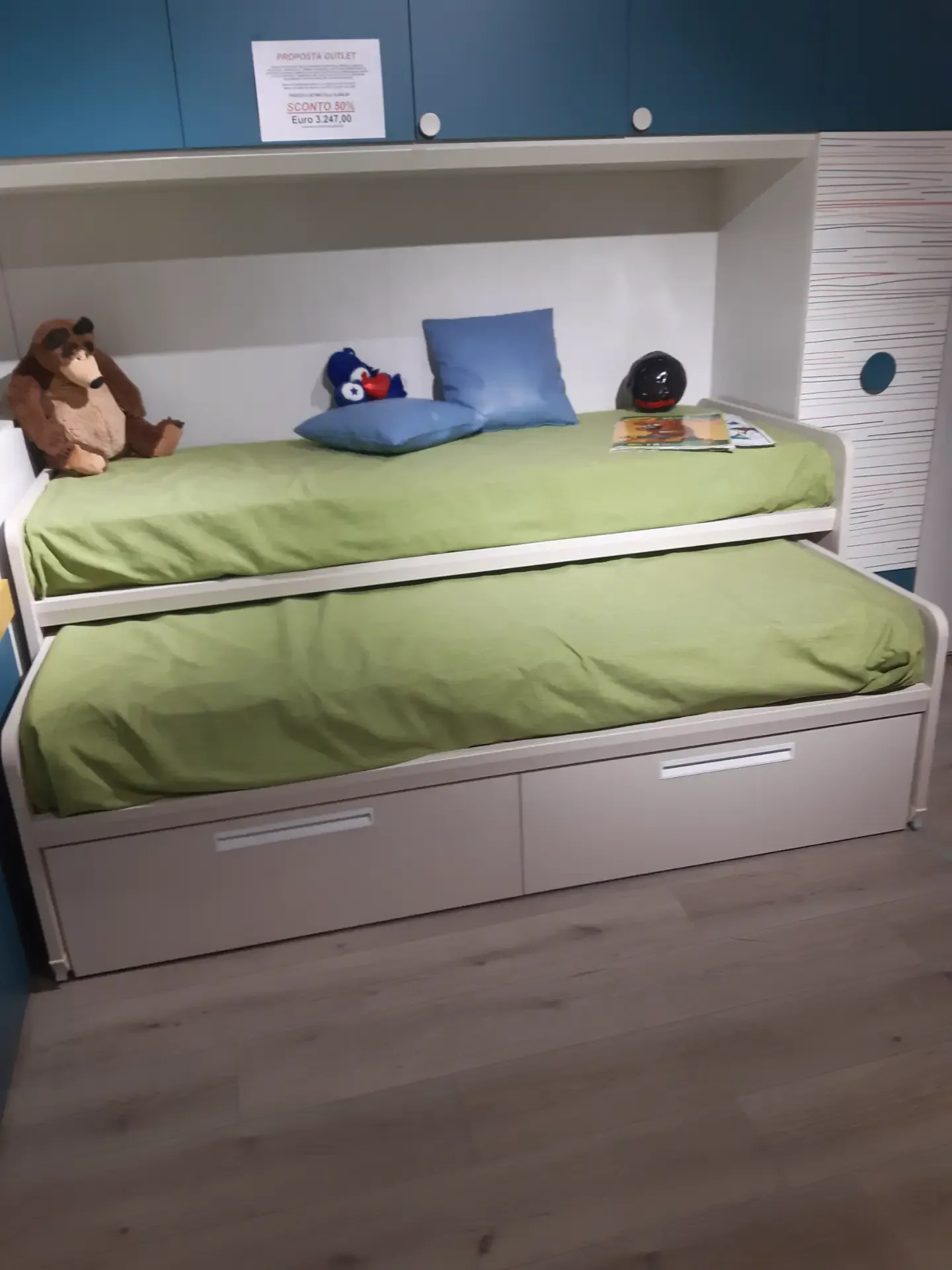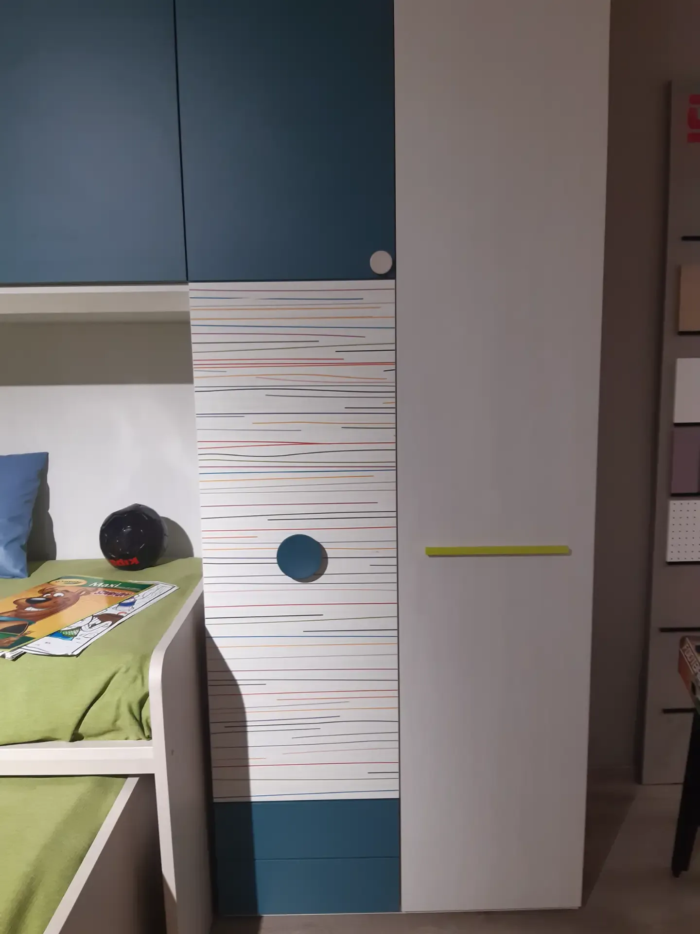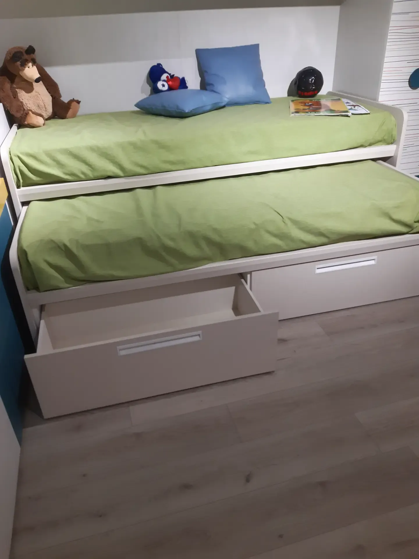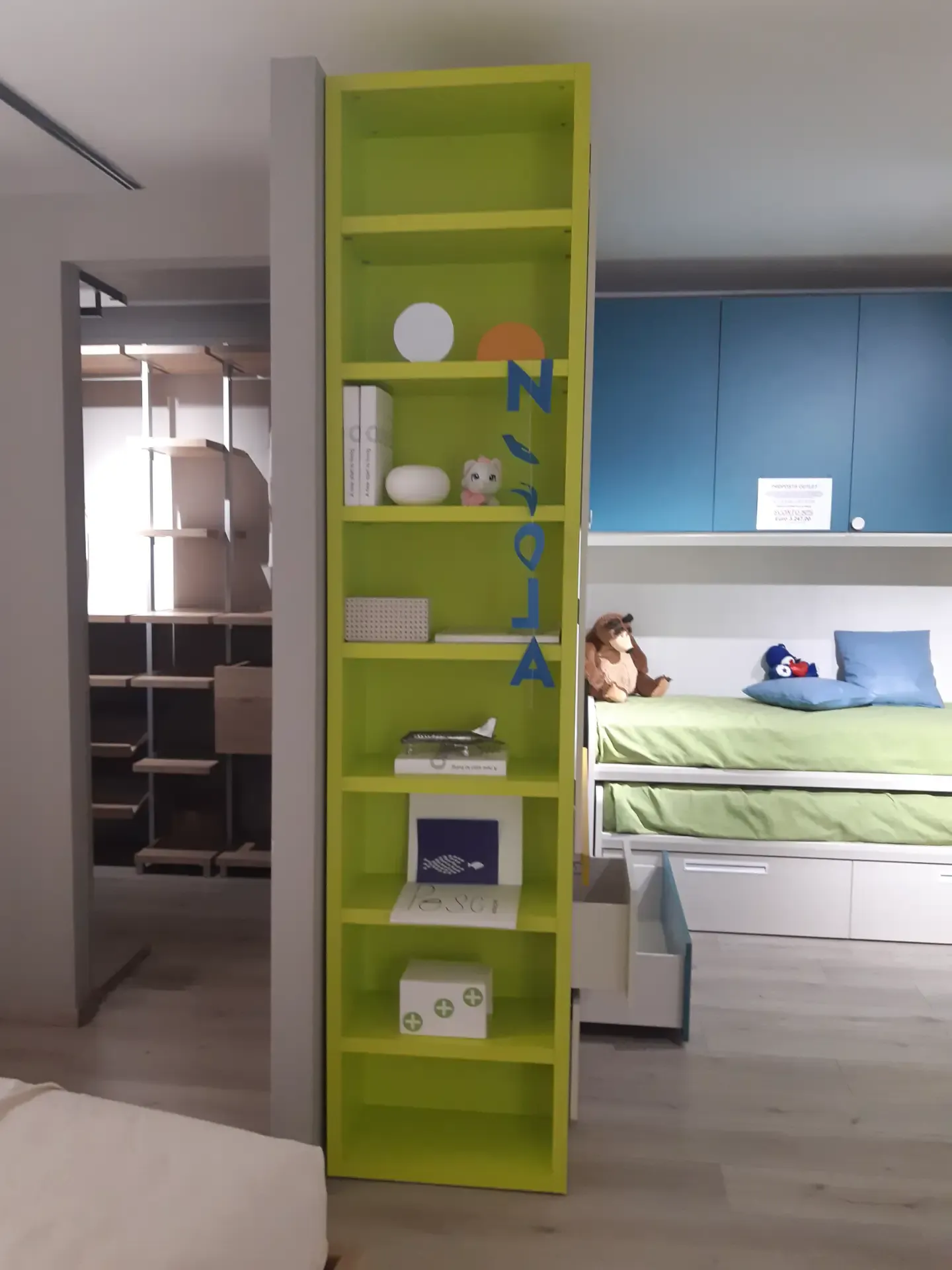 Camera a ponte angolare: la composizione prevede un ampio armadio con ante a terra ed a ponte; lo scrittoio estraibile; la libreria iniziale con spalle e ripiani a forte spessore, l'elemento angolare con portacuscino a ribalta; una libreria posta sopra il piano estraibile; due letti Arkimede scorrevoli ed indipendenti; letto inferiore con due pratici ed ampi cassettoni estraibili