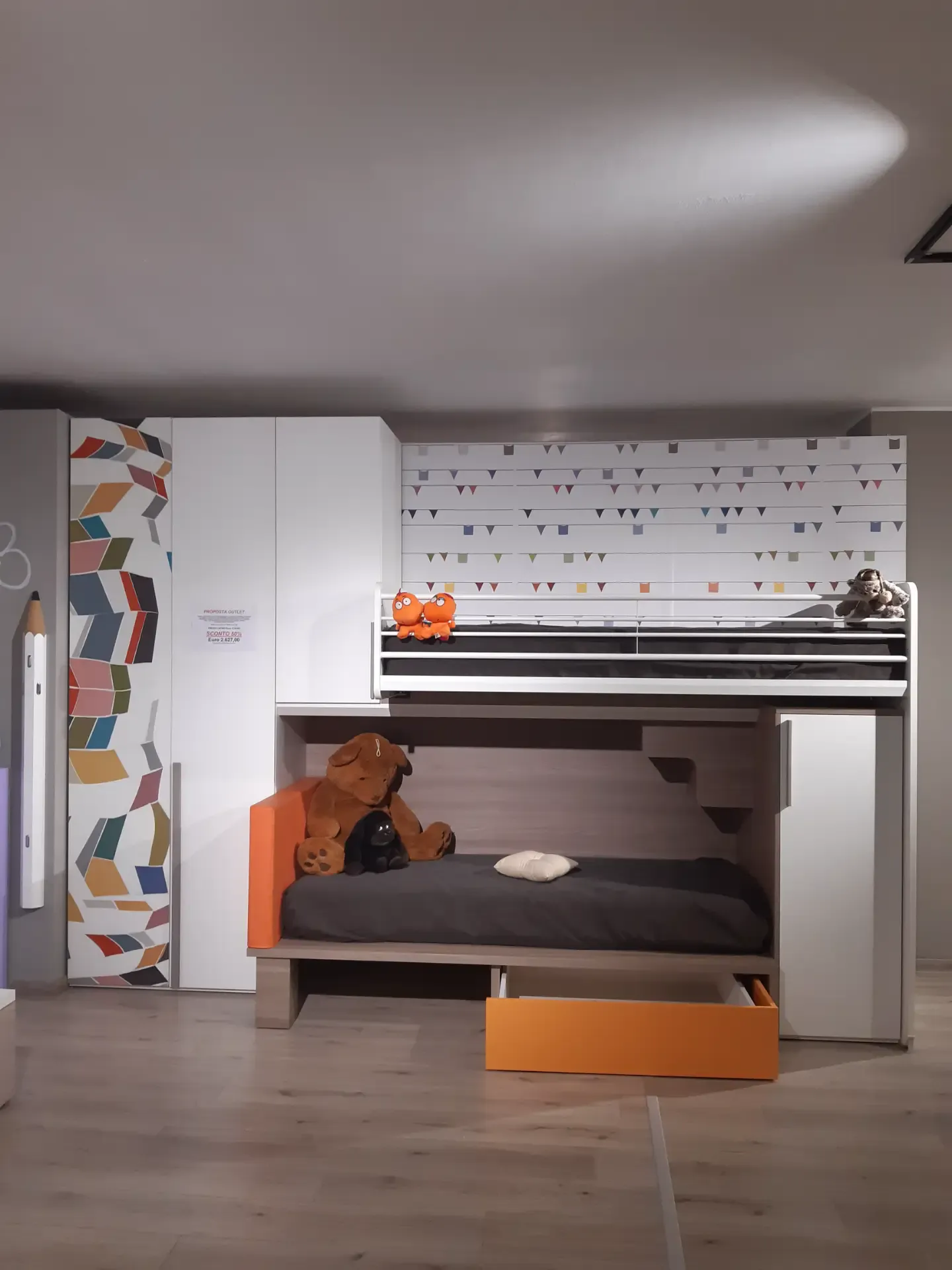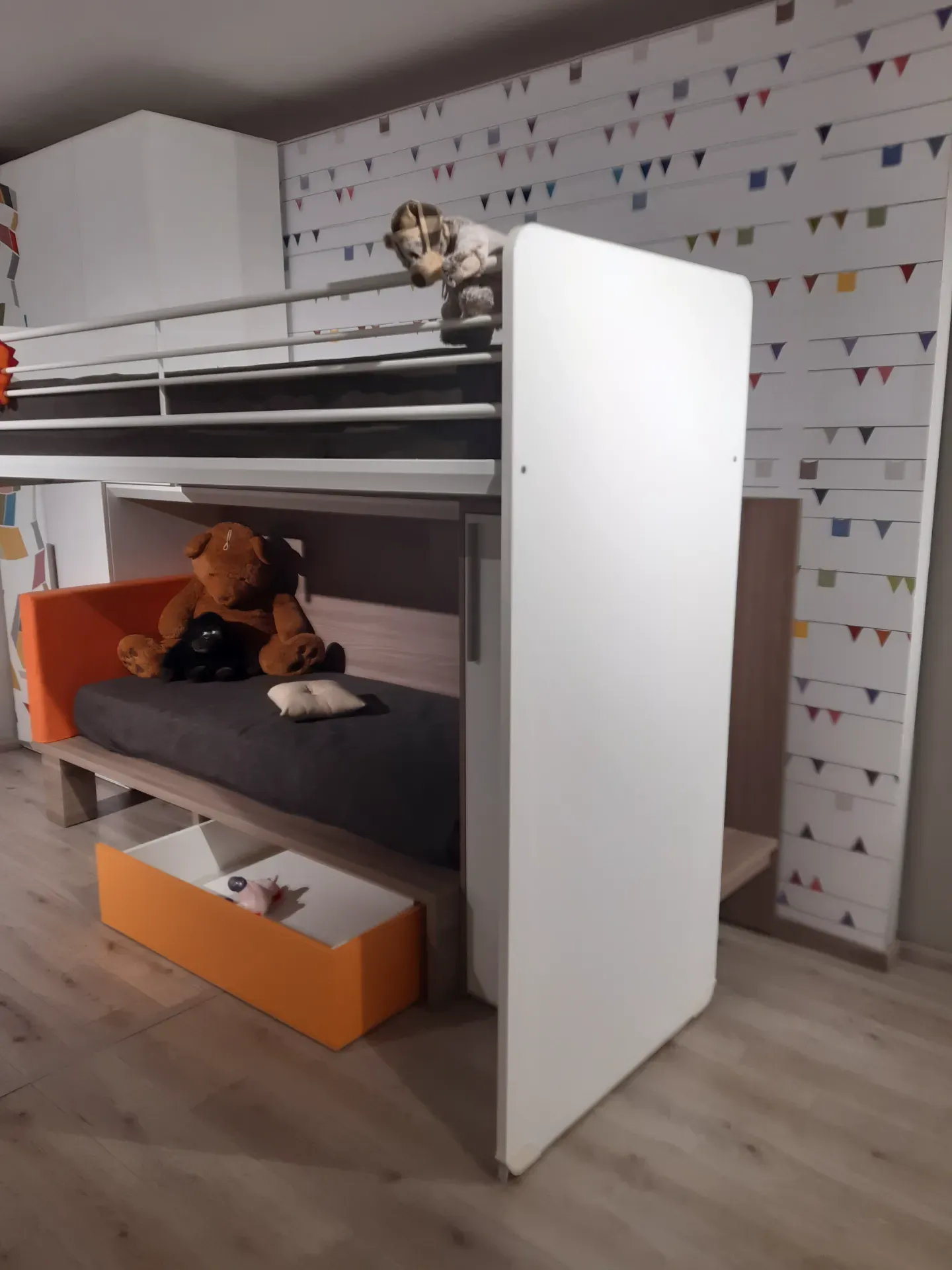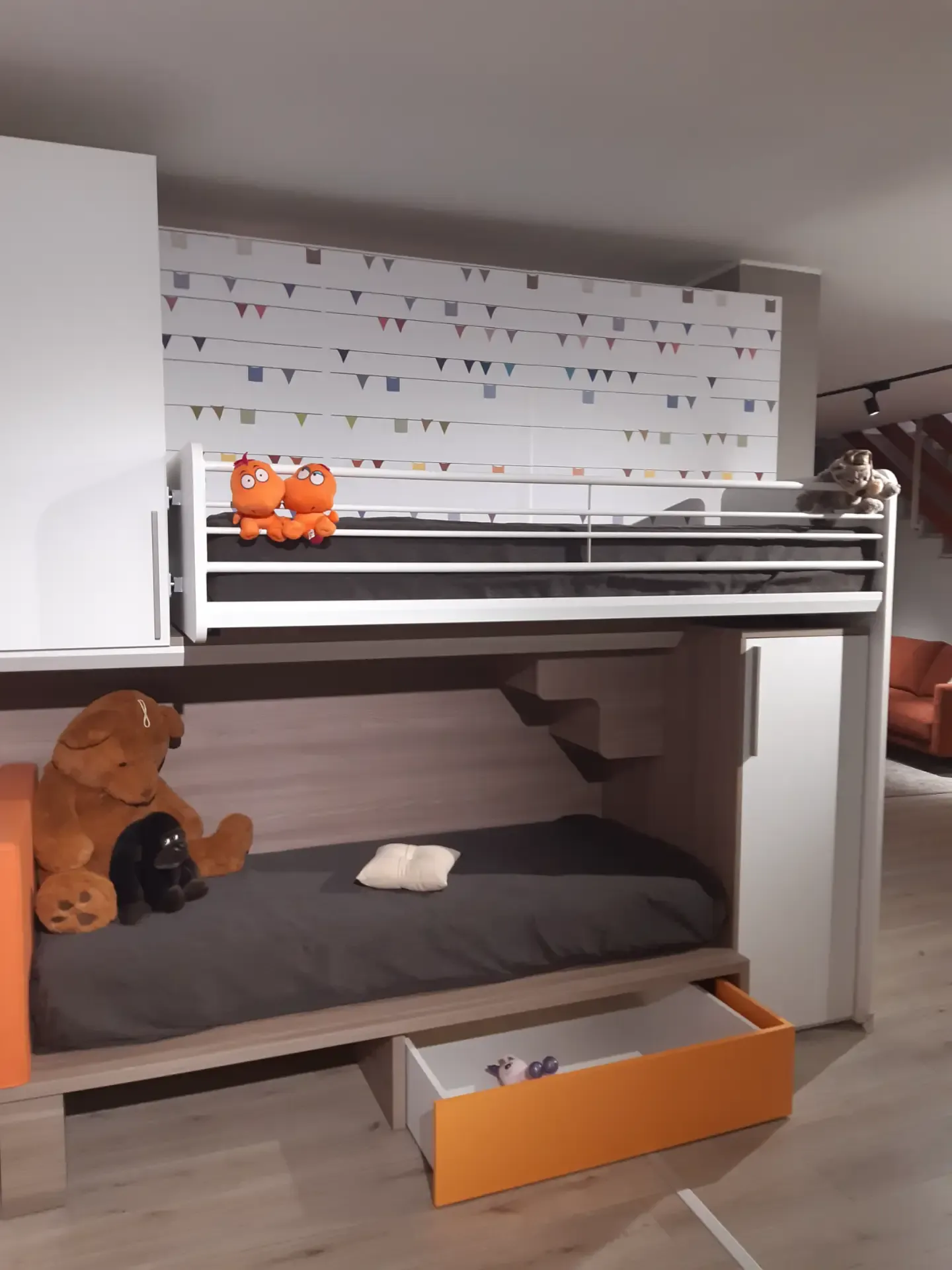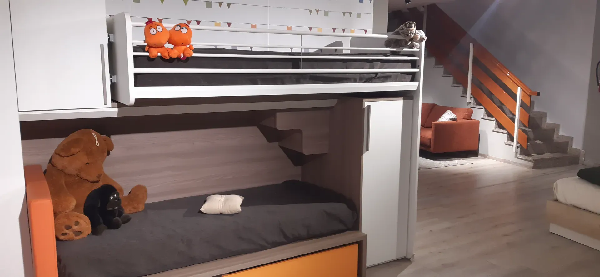 Armadio due ante a terra più un elemento a ponte ed un elemento basso a destra della composizione; letto basso con testiera imbottita e rivestita ecopelle mandarino completo di ampio contenitore estraibile; letto alto con rete a doghe, scorrevole e facilmente raggiungibile tramite la comoda scaletta nascosta. Quest'ultima sparisce nel momento in cui il letto superiore è tenuto chiuso aderente al muro, ma è molto utile per poter rifare comodamente anche il letto più in alto.