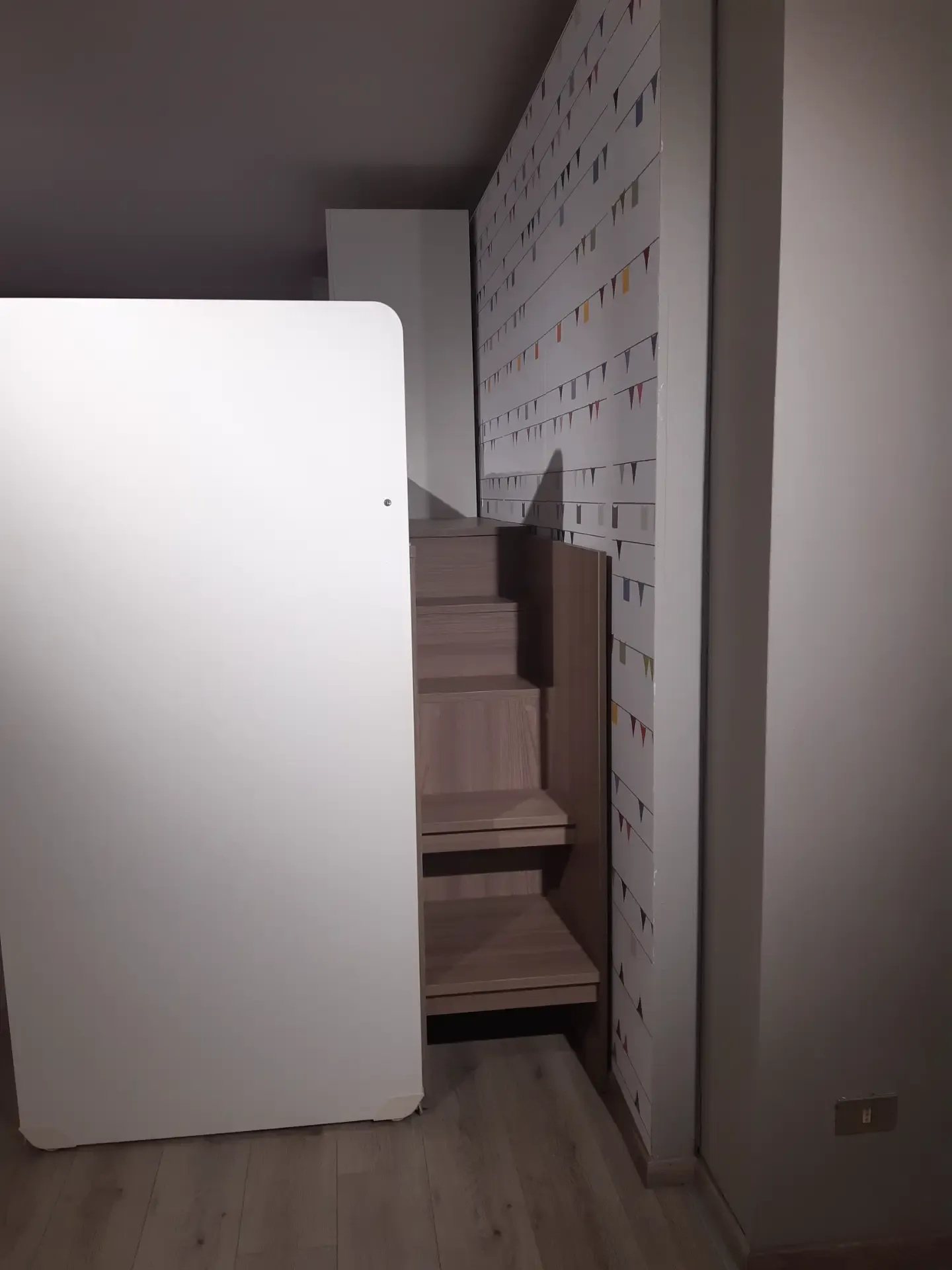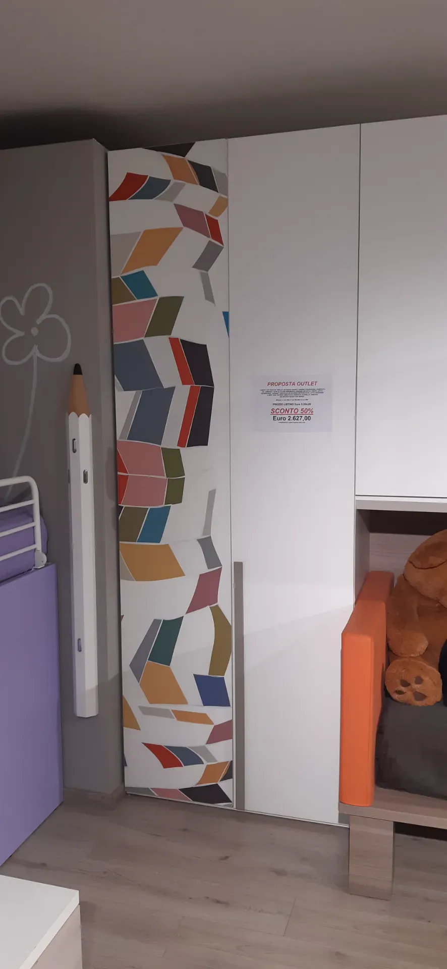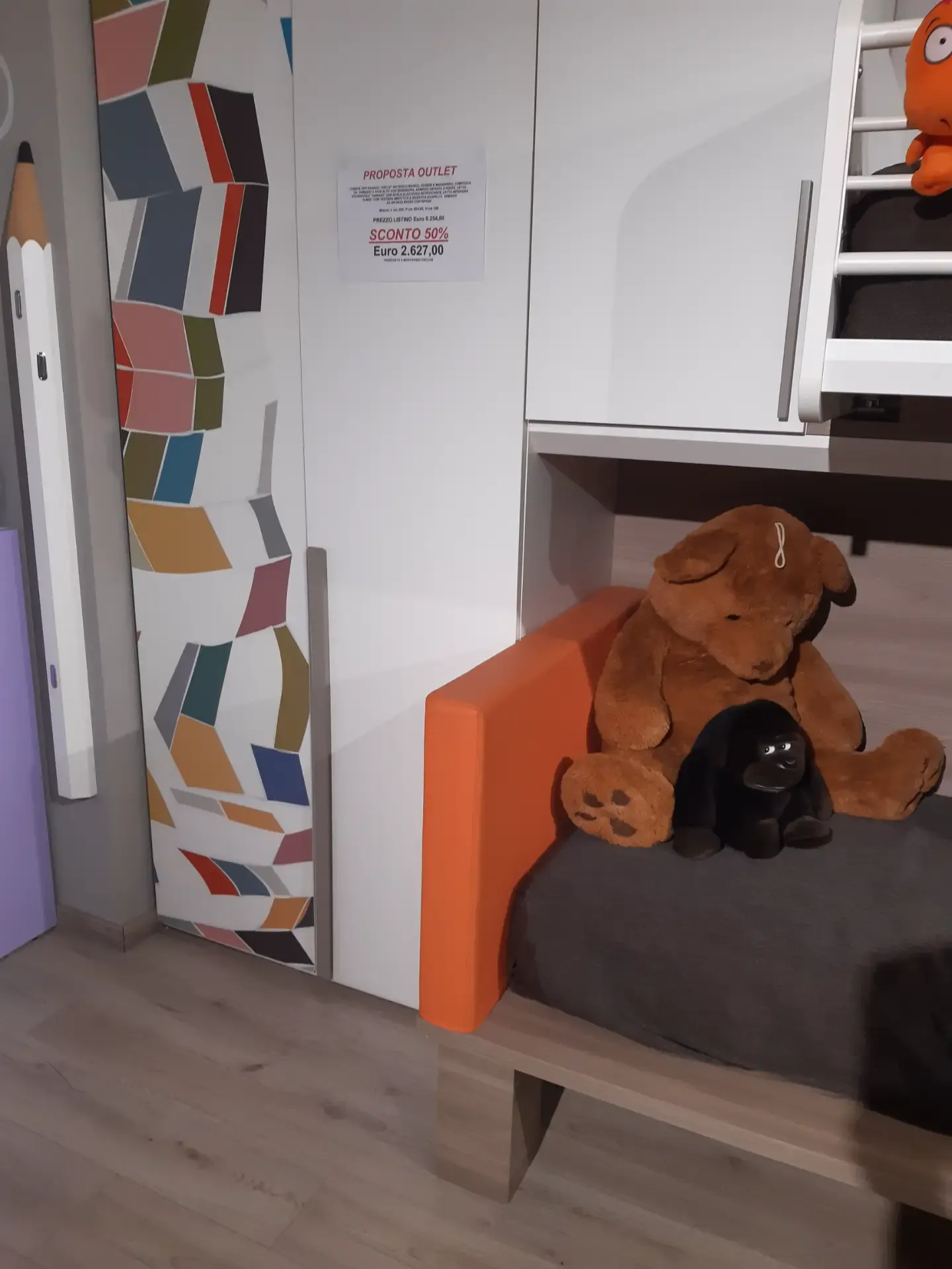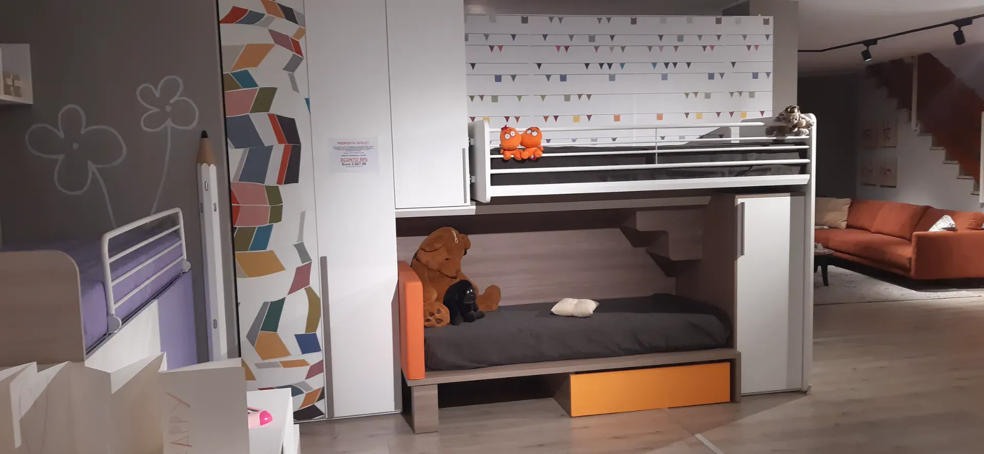 Armadio due ante a terra più un elemento a ponte ed un elemento basso a destra della composizione; letto basso con testiera imbottita e rivestita ecopelle mandarino completo di ampio contenitore estraibile; letto alto con rete a doghe, scorrevole e facilmente raggiungibile tramite la comoda scaletta nascosta. Quest'ultima sparisce nel momento in cui il letto superiore è tenuto chiuso aderente al muro, ma è molto utile per poter rifare comodamente anche il letto più in alto.