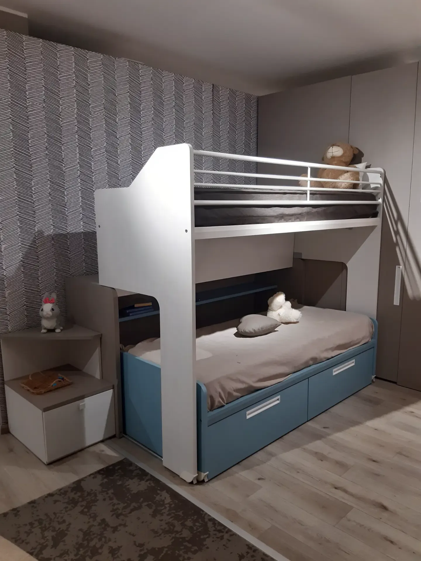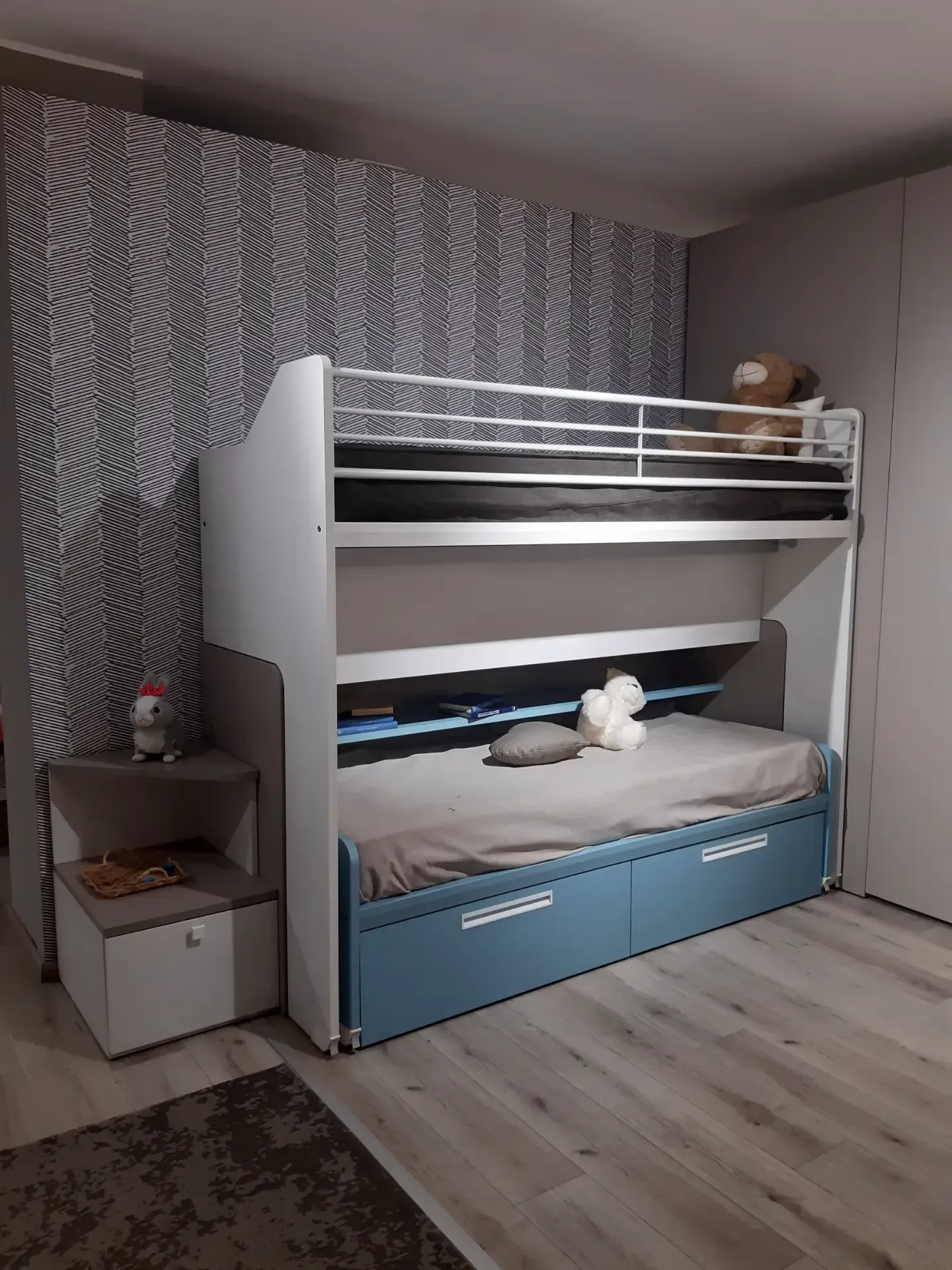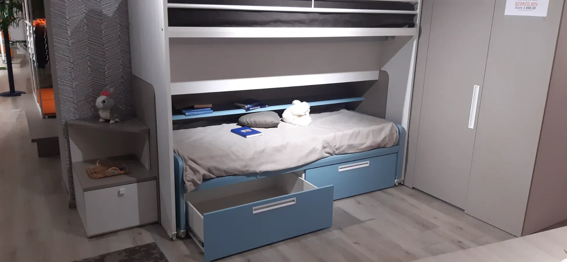 Questa soluzione racchiude in poco spazio molteplici funzioni: il letto Genius estraibile con piattaforma posteriore per il rifacimento facilitato accessibile dalla scala a cassetto laterale; il letto inferiore completo di due pratici e capienti cassettoni; la mensola sotto il letto, utile per riporre libri, lampade oggetti vari; la grande cabina-armadio X-Cab completamente attrezzata internamente con ripiani, tubi appendiabito, luce led, cassettiera. A richiesta, è disponibile anche una zona studio con scrivania, libreria e pensili a giorno (non compresa in questa offerta).