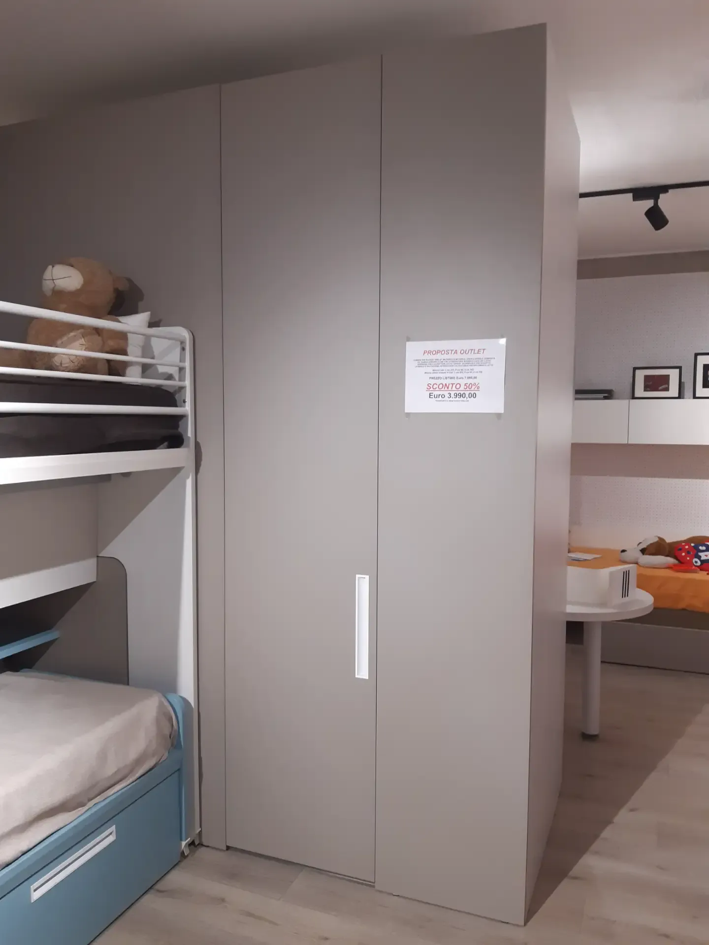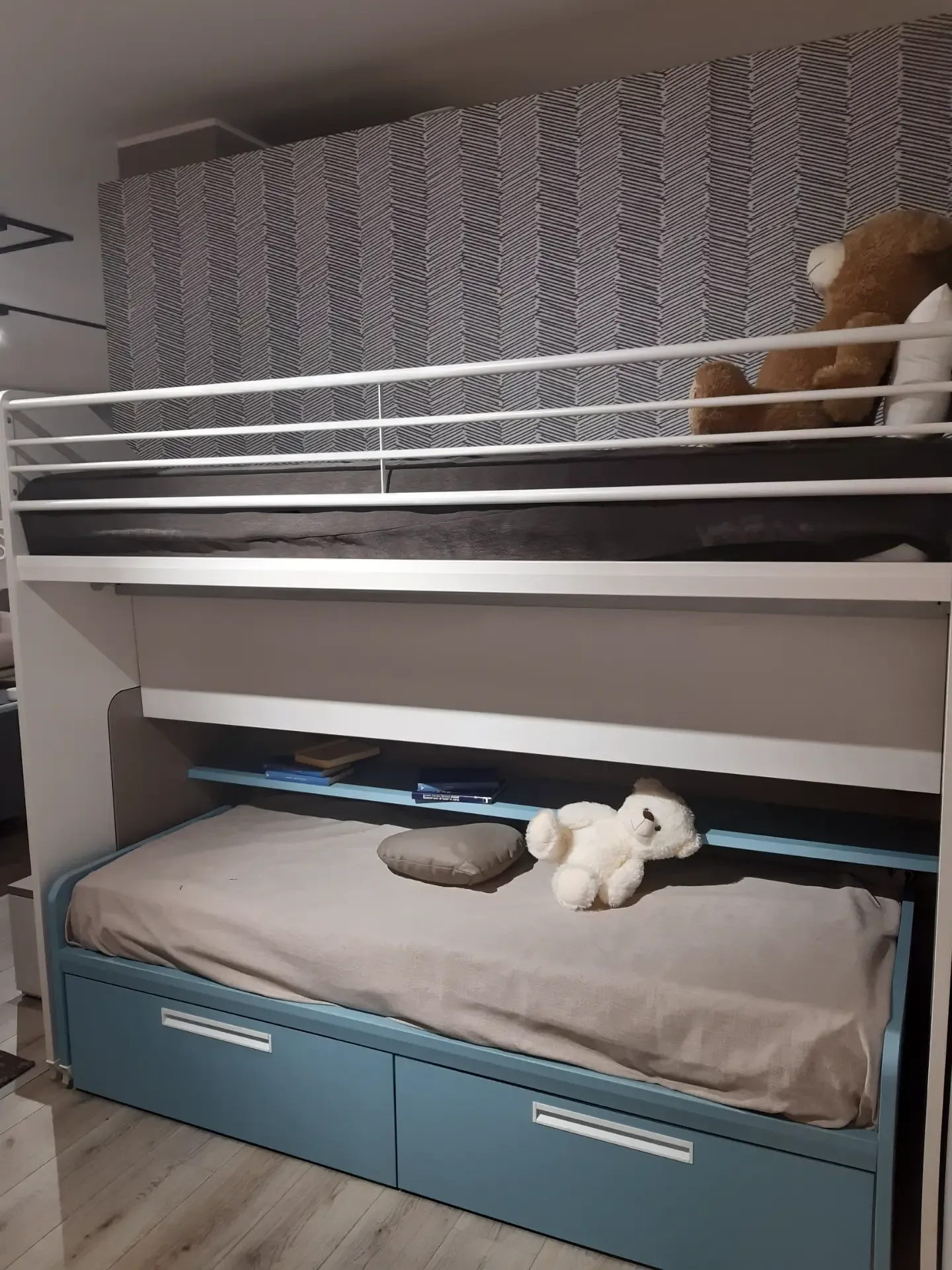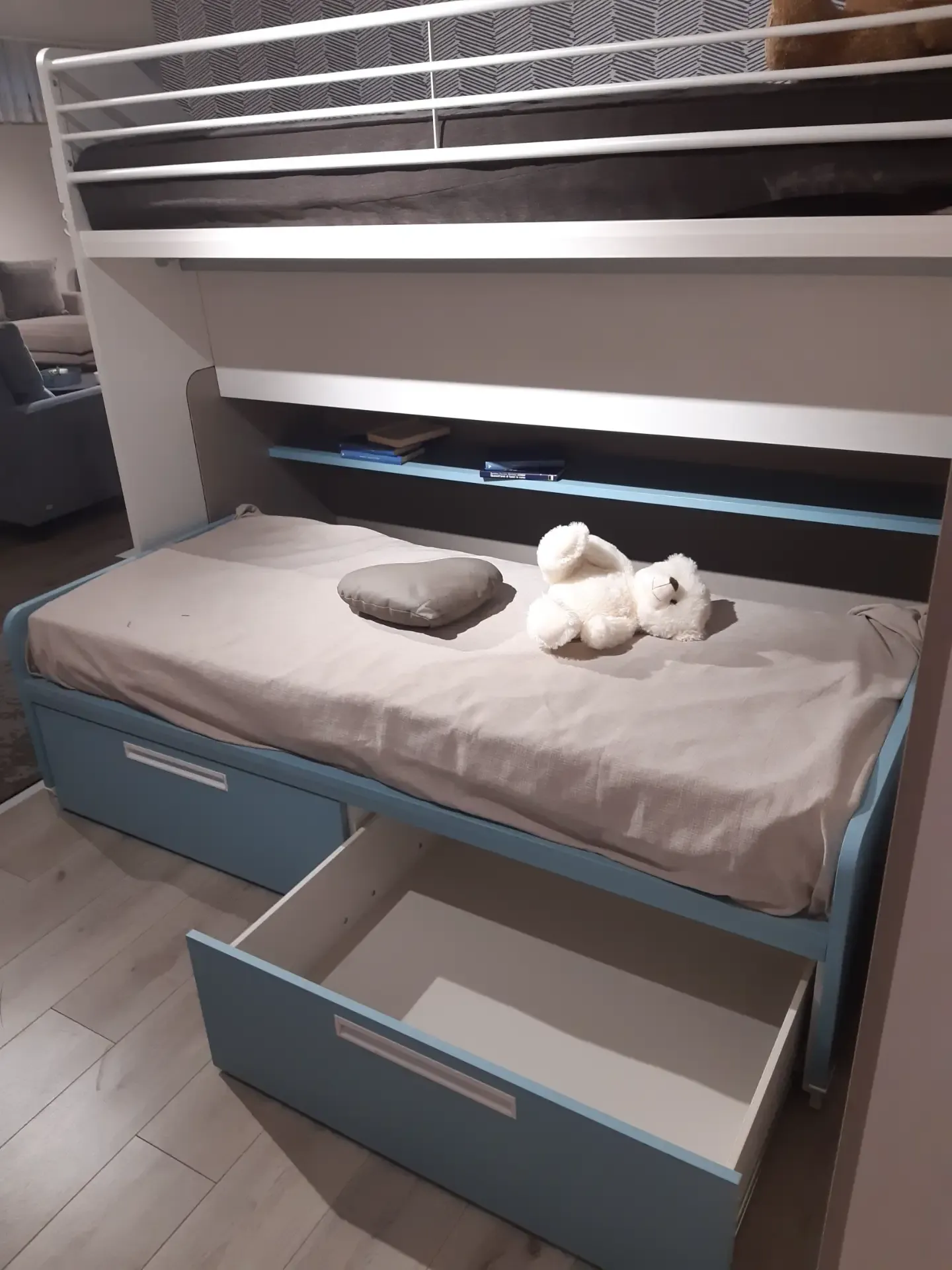 Questa soluzione racchiude in poco spazio molteplici funzioni: il letto Genius estraibile con piattaforma posteriore per il rifacimento facilitato accessibile dalla scala a cassetto laterale; il letto inferiore completo di due pratici e capienti cassettoni; la mensola sotto il letto, utile per riporre libri, lampade oggetti vari; la grande cabina-armadio X-Cab completamente attrezzata internamente con ripiani, tubi appendiabito, luce led, cassettiera. A richiesta, è disponibile anche una zona studio con scrivania, libreria e pensili a giorno (non compresa in questa offerta).