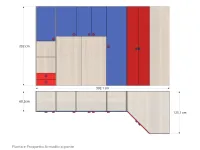 Materiali: Cameretta realizzata in laminato Olmo Chiaro, con dettagli laccati Rosso Papavero e Blu Baltico.