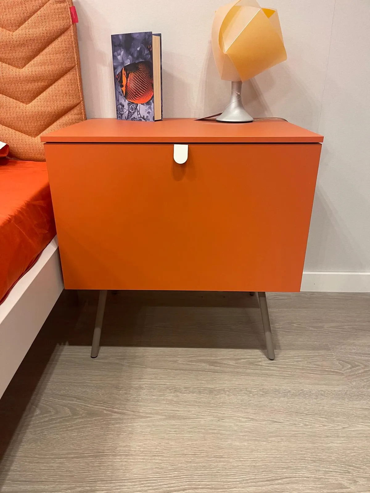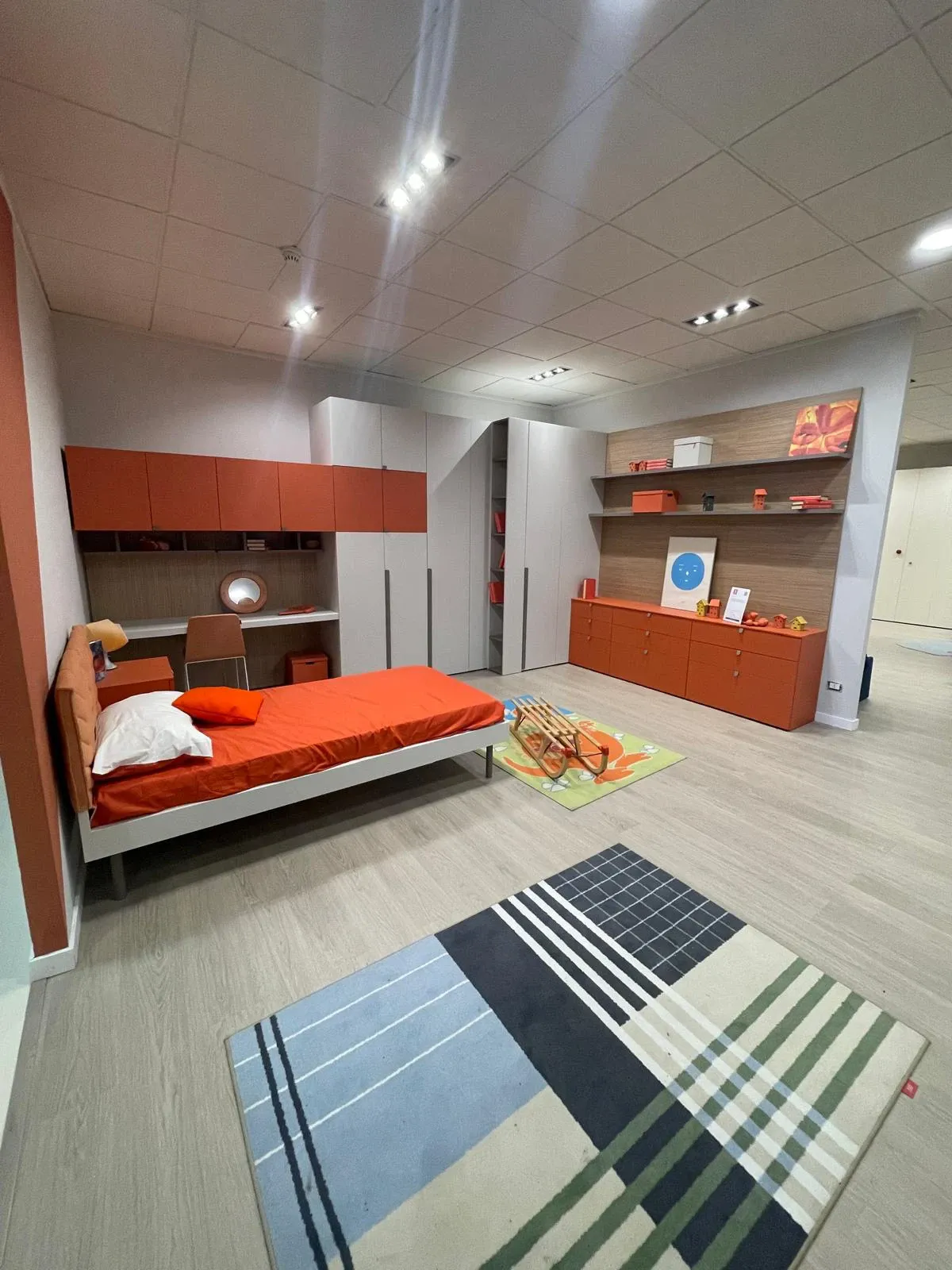 Dal punto di vista estetico, la cameretta è proposta in una combinazione di finiture Nuvola, Papaya, Nocciolo e Basalto, una palette contemporanea che unisce tonalità neutre e accenti più vivaci, creando un ambiente dinamico e piacevole da vivere ogni giorno.