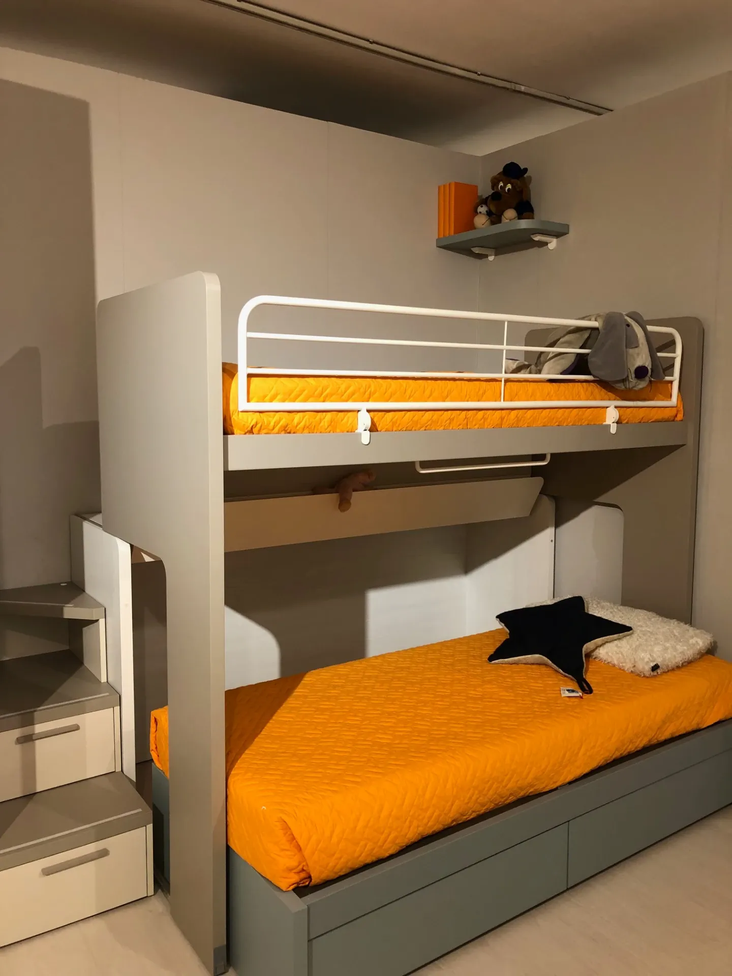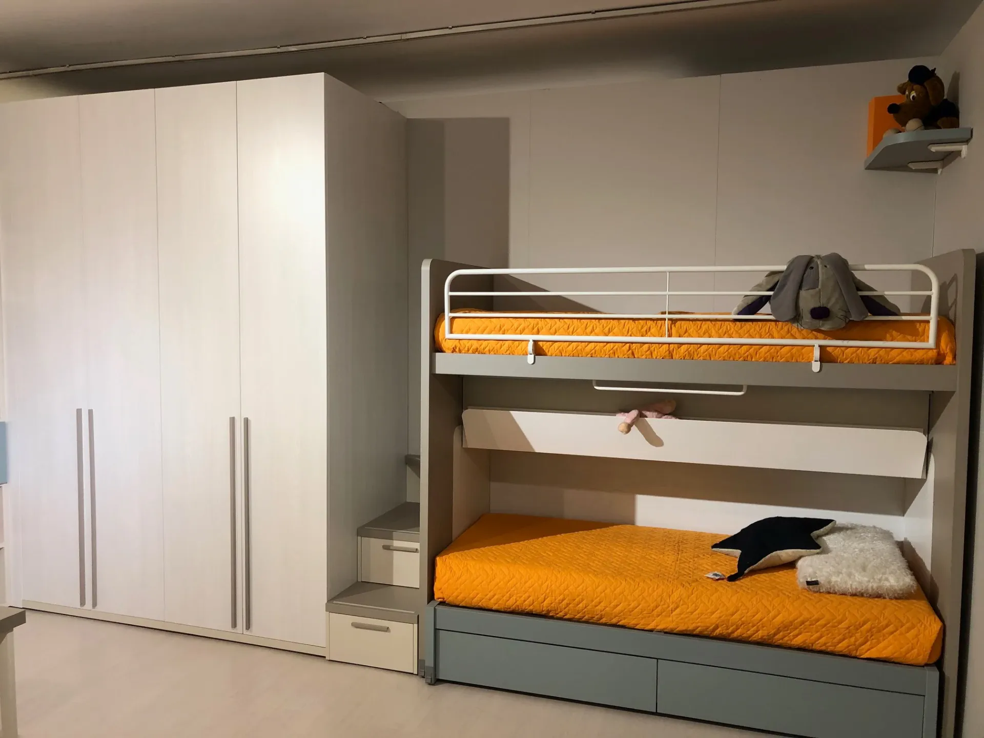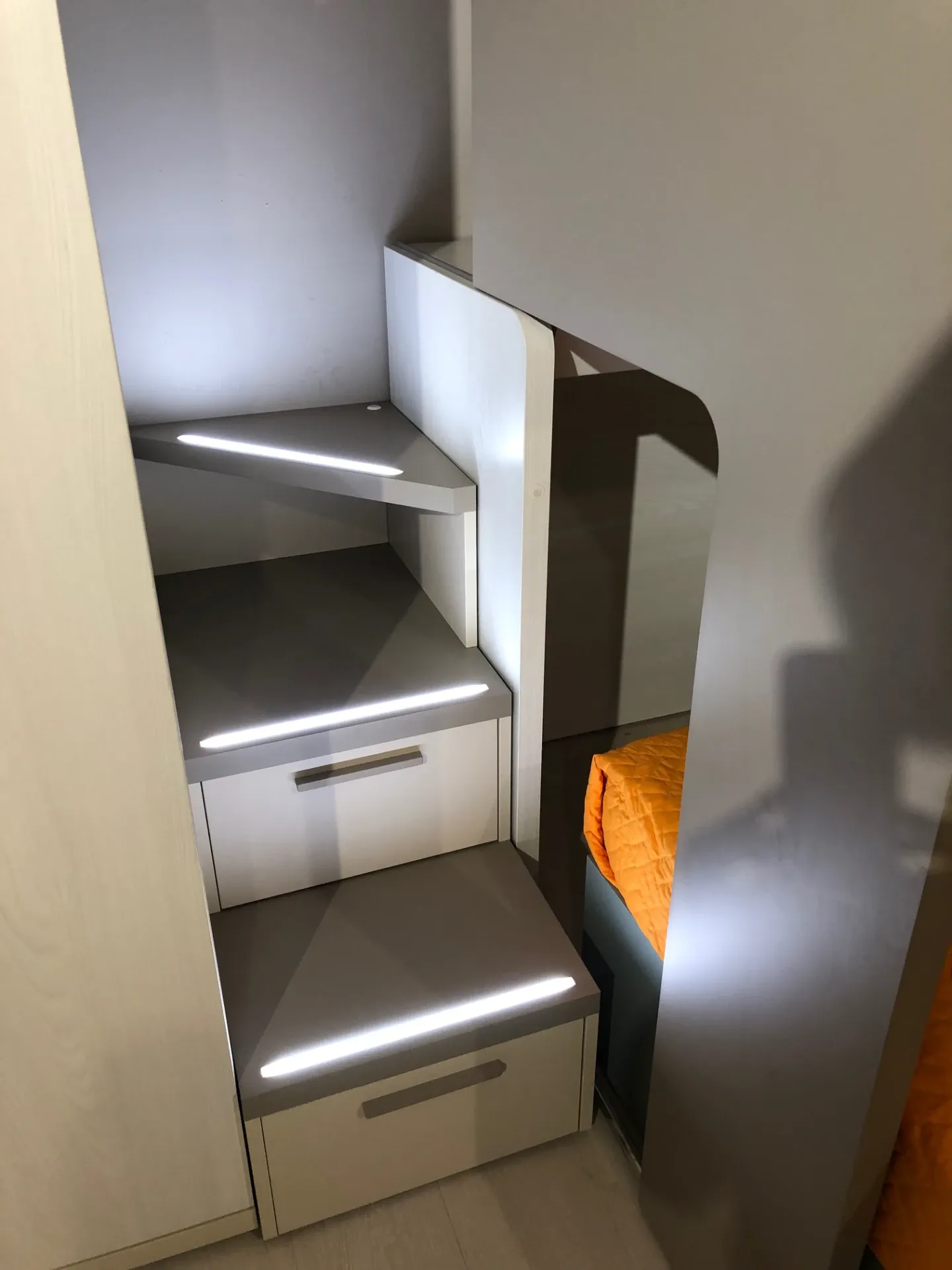 1 LETTO A SOPPALCO MODELLO LUNA SCORREVOLE CON SECONDO LETTO PROVVISTO DI DUE COMODI CASSETTONI; IL LETTO INFERIORE E' TOTALMENTE INDIPENDENTE DA QUELLO SUPERIORE; LA COMODA SALITA CON CASSETTI SI ILLUMINA AL PASSAGGIO POICHE' E' DOTATA DI LUCI LED