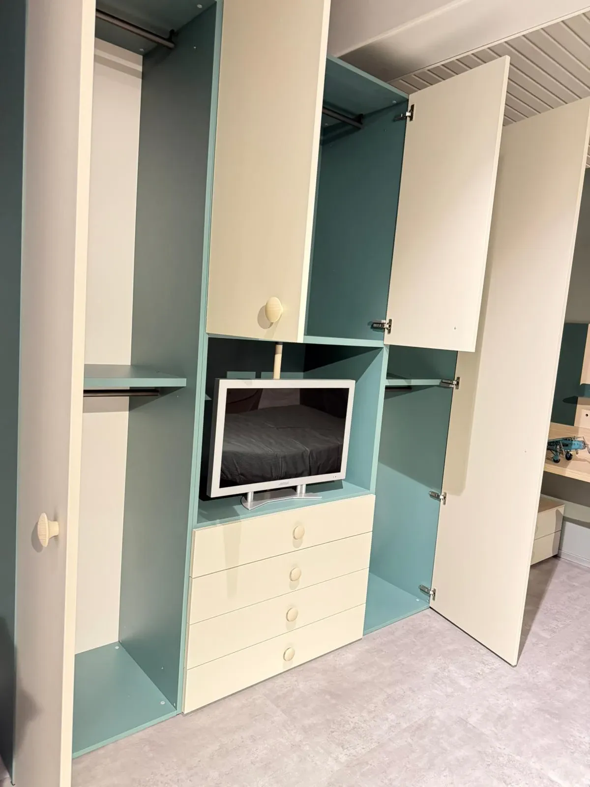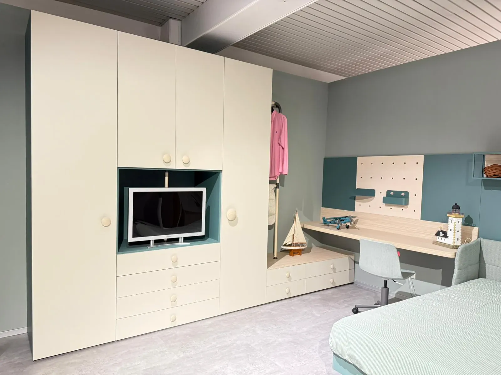 Cameretta con armadio porta TV, scrivania con boiserie.